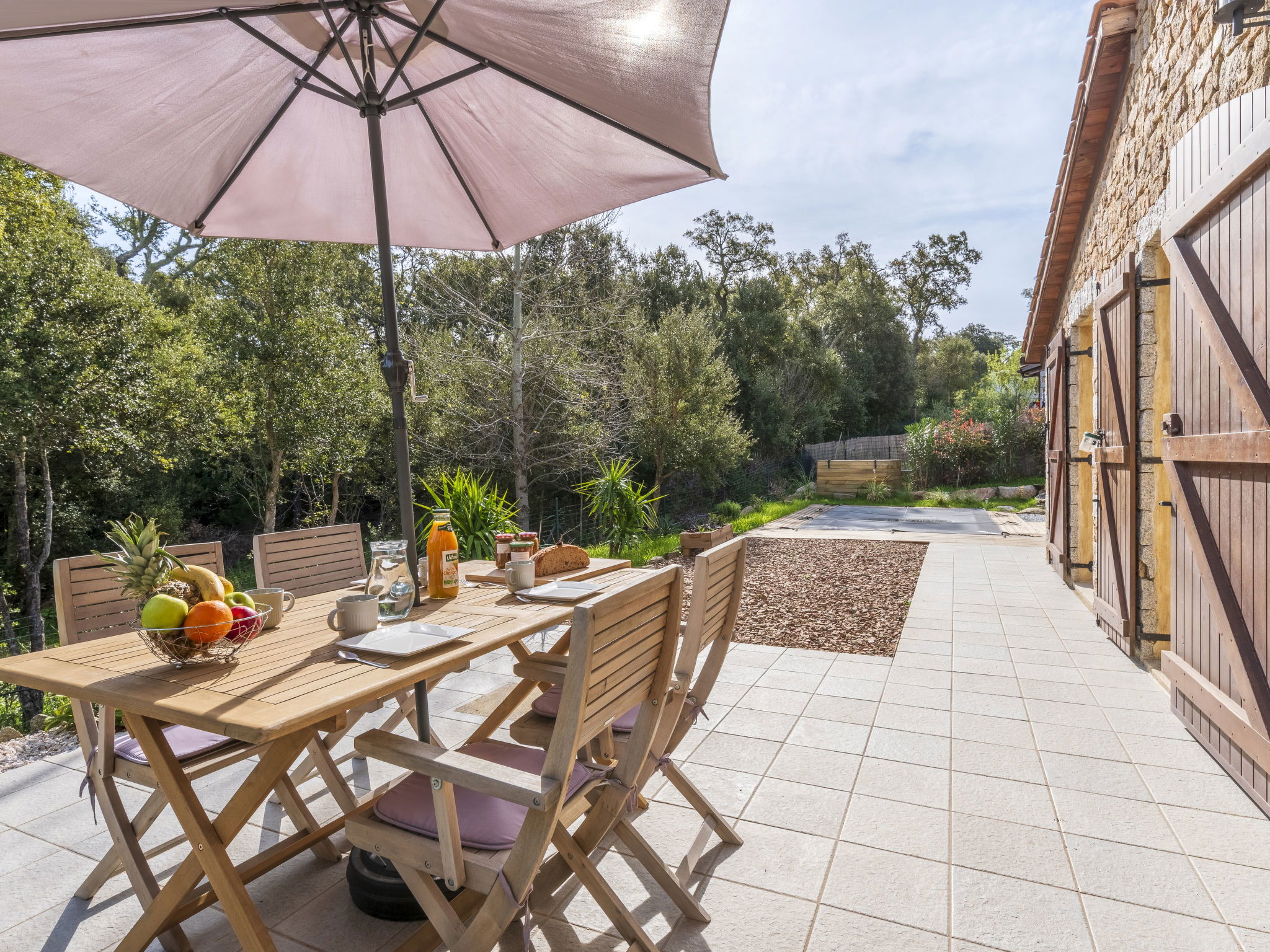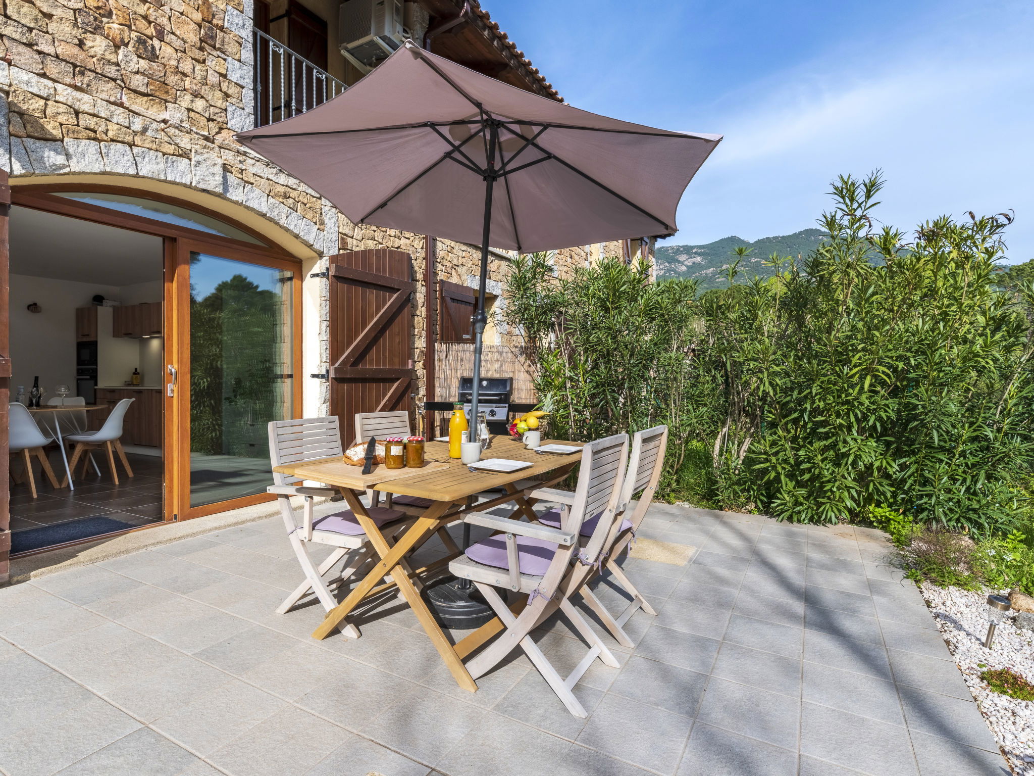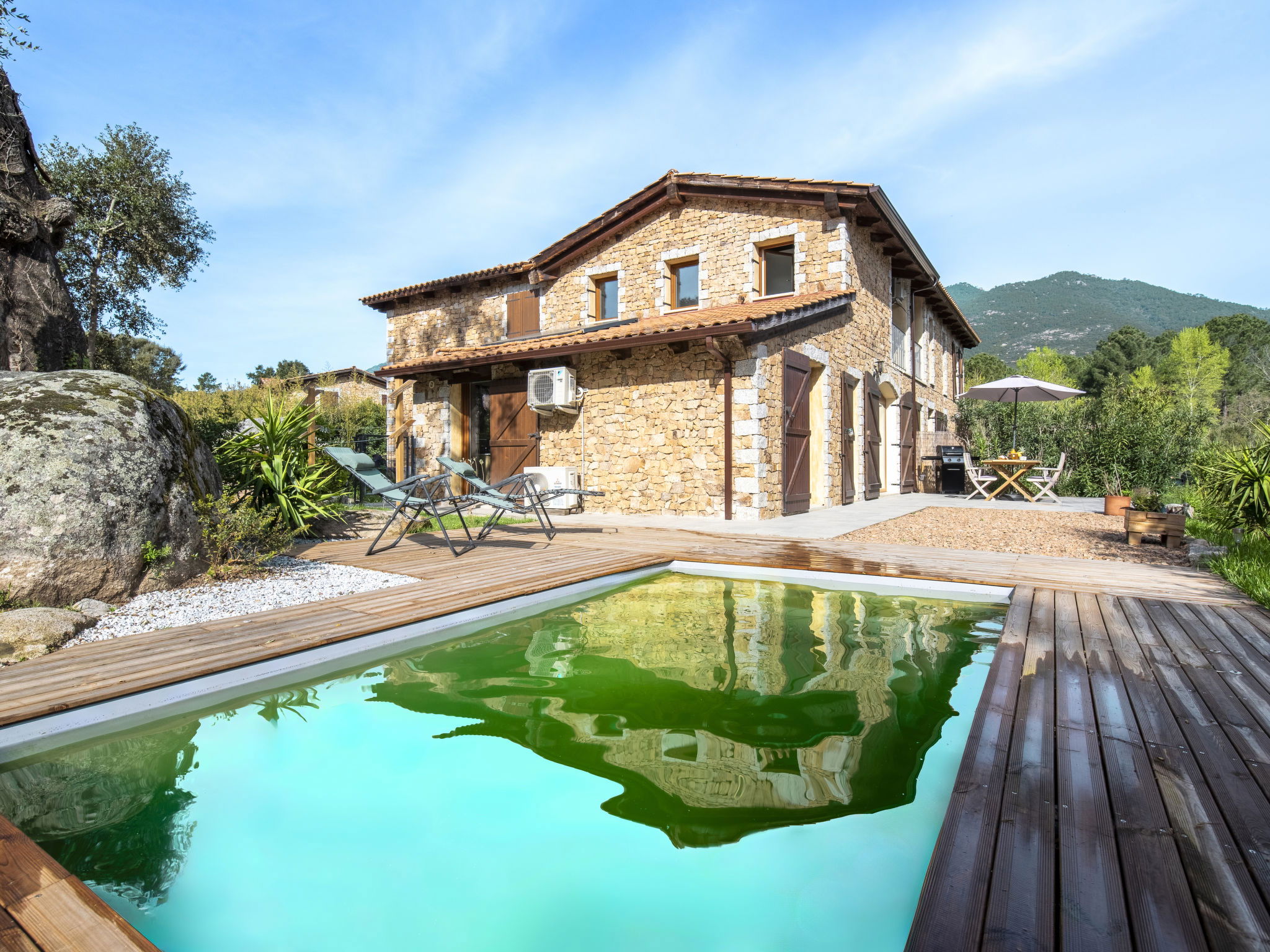 Maison mitoyenne "Casa Mela". Dans le quartier de Mela, dans la localité Porto-Vecchio, situation tranquille, à 10 km de la mer, à 10 km de la plage, dans une impasse. A usage privé: jardin entretenu 270 m2 (clôturé) plantes et fleurs, piscine rectangulaire (4 x 2 m, profondeur 150 - 150 cm, disponibilité saisonnière: 06.Mai. - 06.Oct.). Entretien de la piscine par le propriétaire/jardinier. Place de parking sur le terrain. Magasins 1.3 km, magasin d'alimentation 3 km, restaurant 250 m, arrêt de bus 7.5 km, plage de sable "Plage de Cala Verde" 10 km. Port plaisance 9 km. Attractions à proximité: Centre ville de Porto-Vecchio 9 km, Plage de Cala Verde 10 km, Plage de Palombaggia 17 km, Bonifacio 33 km, Plage de Santa Giulia 14 km. Les lacs connus sont facilement accessibles: Lac de L'Ospedale 27 km. Région de randonnées: Les Aiguilles de Bavella 48 km. Veuillez noter: voiture recommandée. Bien convenant à 4 adultes. Résidence avec portail électrique.