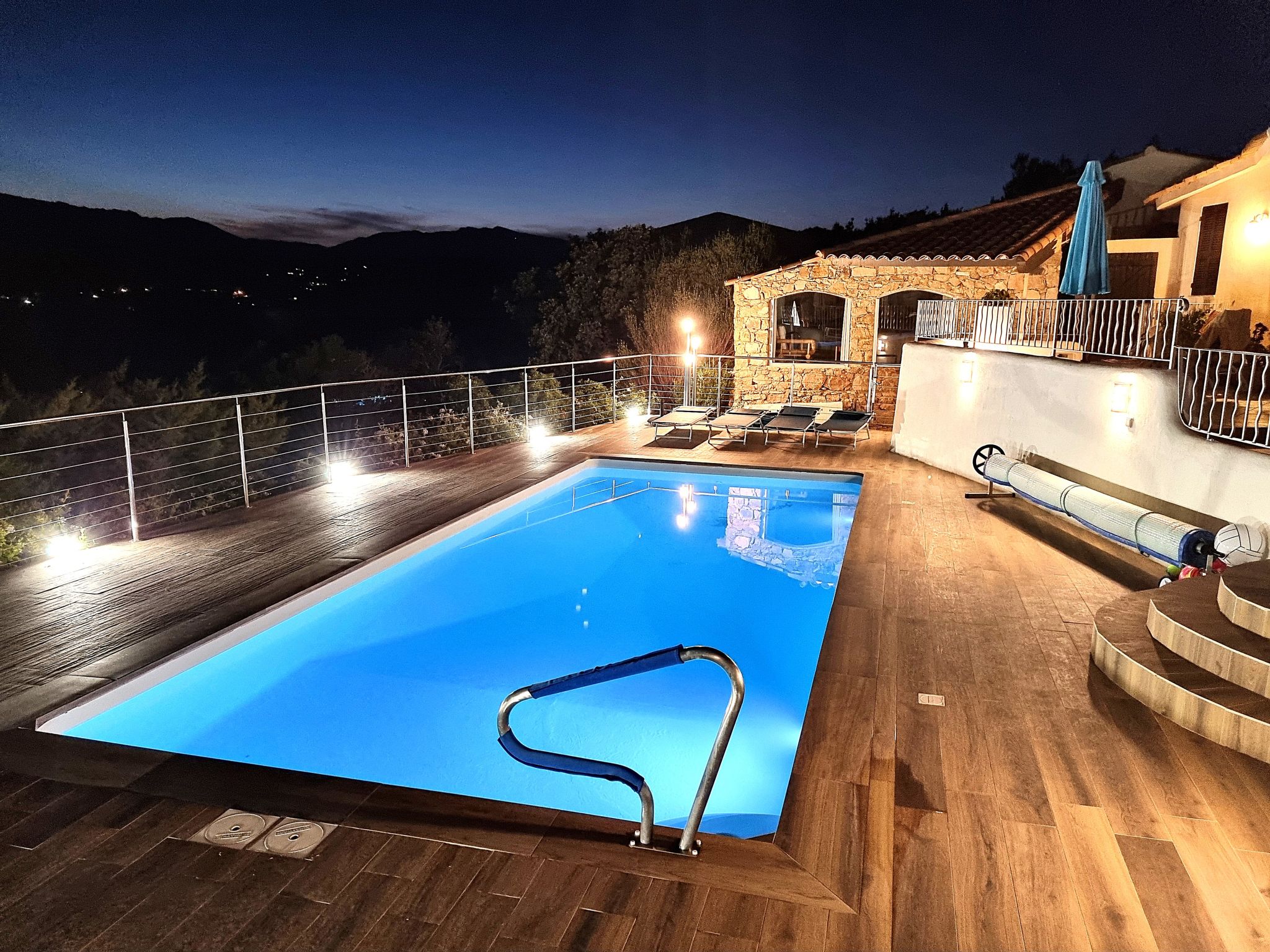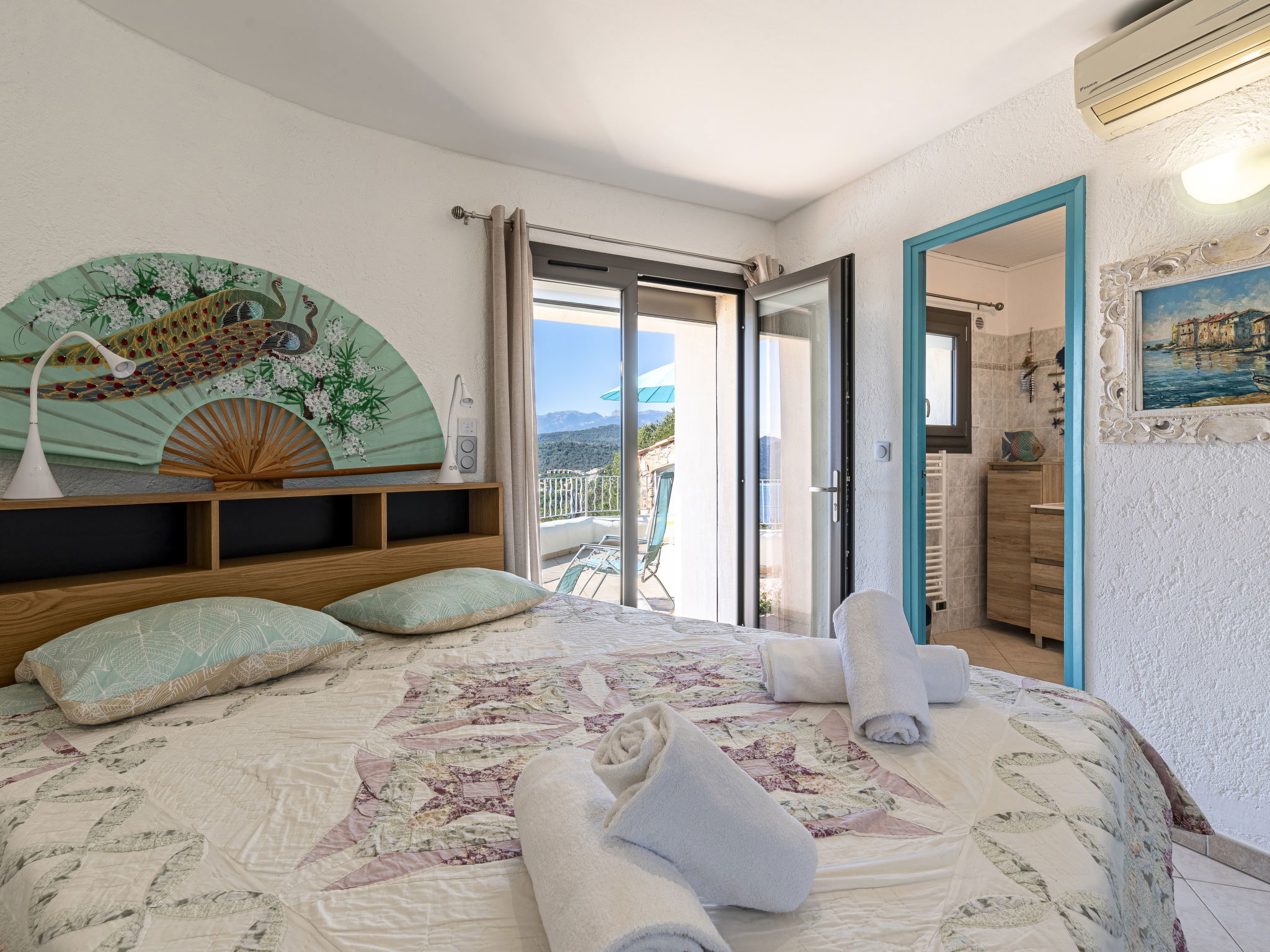 "Villa Sallena", villa 4 pièces 120 m2 sur 2 niveaux. Séjour/salle à manger 40 m2 avec baie vitrée. Sortie sur la terrasse, sur la piscine. 1 chambre avec 1 divan-lit (140 cm, longueur 190 cm), 1 grand-lit (160 cm, longueur 200 cm), douche/WC. Sortie sur la terrasse. 1 grande chambre avec 1 divan-lit et 1 grand-lit (160 cm, longueur 200 cm), douche/WC. Sortie sur la terrasse, sur la piscine. Cuisine 12 m2 (four, lave-vaisselle, 3 plaques à induction, grille-pain, bouilloire électrique, micro-ondes, congélateur, cafetière électrique, Capsules pour machine à café (Tassimo) (NON INCLUSES)). Douche, WC séparé. Chauffage électrique, air-conditionné. À l'étage supérieur: 1 chambre avec 1 lit double (140 cm, longueur 190 cm). Grande terrasse 70 m2, terrasse 30 m2 partiellement couverte. Meubles de terrasse, barbecue électrique, chaises longues. Superbe vue sur la mer et les montagnes. A disposition: lave-linge, fer à repasser, sèche-cheveux. Internet (Connexion WIFI, gratuit). Veuillez noter: maison non-fumeur. Maximum 1 animal/ chien autorisé. Détecteur de fumée. Annonce d'un particulier (art 155, IV du CGI). 2A247000219BD