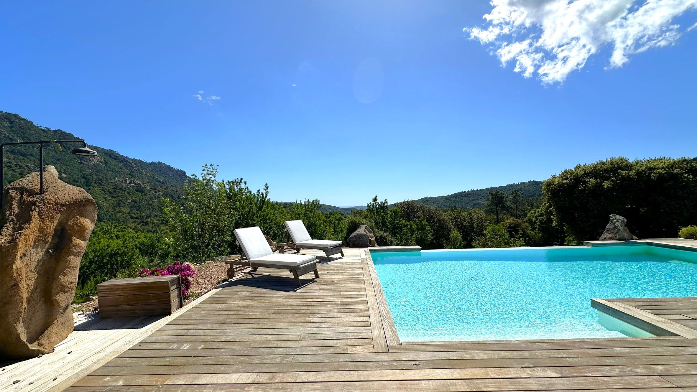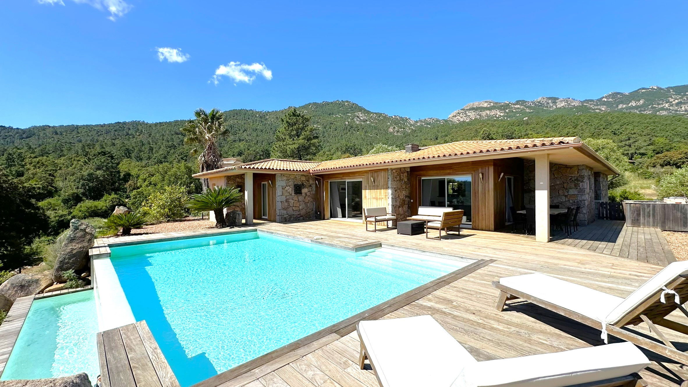 Villa de caractère en pierre et bois de 170 m² pouvant accueillir 8 personnes, située à quelques kilomètres des piscines naturelles du Cavu et de la belle plage de Pinarello.