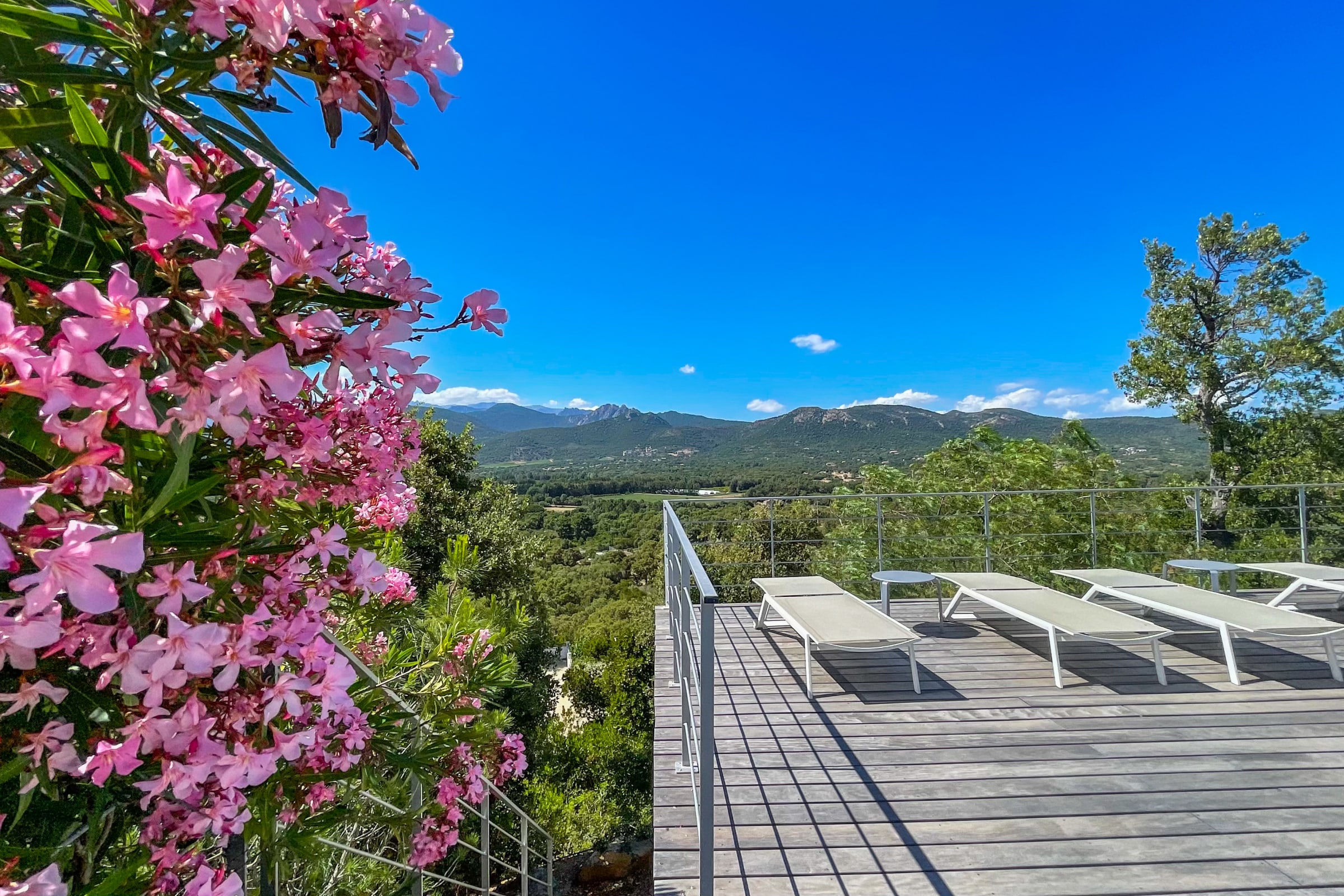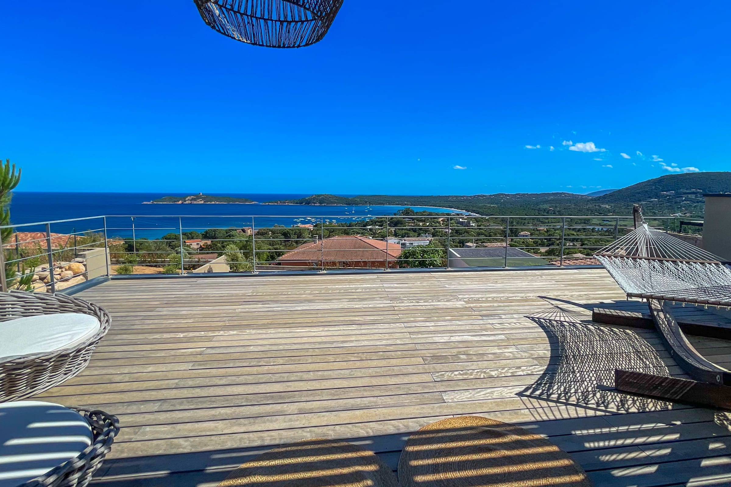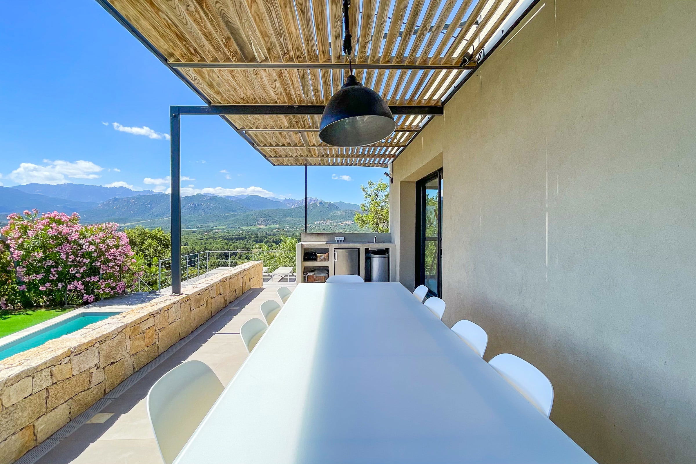 La terrasse est très bien aménagée avec un salon extérieur face à la mer et un coin repas ombragée avec vue mer et montagne.