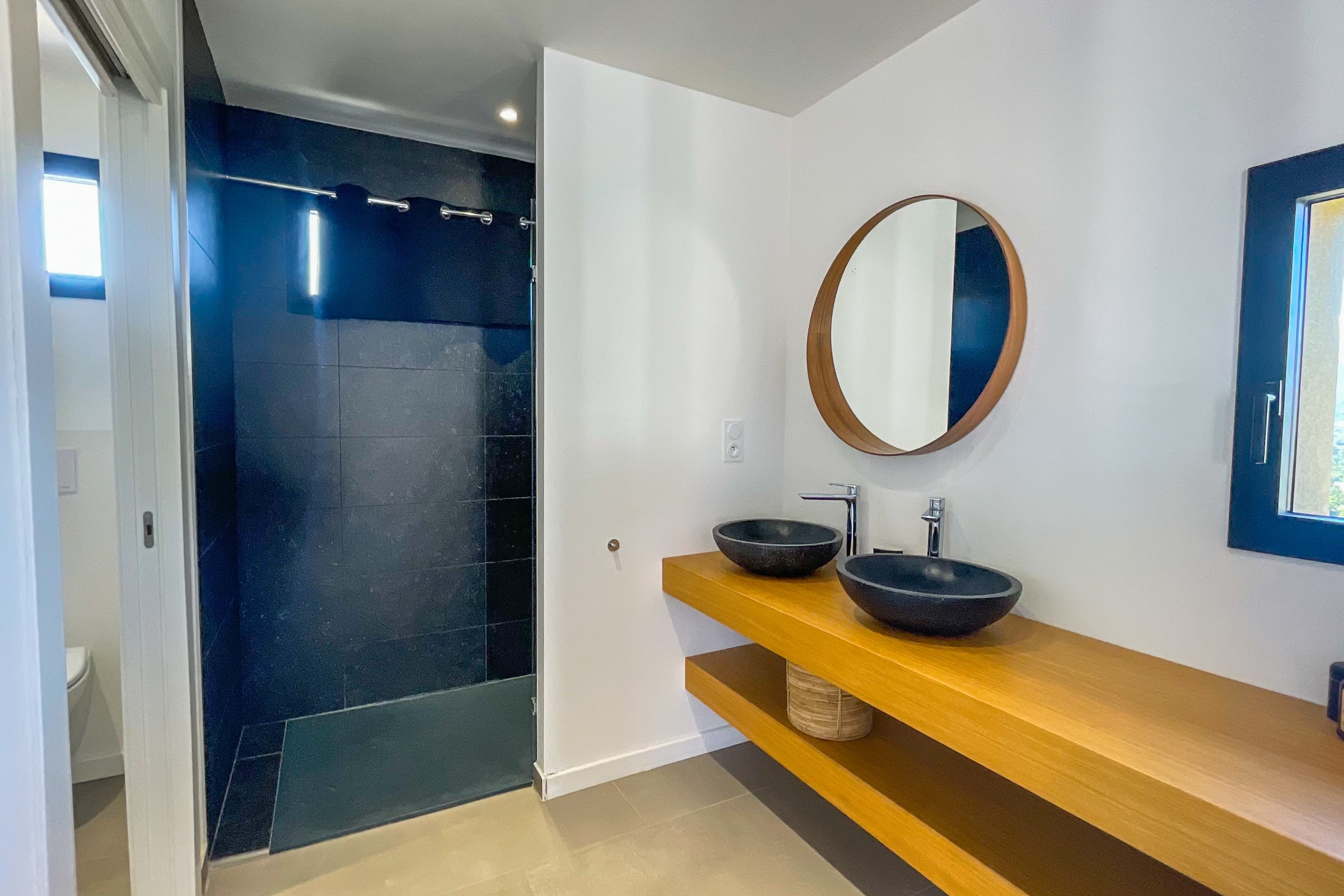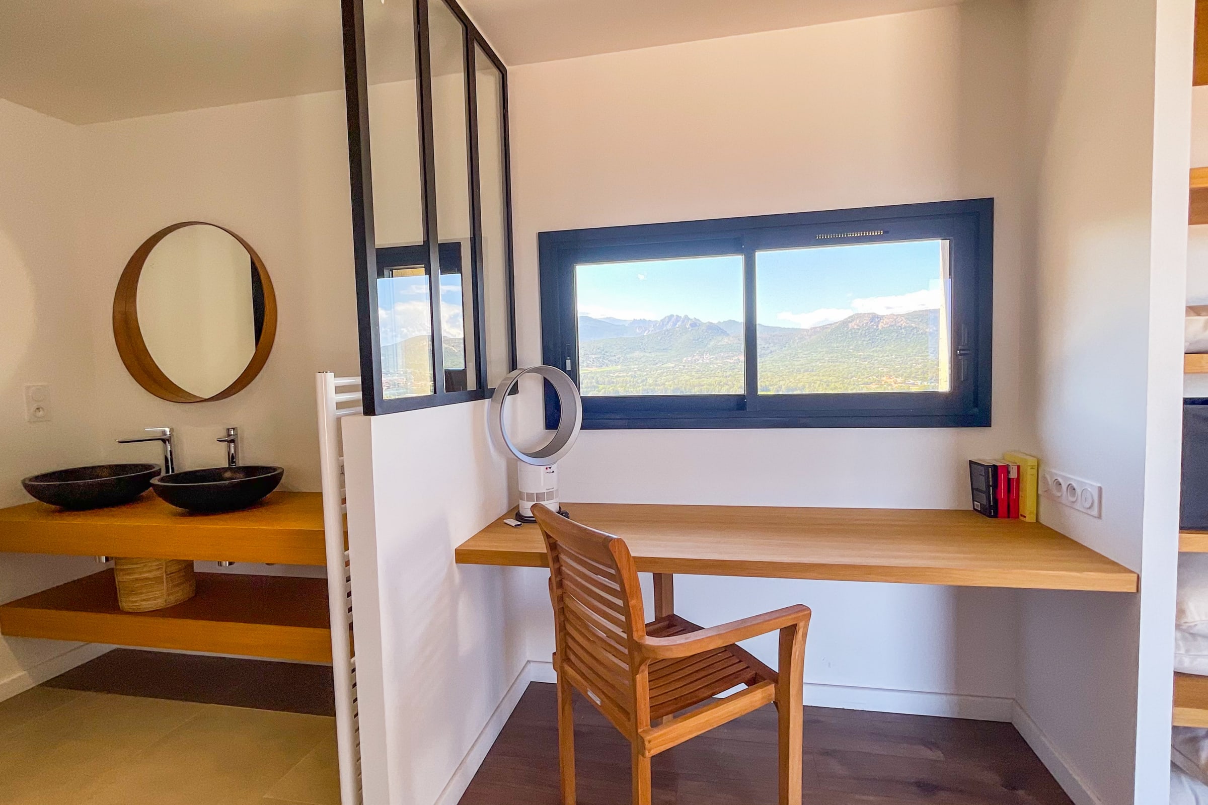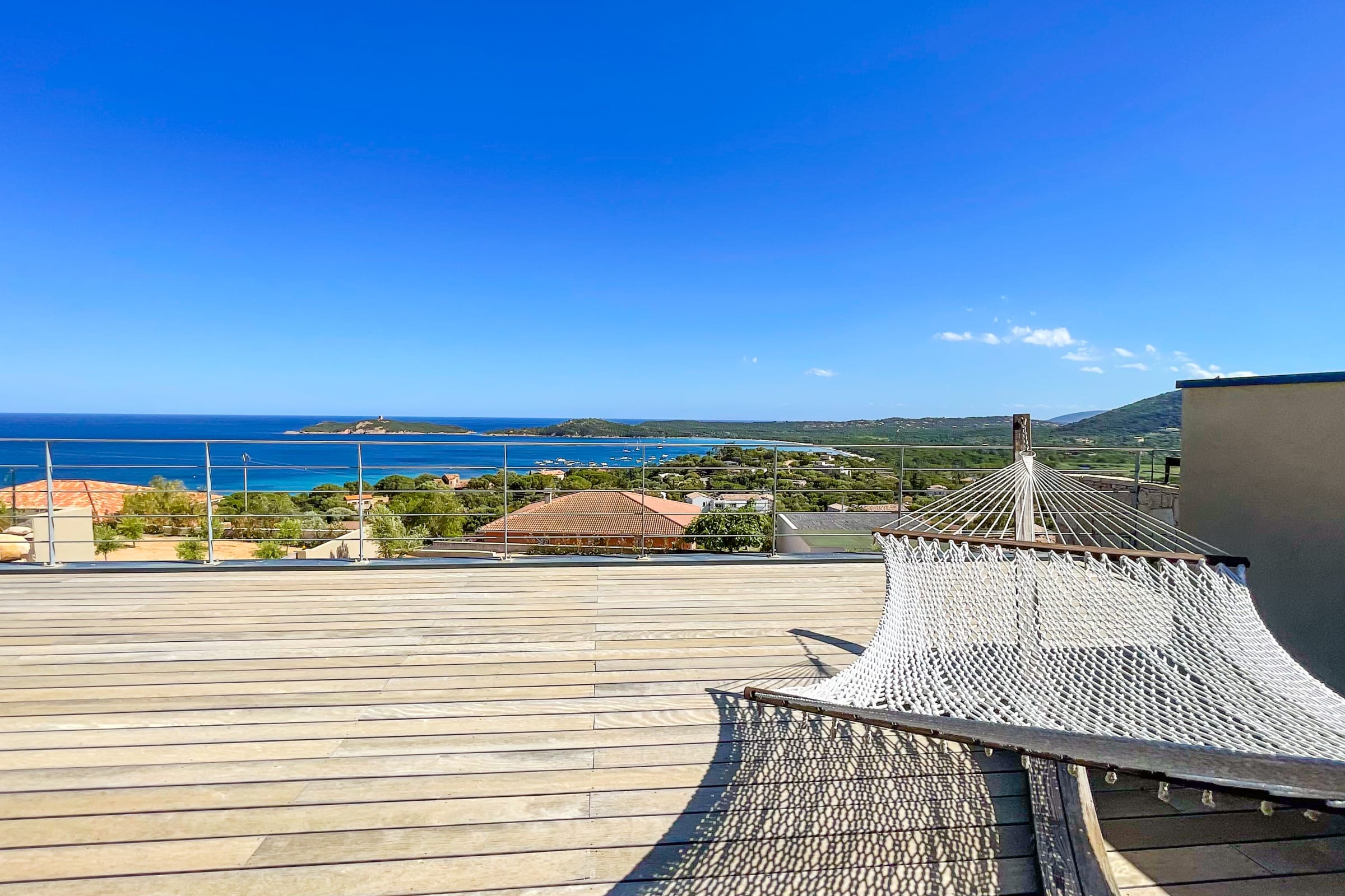 La terrasse est très bien aménagée avec un salon extérieur face à la mer et un coin repas ombragée avec vue mer et montagne.