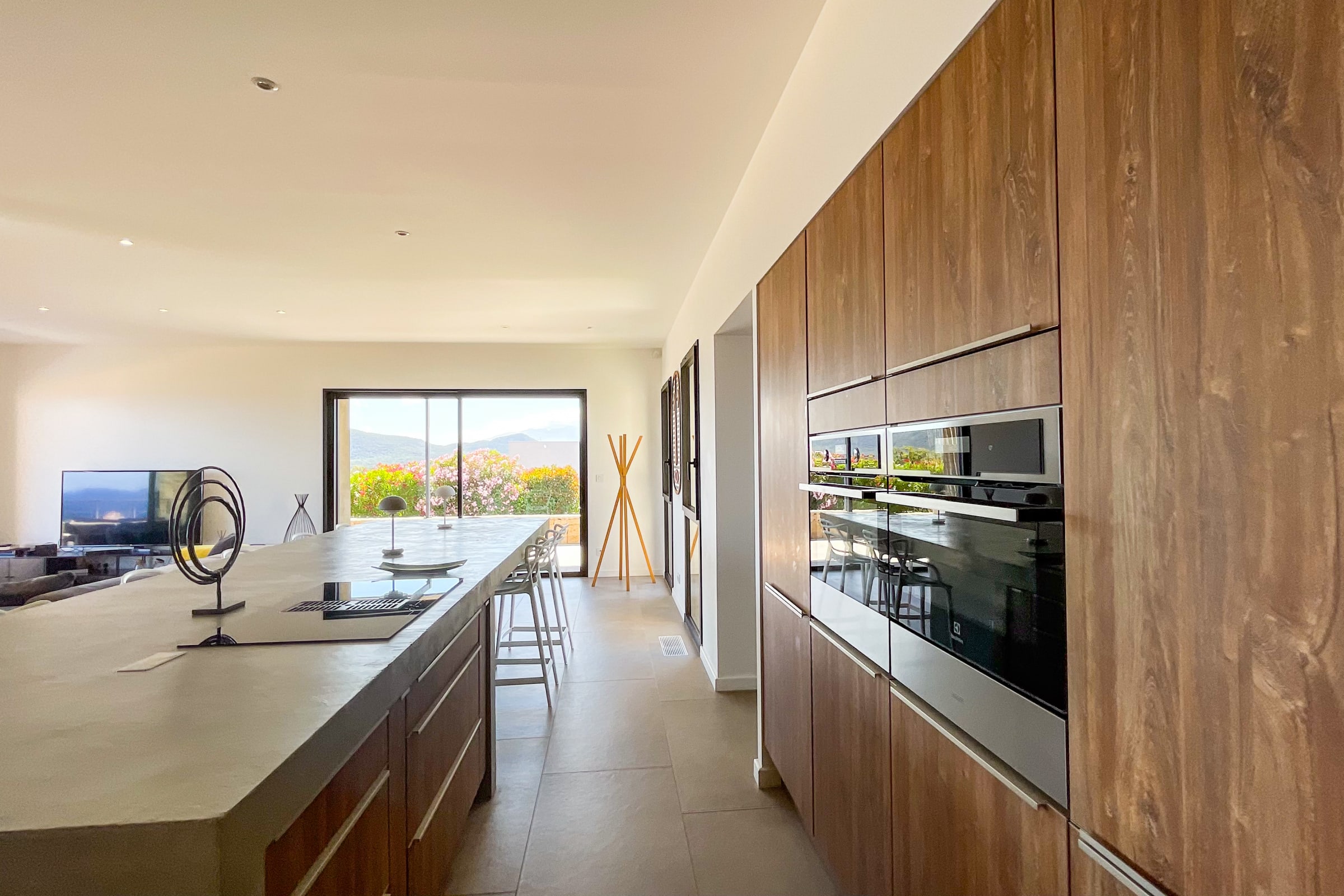 Très belle cuisine ouverte entièrement équipée avec un bel îlot central en béton ciré.