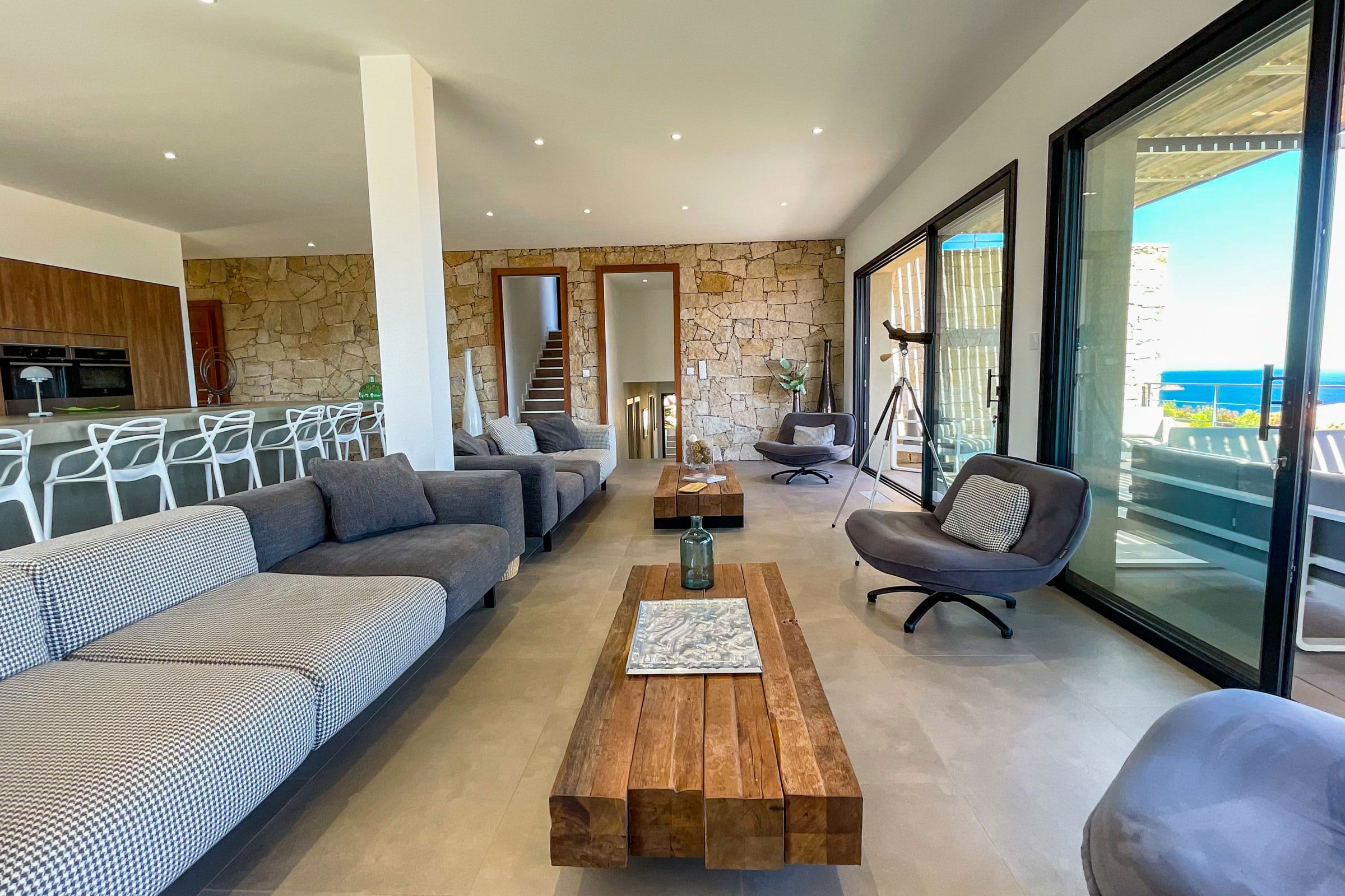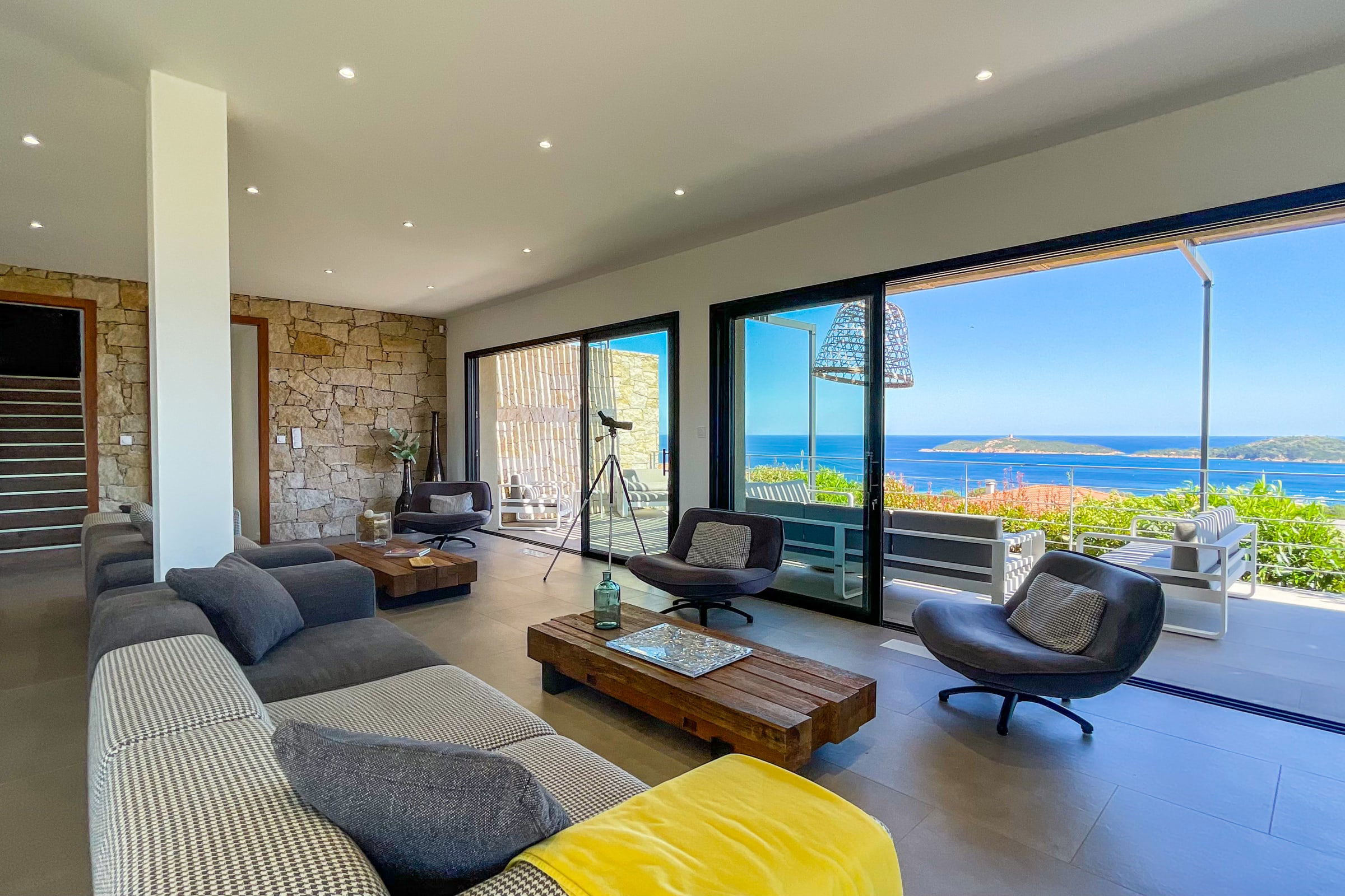 Salon lumineux avec une splendide vue mer sur la tour génoise de Pinarello.