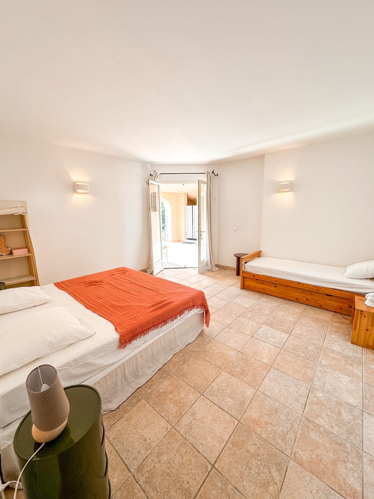- Une grande chambre modulable ( deux lits 90*200 avec possibilité de les rapprocher pour former un lit King Size ) et un lit simple avec tiroir offrant deux lits 80*190, un coin canapé et avec accès au jardin pour plus d'indépendance.