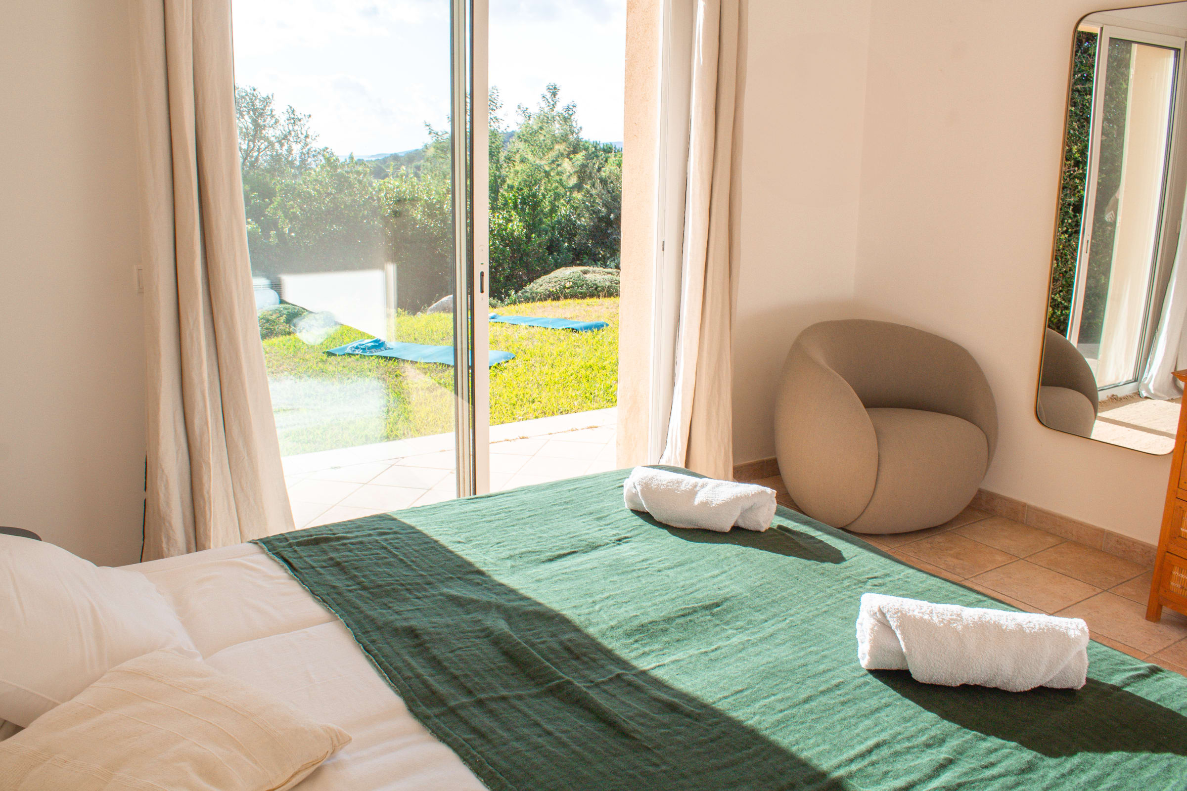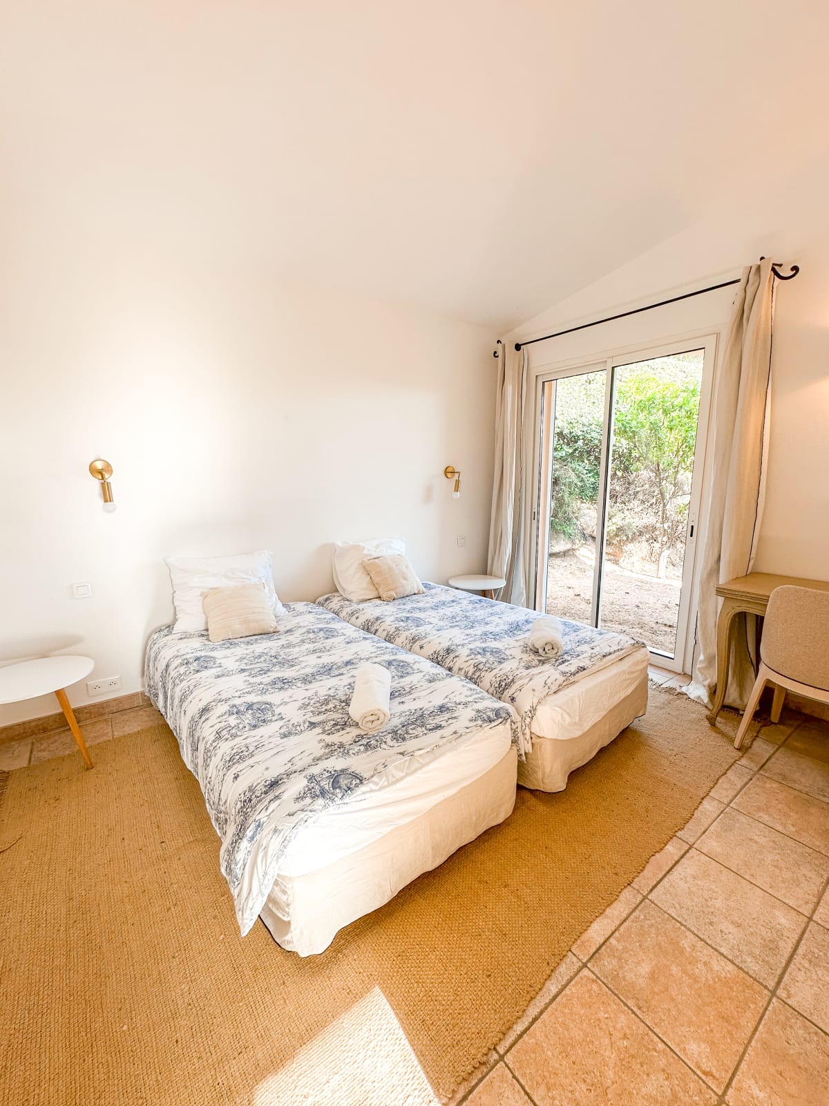 - Une chambre ( deux lits 90*200 avec possibilité de les rapprocher pour former un lit King Size ) avec vue mer et accès jardin, et possibilité d'ajouter un vrai lit d'enfant à barreaux.