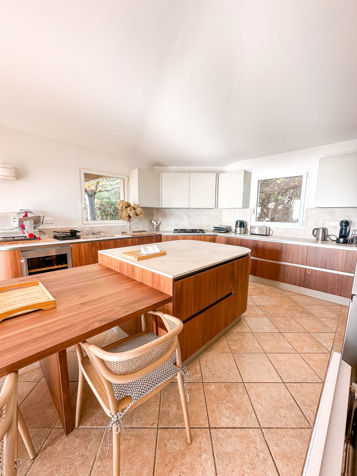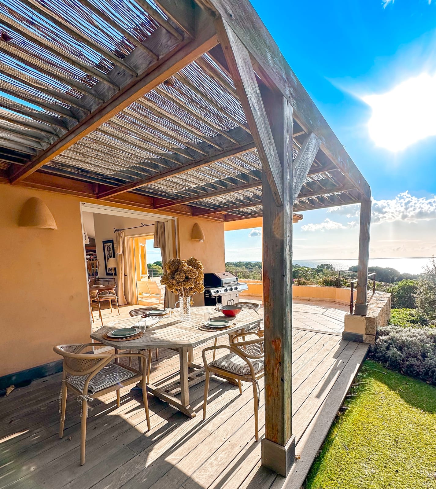 D'une cuisine ouverte entièrement équipée donnant sur une salle à manger avec accès à une belle terrasse, garnie d'un salon d'extérieur à l'abris du soleil, idéal pour contempler la vue et deviner au loin la Sardaigne et donne également accès à un joli coin repas extérieur ombragé et d’un barbecue.