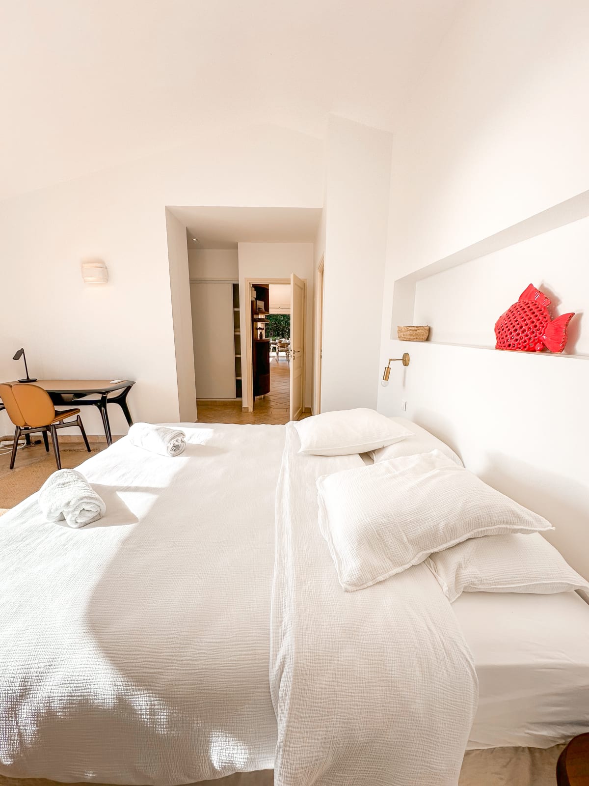 - Une chambre ( deux lits 90*200 avec possibilité de les rapprocher pour former un lit King Size ) avec accès jardin, bureau et penderie.
