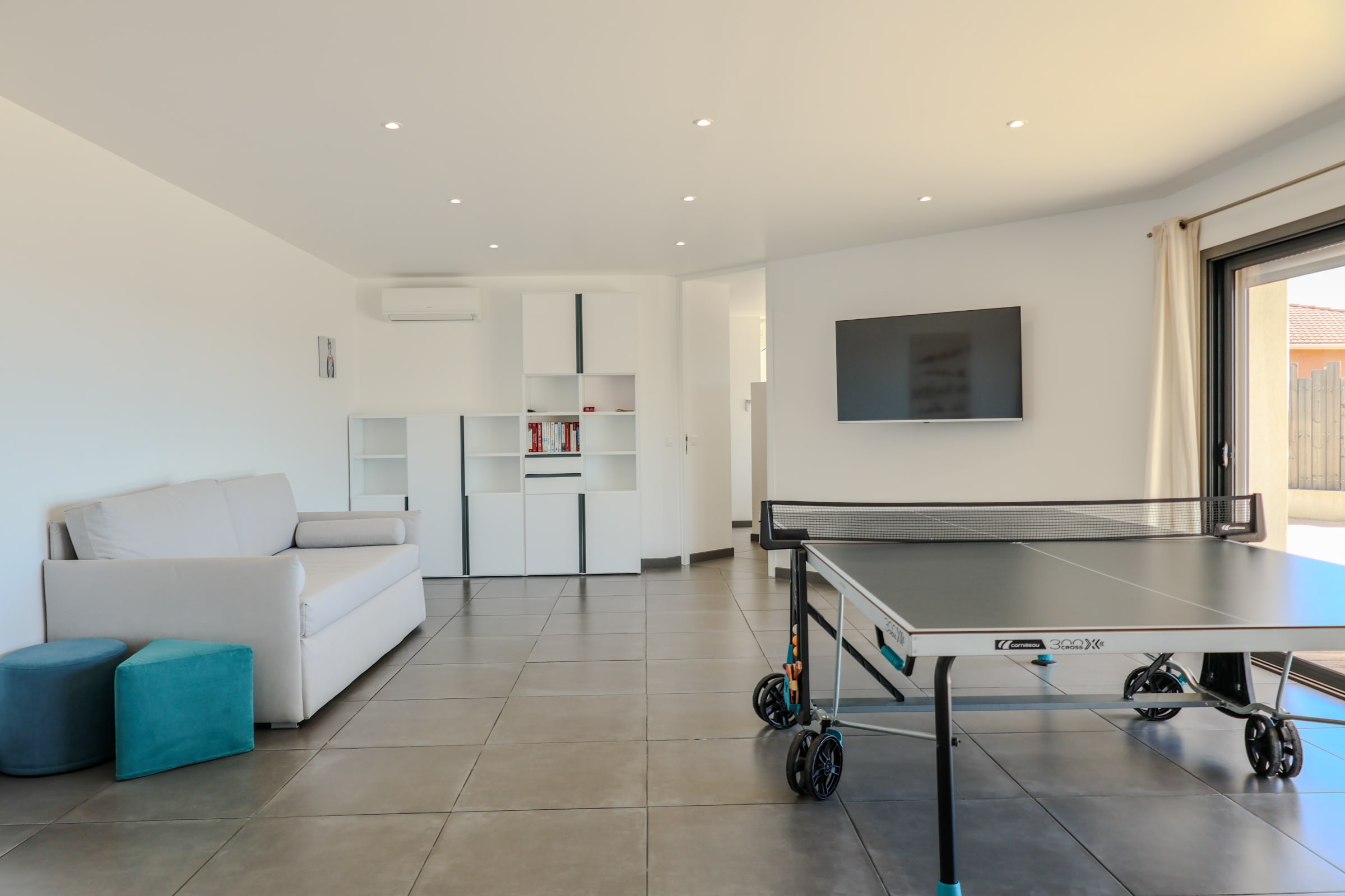 Une salle de jeux avec baby-foot, jeux de société, livres, etc. avec deux lits gigognes 90*180cm. Idéal pour des enfants.