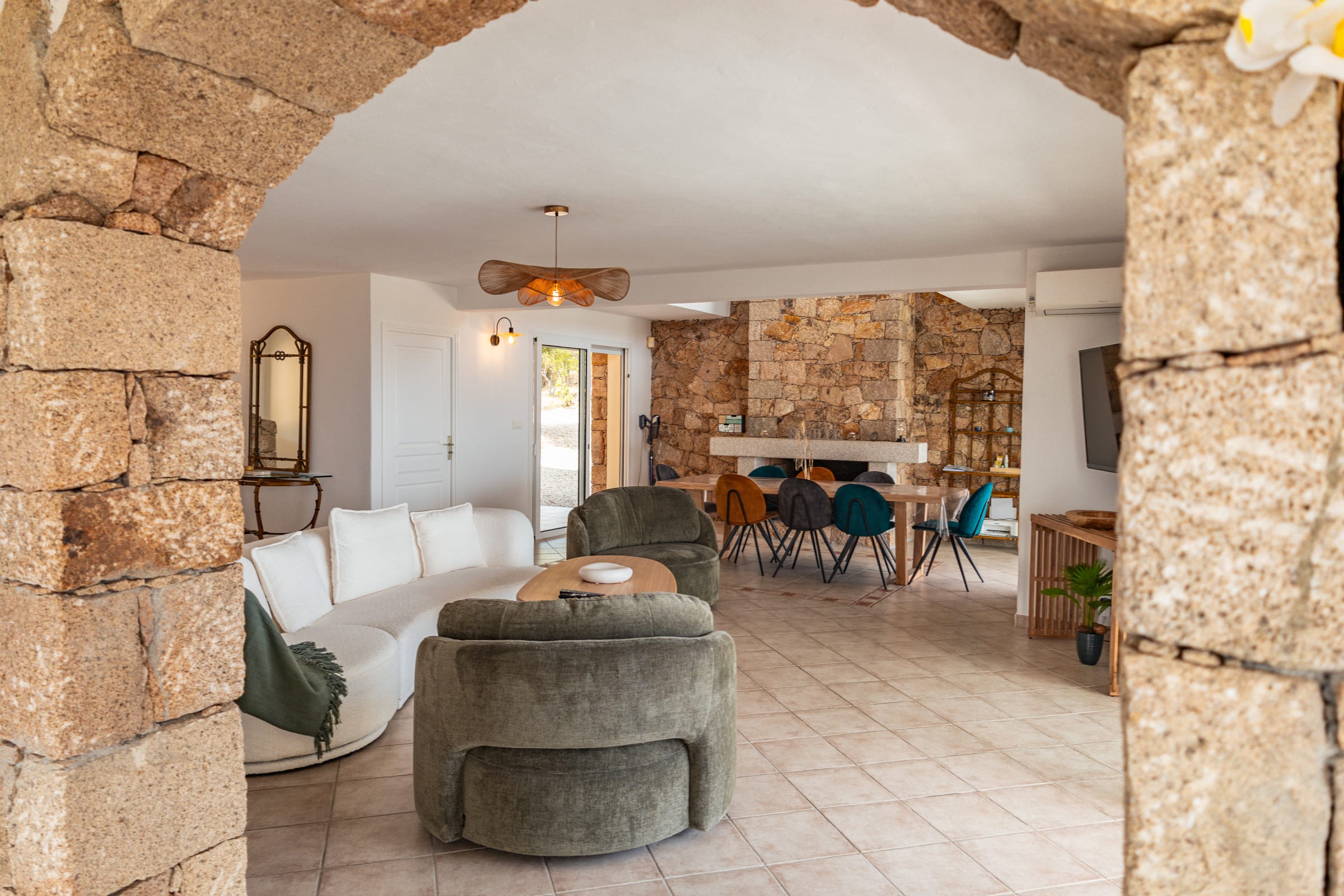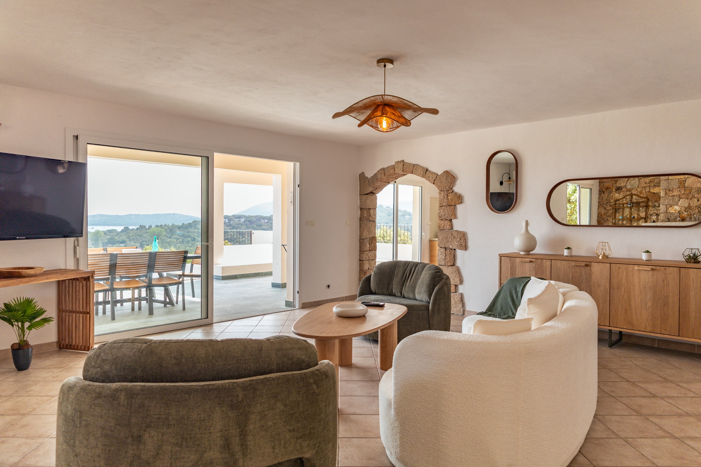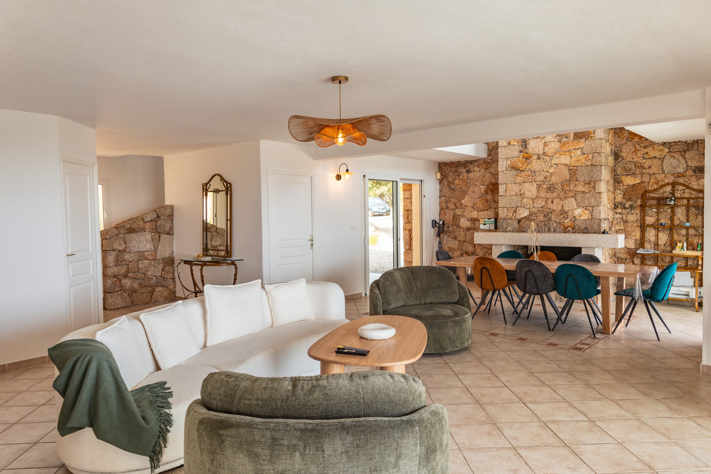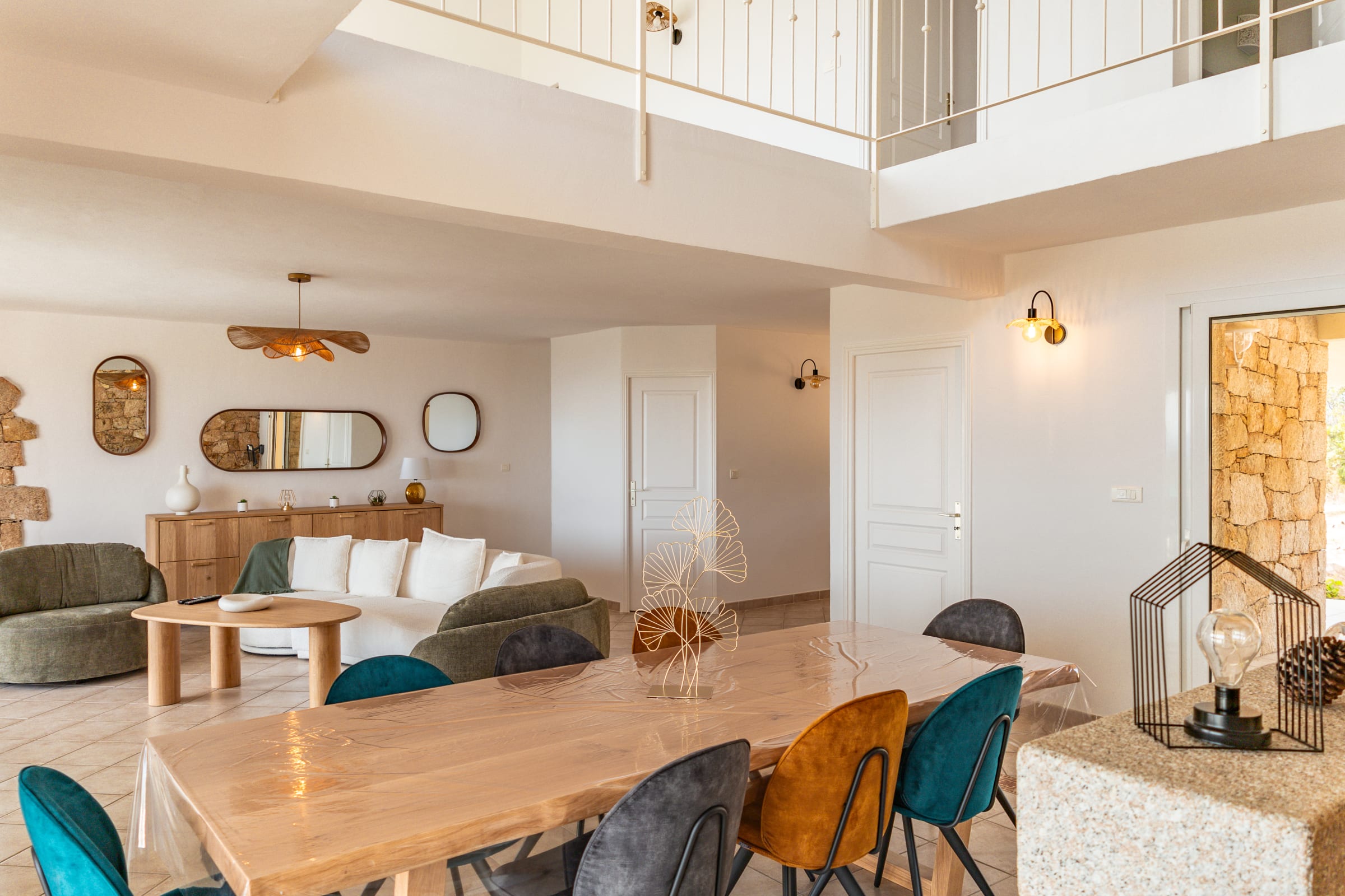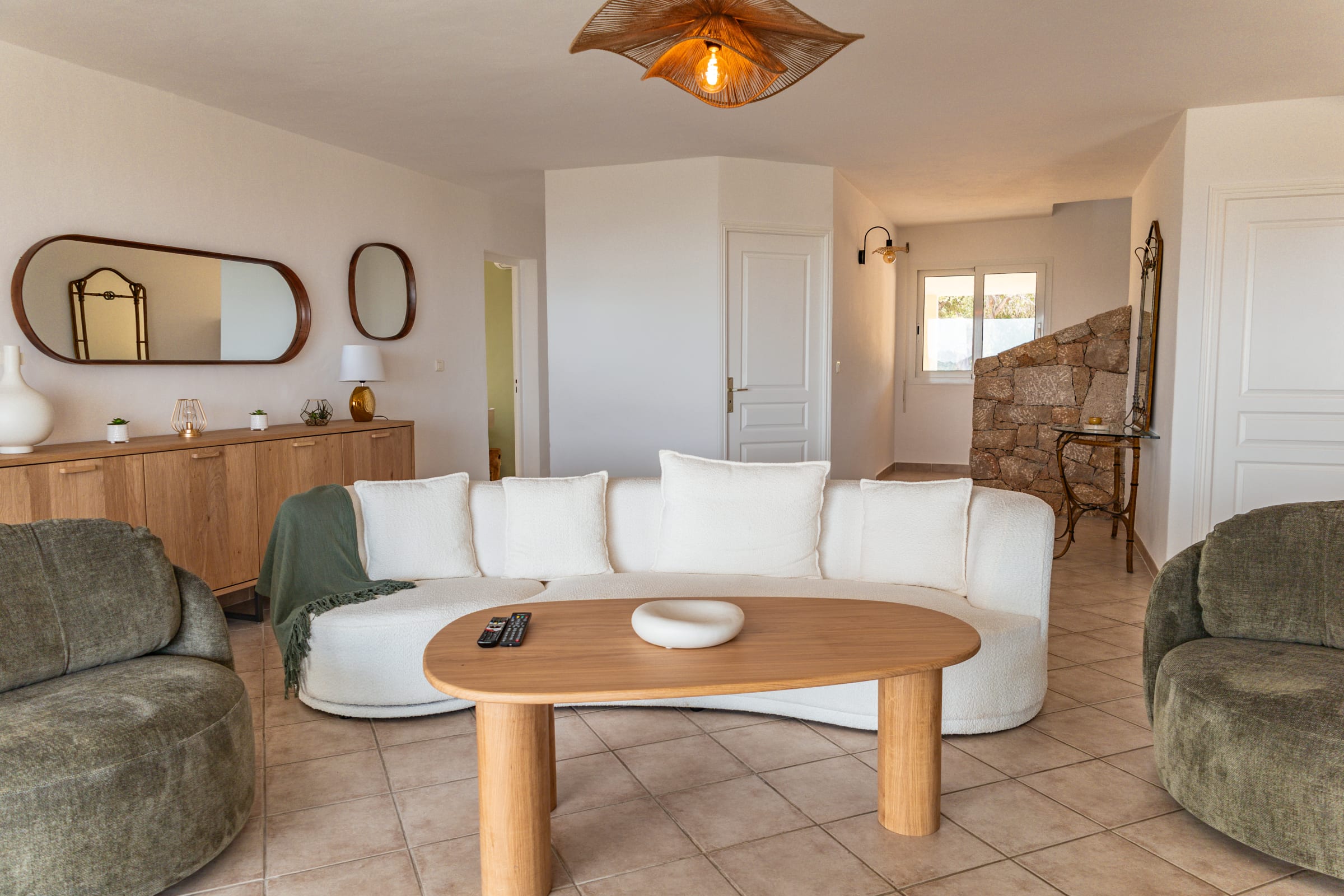 La villa offre une vue imprenable sur la mer et la tour génoise de Pinarello. Les espaces de vie, baignés de lumière, sont tous orientés vers ce panorama exceptionnel.
