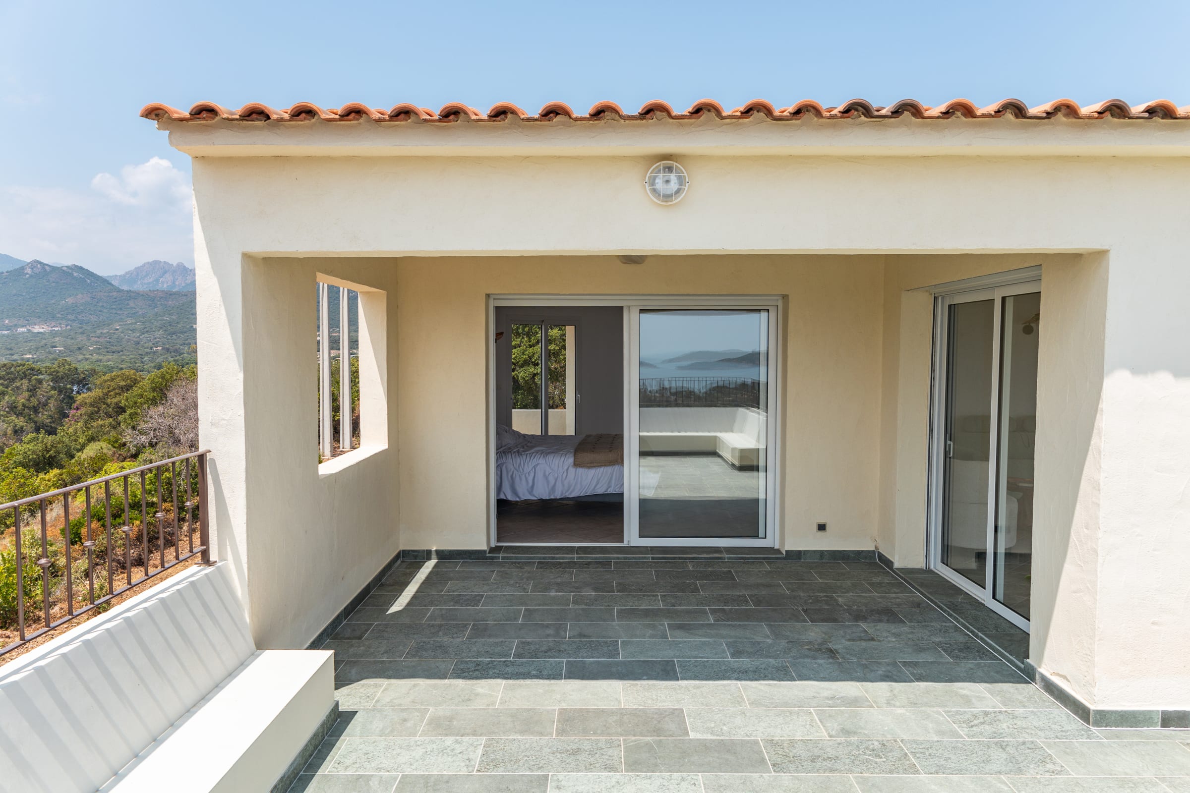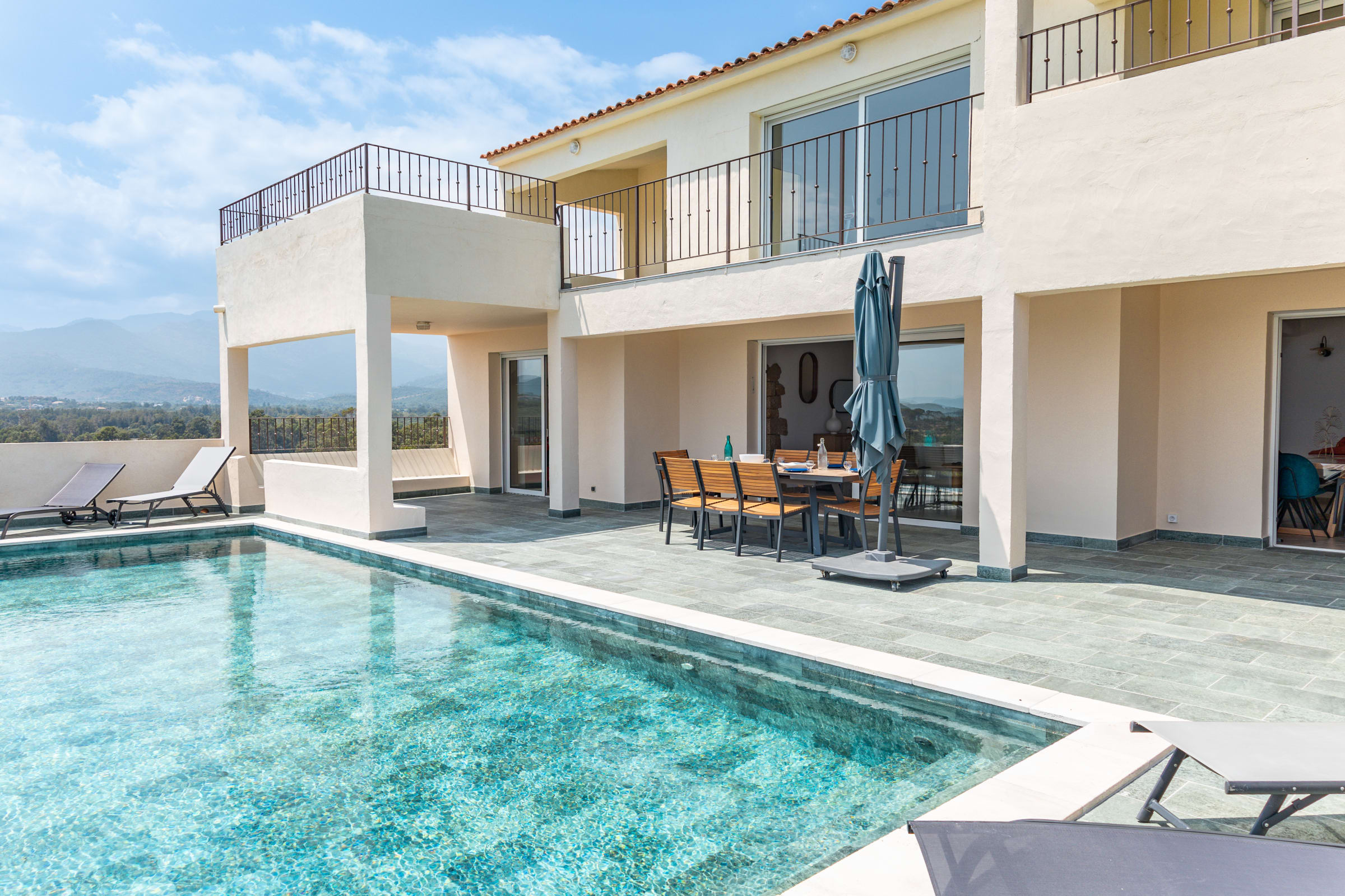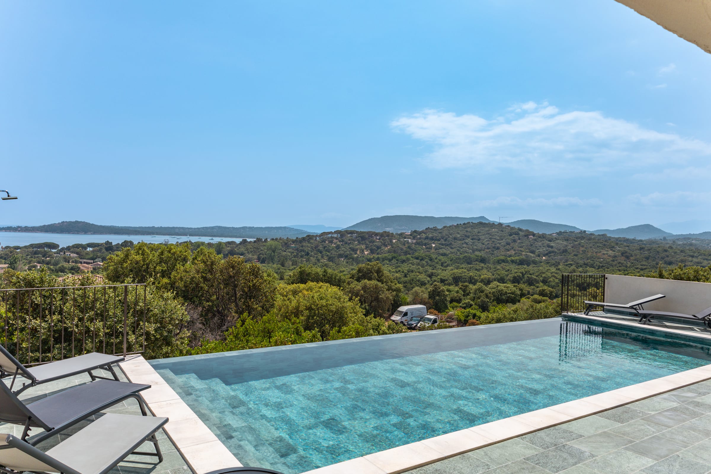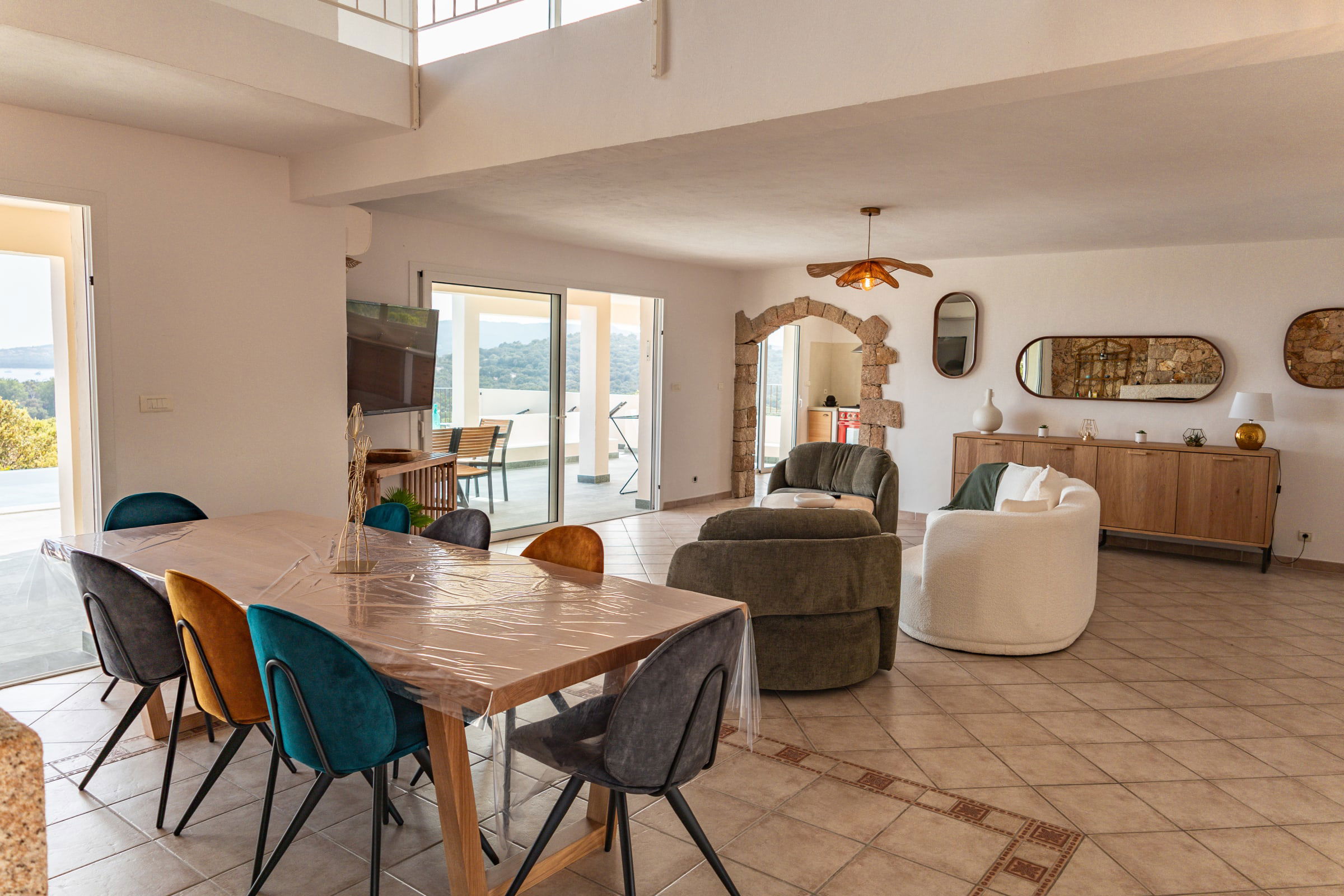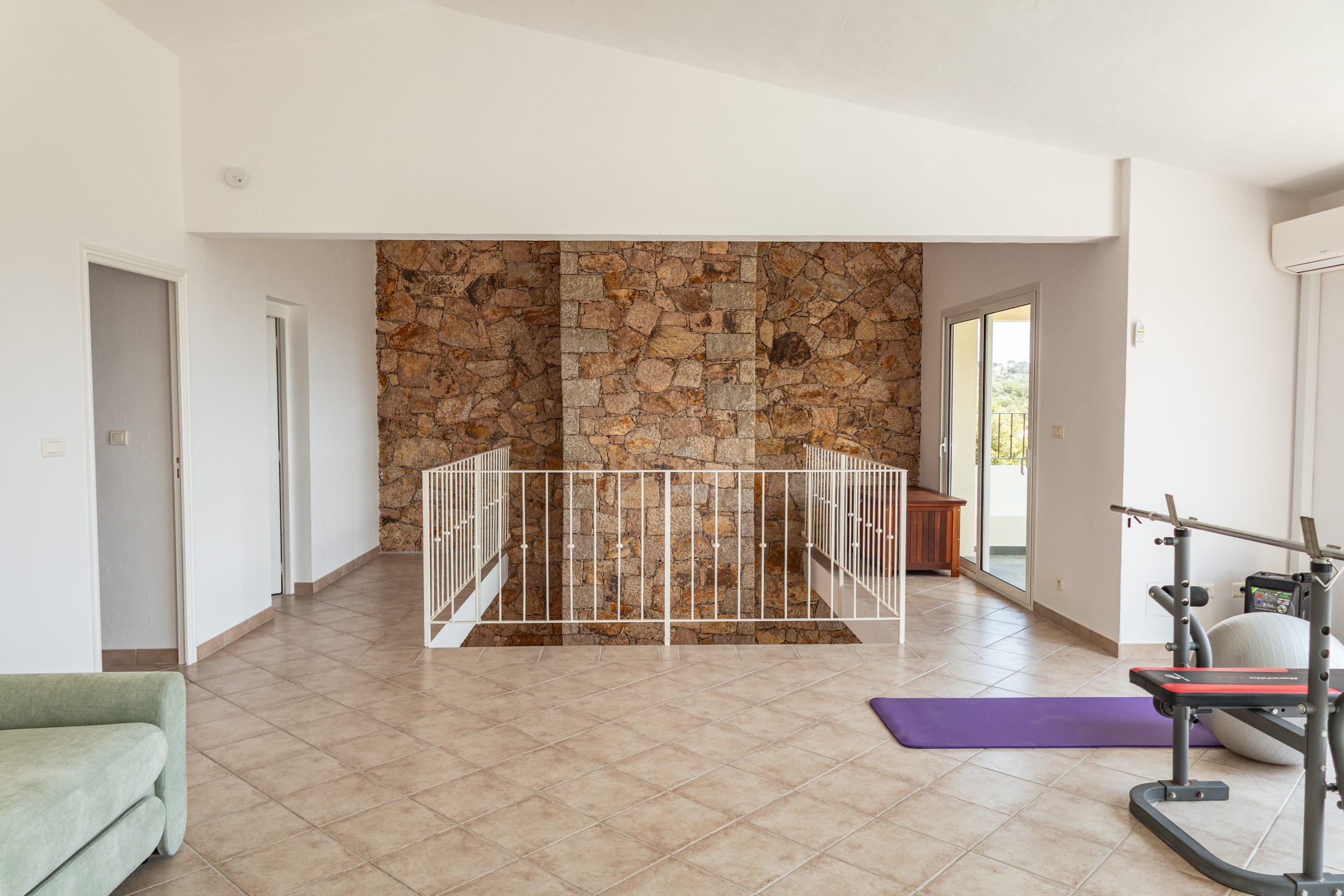 La villa offre une vue imprenable sur la mer et la tour génoise de Pinarello. Les espaces de vie, baignés de lumière, sont tous orientés vers ce panorama exceptionnel.