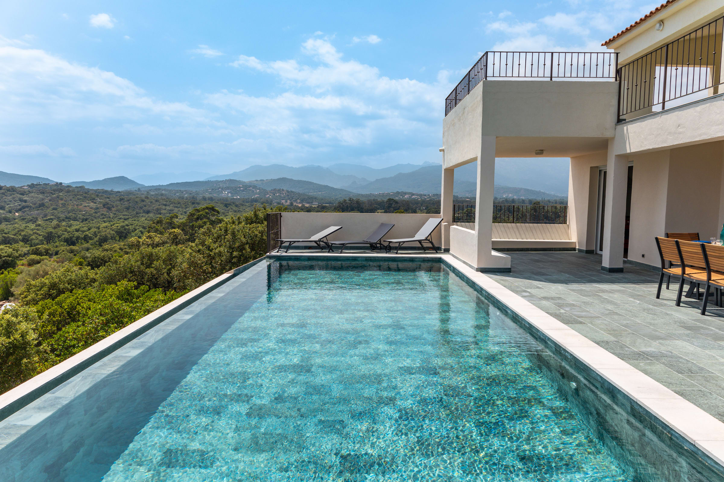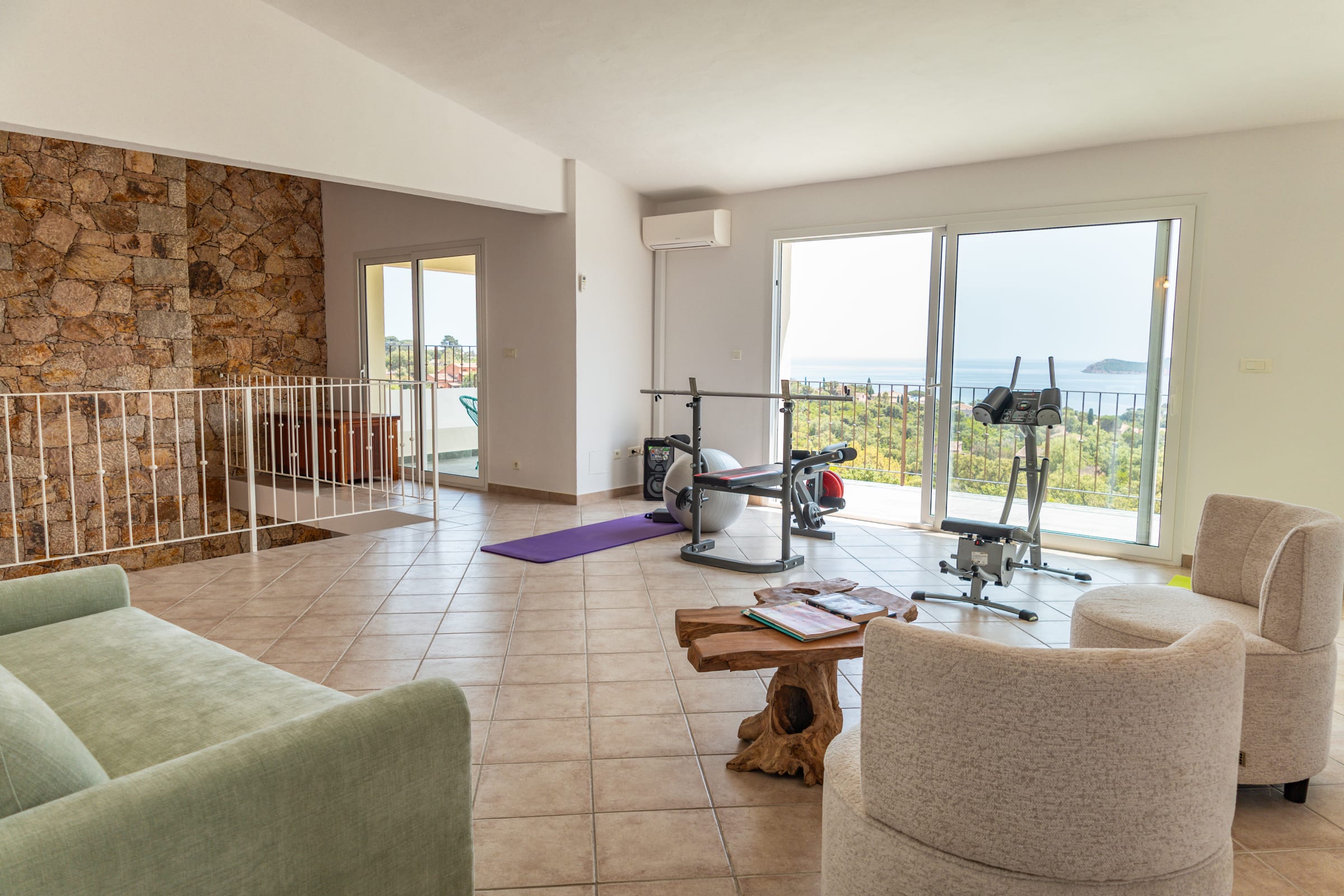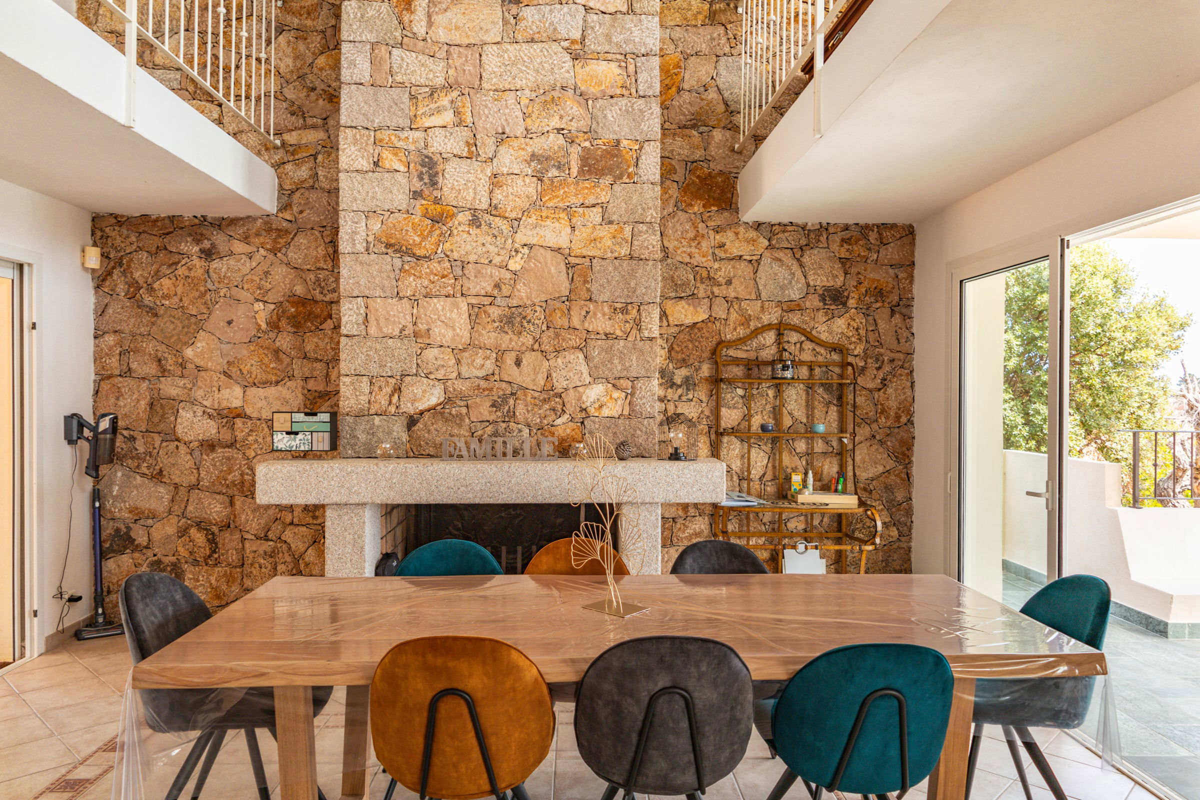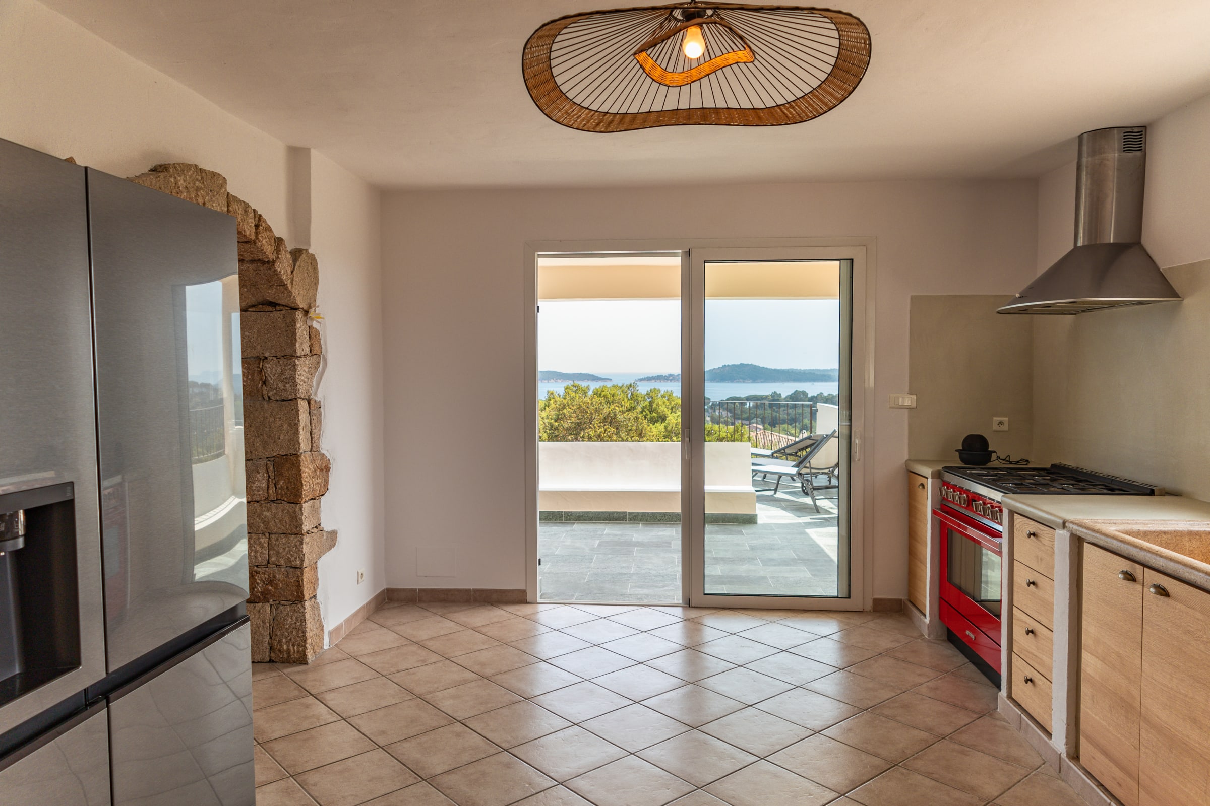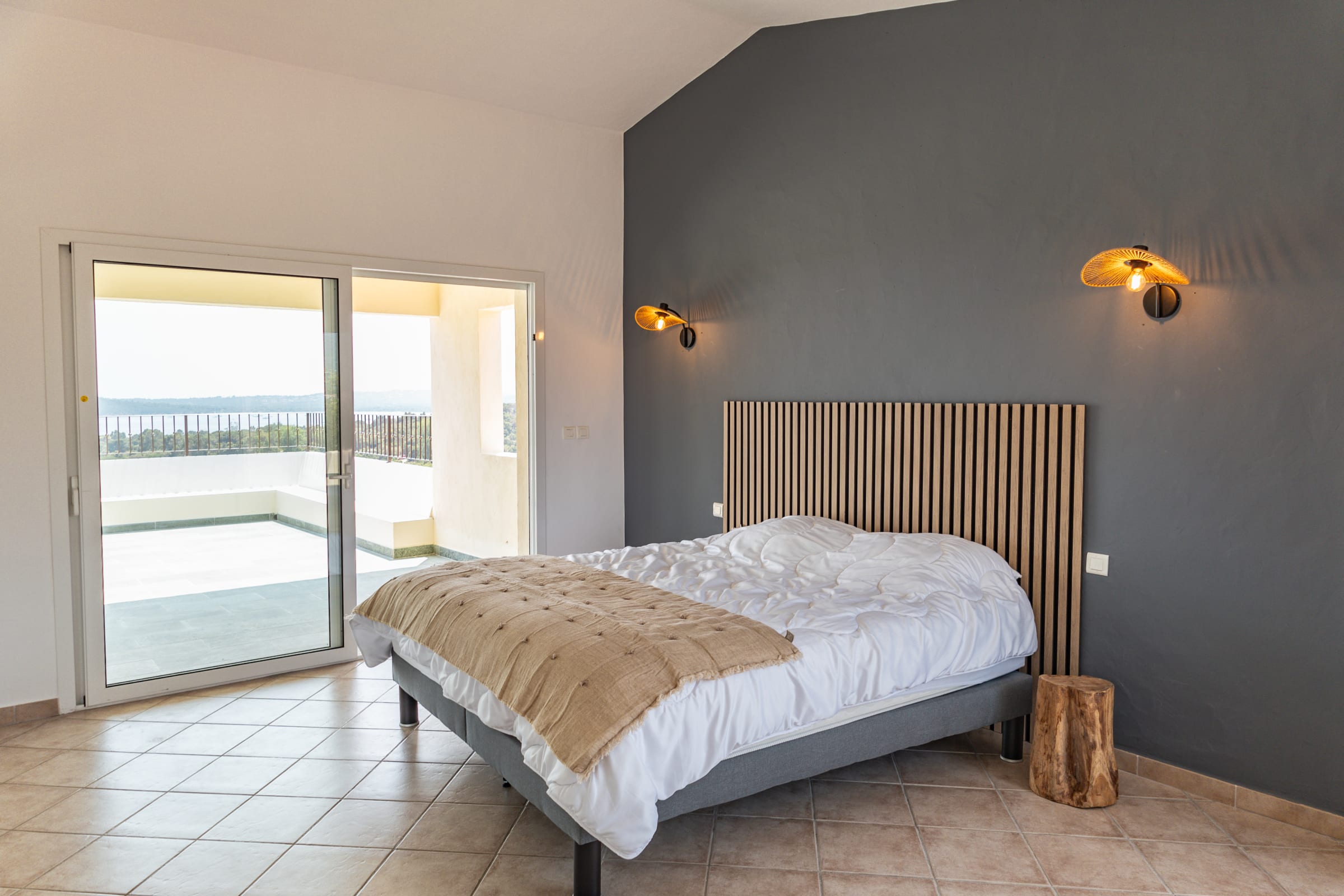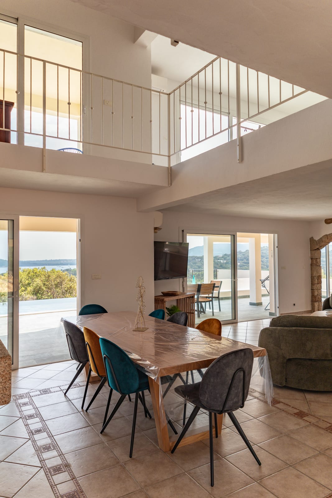 La villa offre une vue imprenable sur la mer et la tour génoise de Pinarello. Les espaces de vie, baignés de lumière, sont tous orientés vers ce panorama exceptionnel.