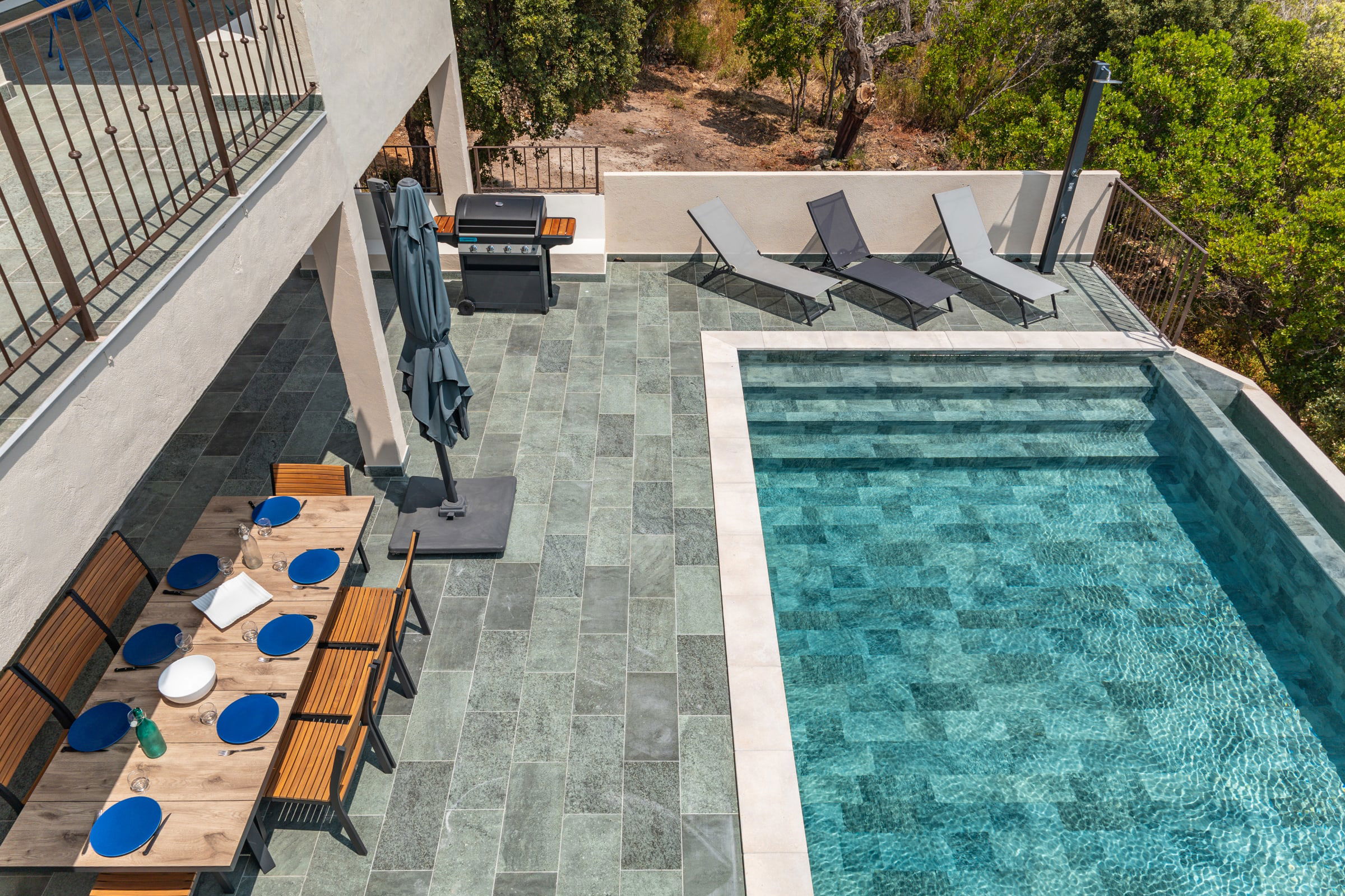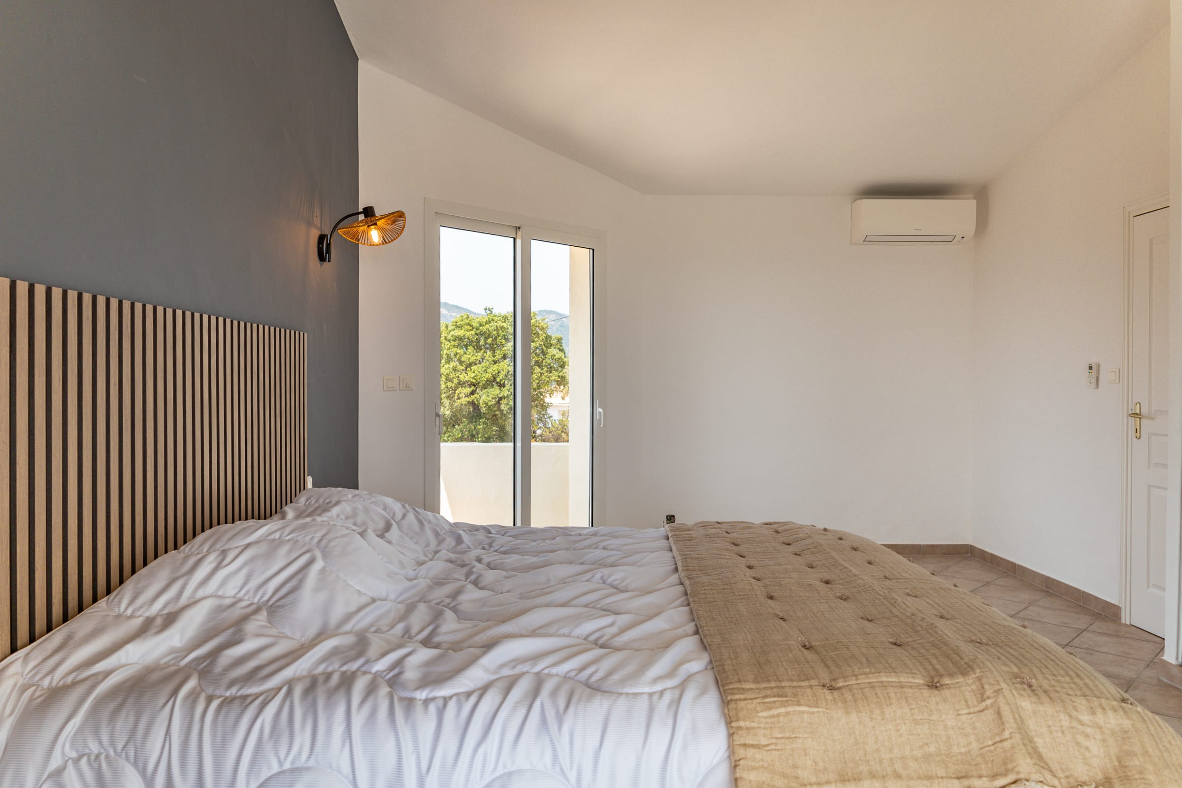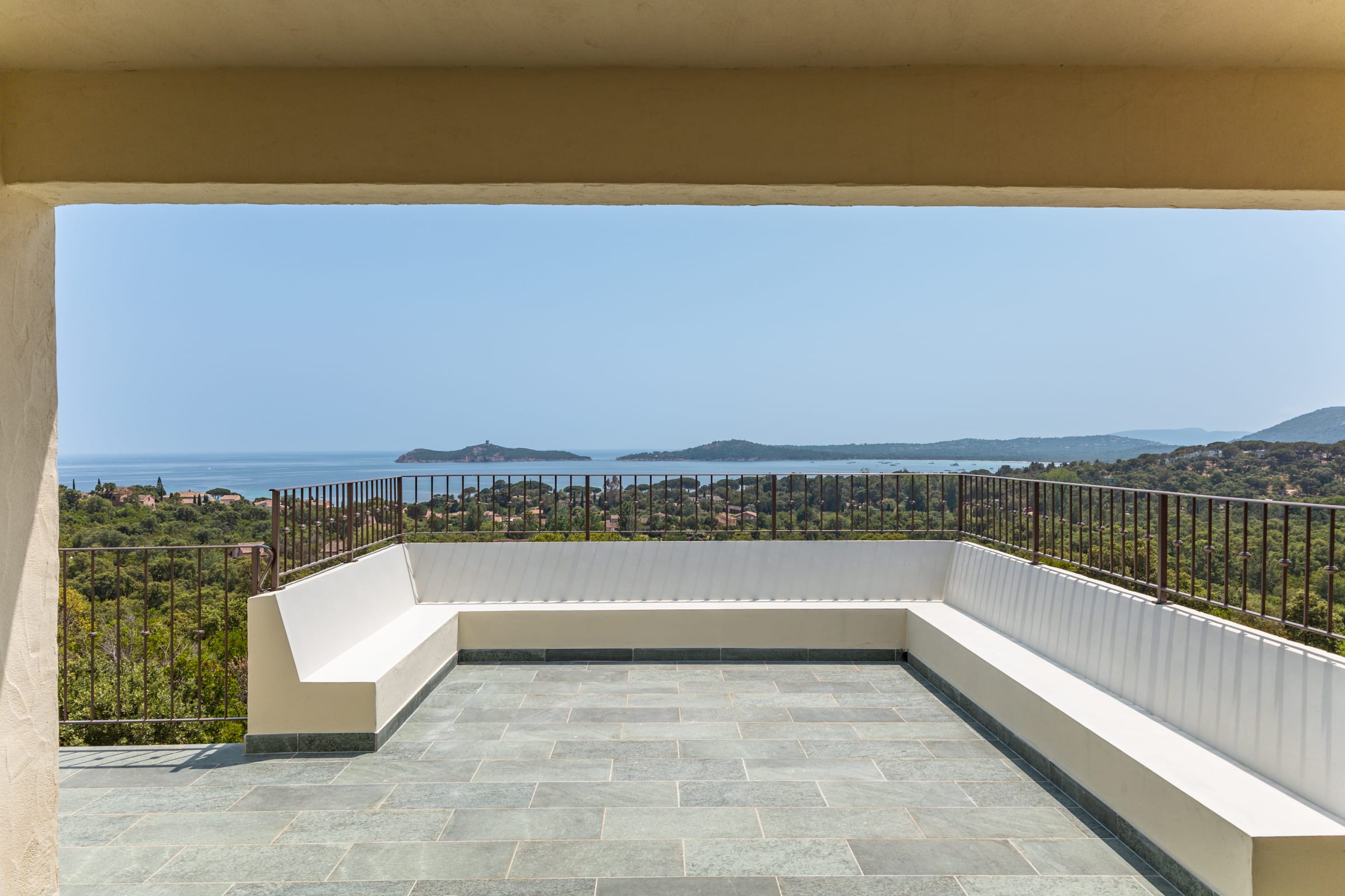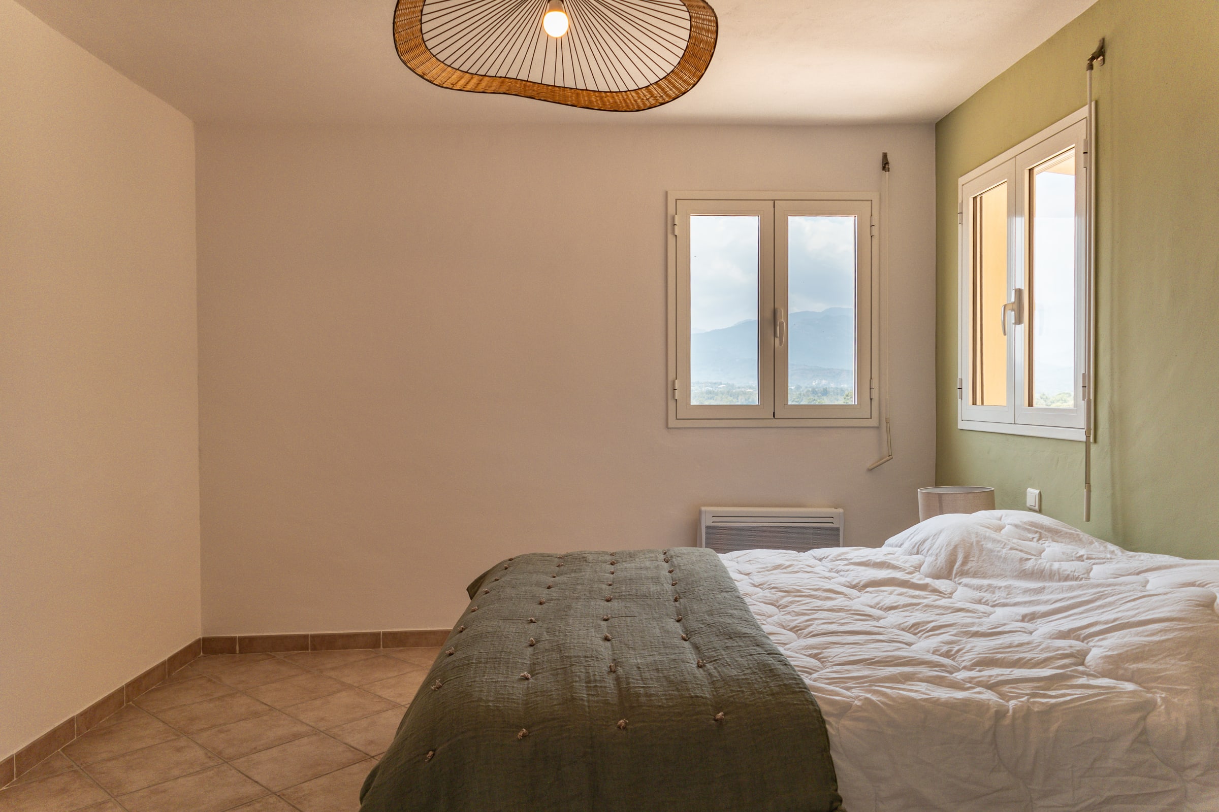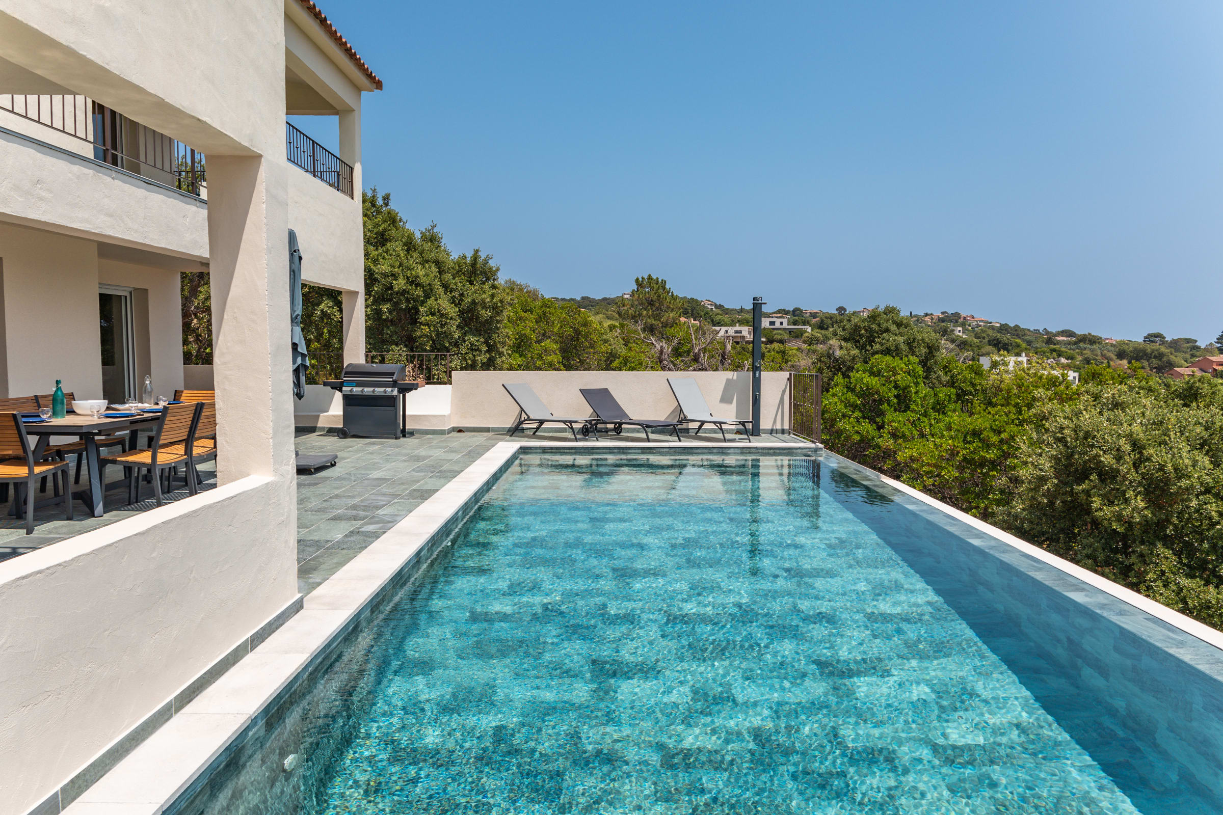 La villa offre une vue imprenable sur la mer et la tour génoise de Pinarello. Les espaces de vie, baignés de lumière, sont tous orientés vers ce panorama exceptionnel.