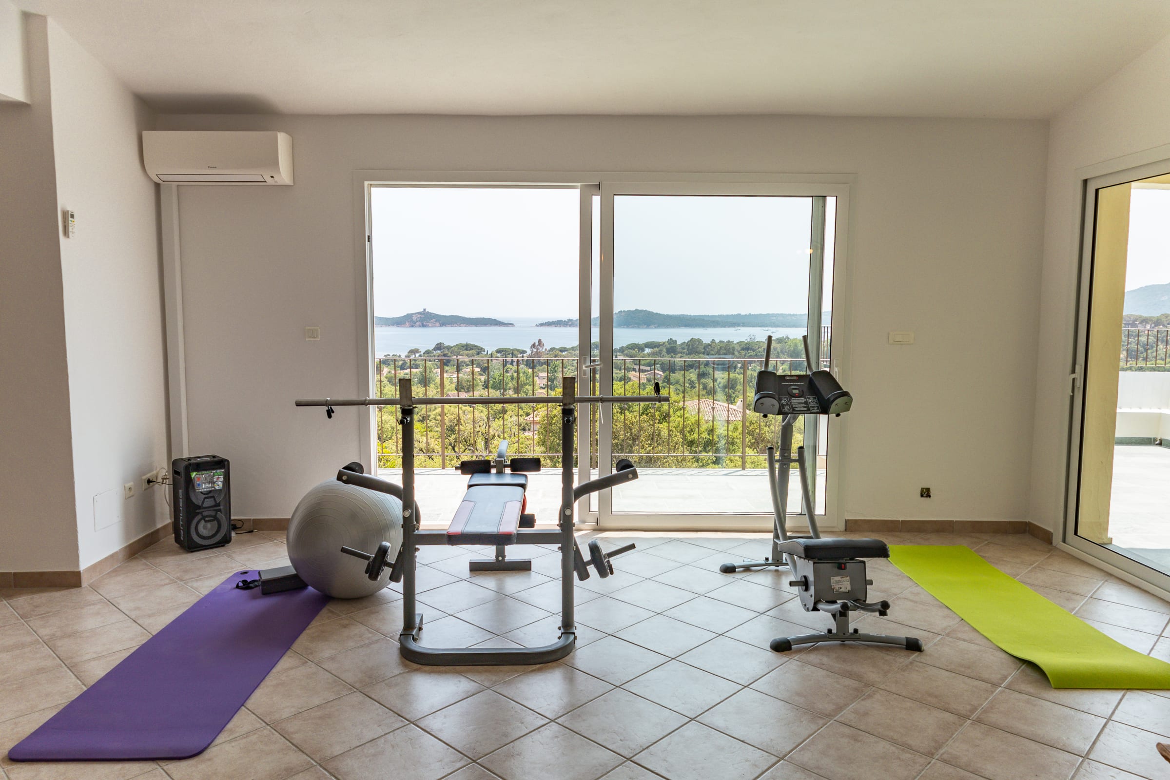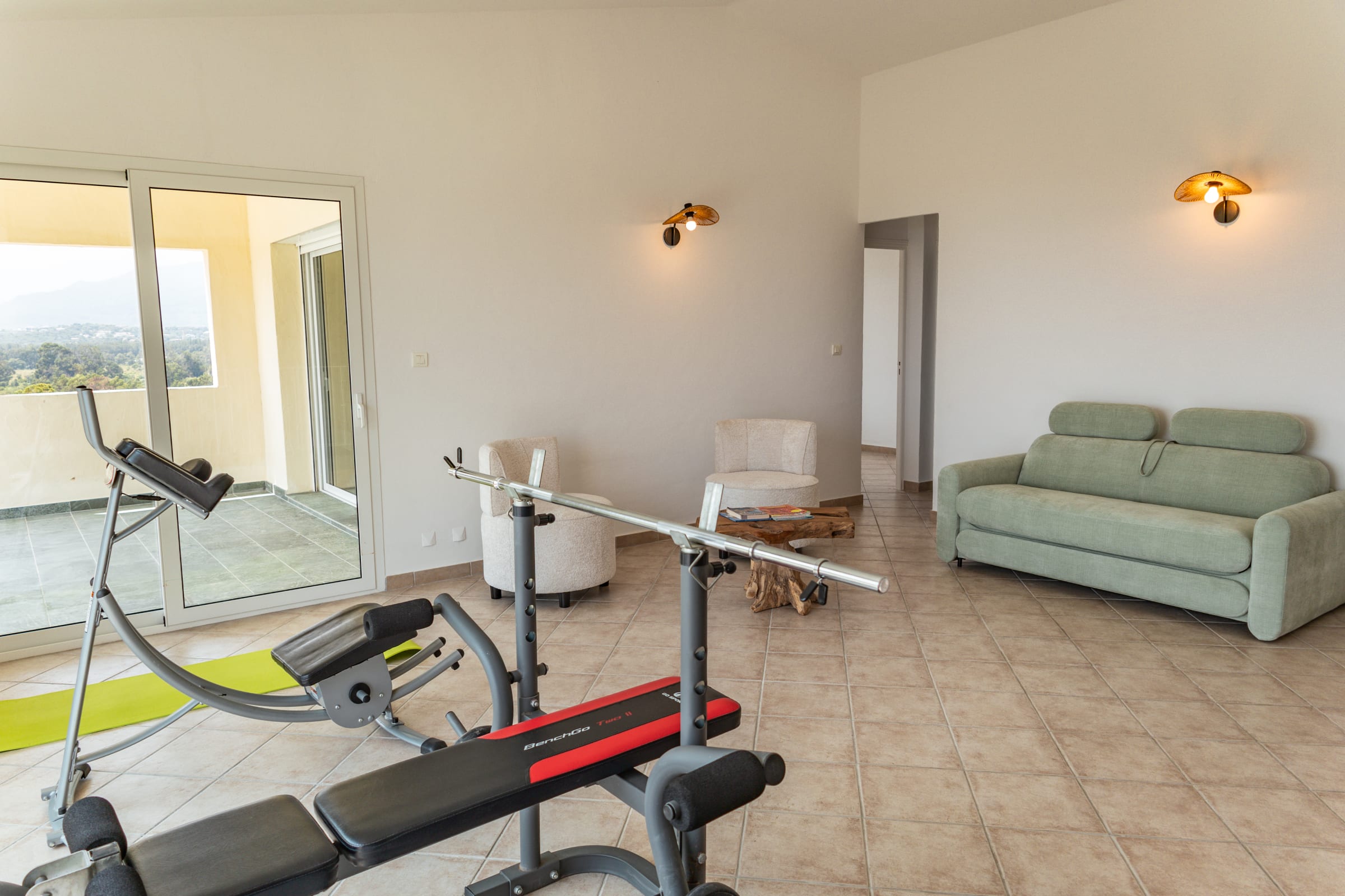 Salle polyvalente à l’étage avec canapé-lit (140x200), espace de sport équipé : banc, poids, ballon, tapis de yoga, machine à abdos.