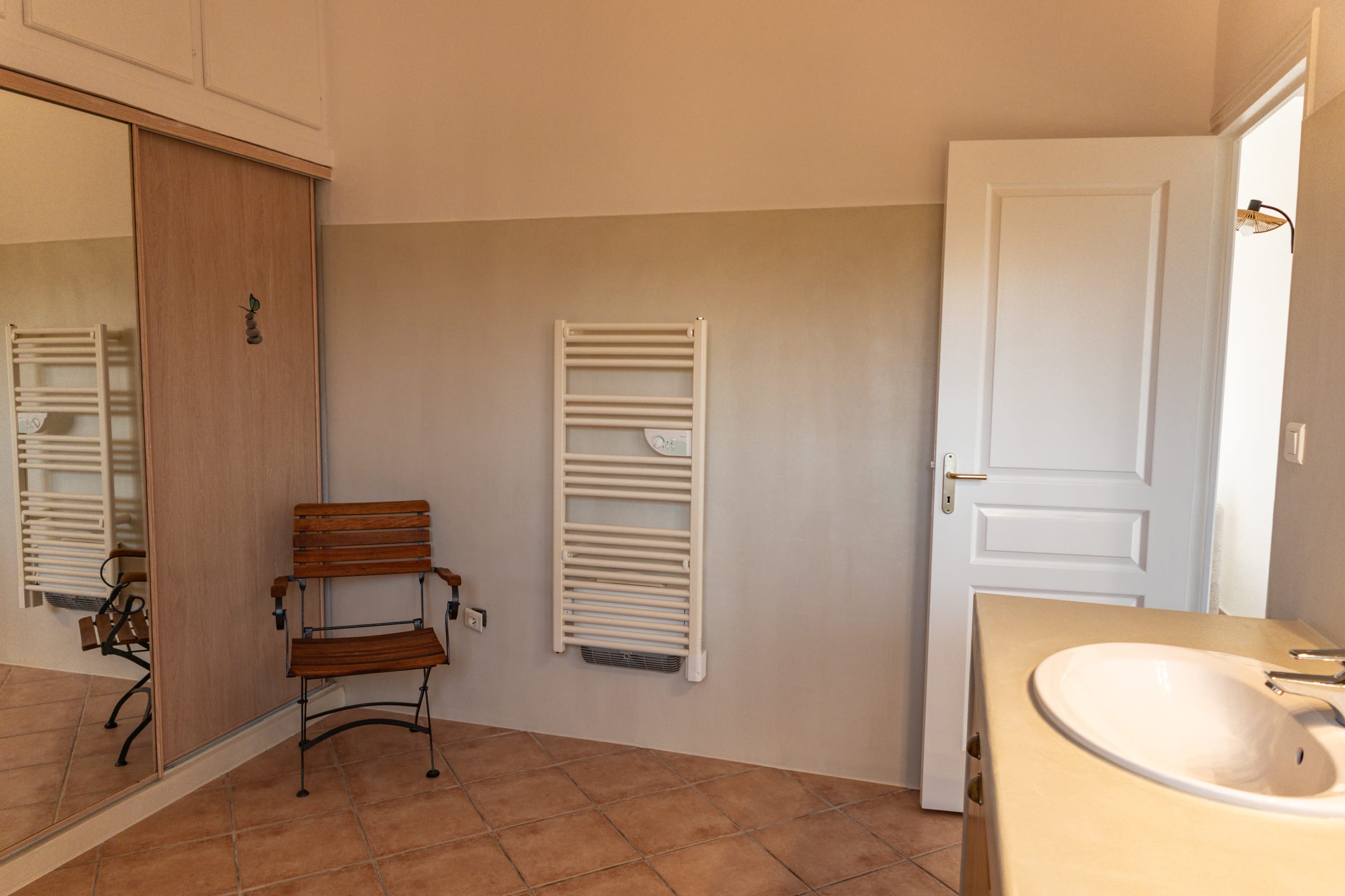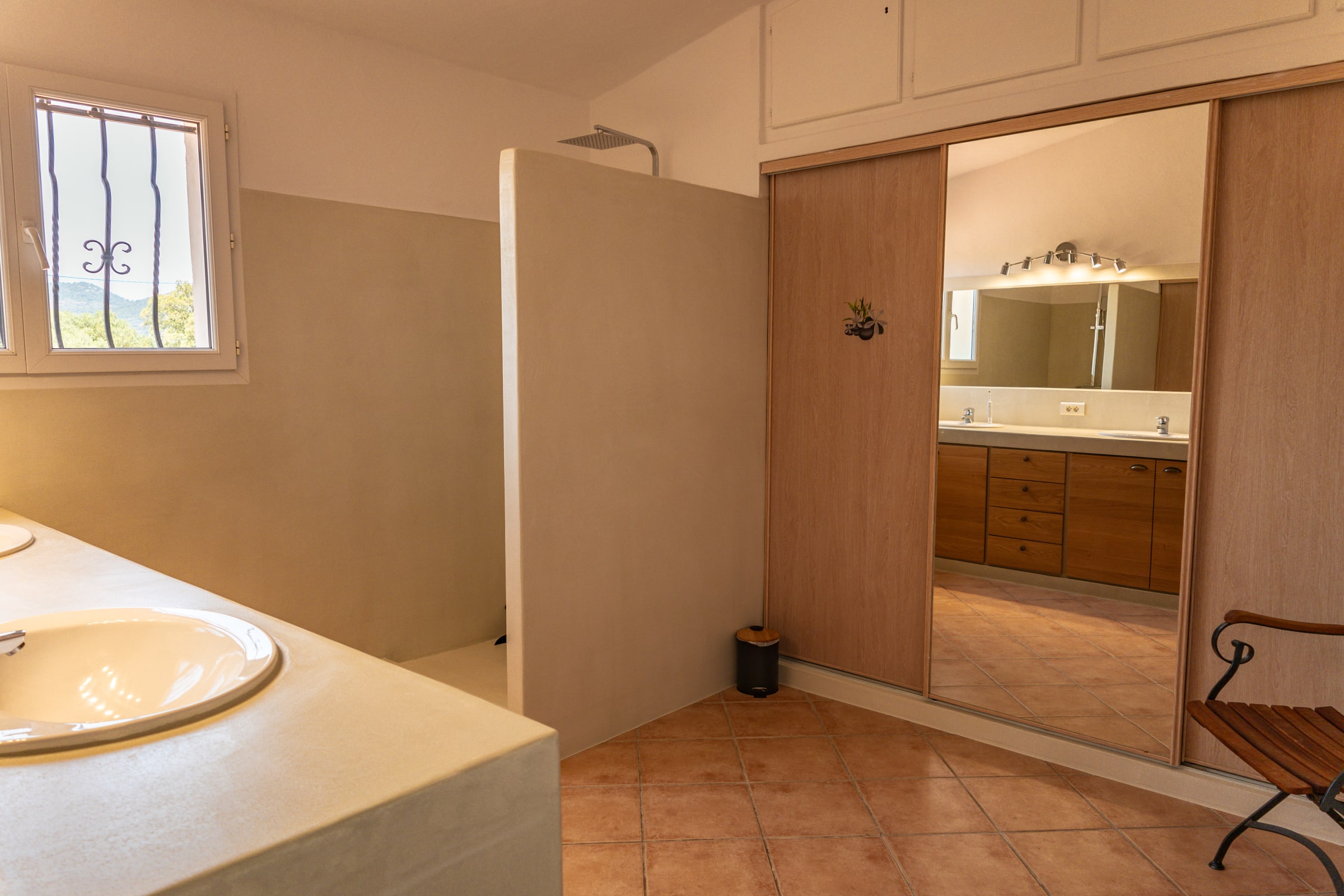 Terrasse aménagée avec 6 bains de soleil, grand parasol, douche extérieure