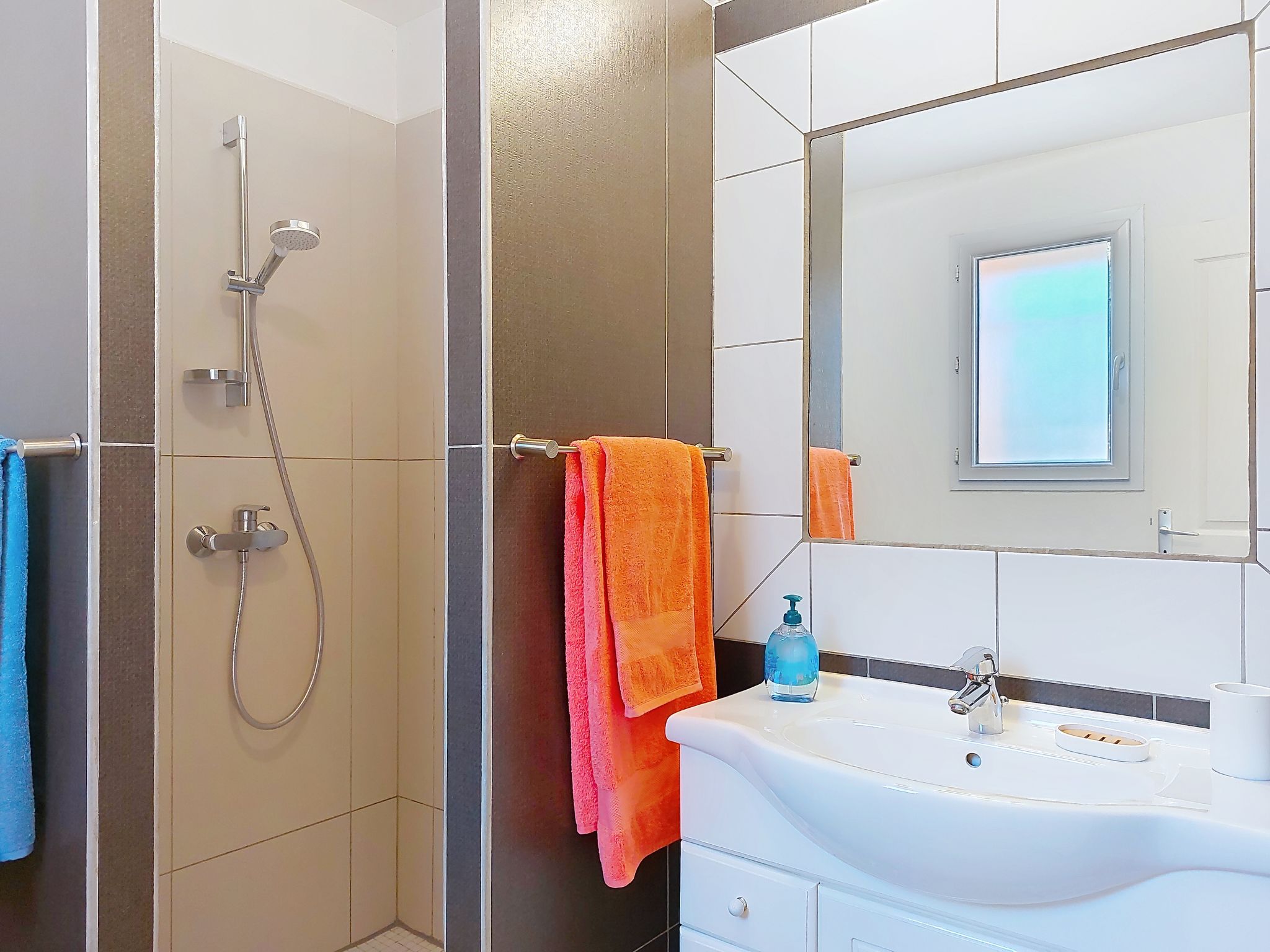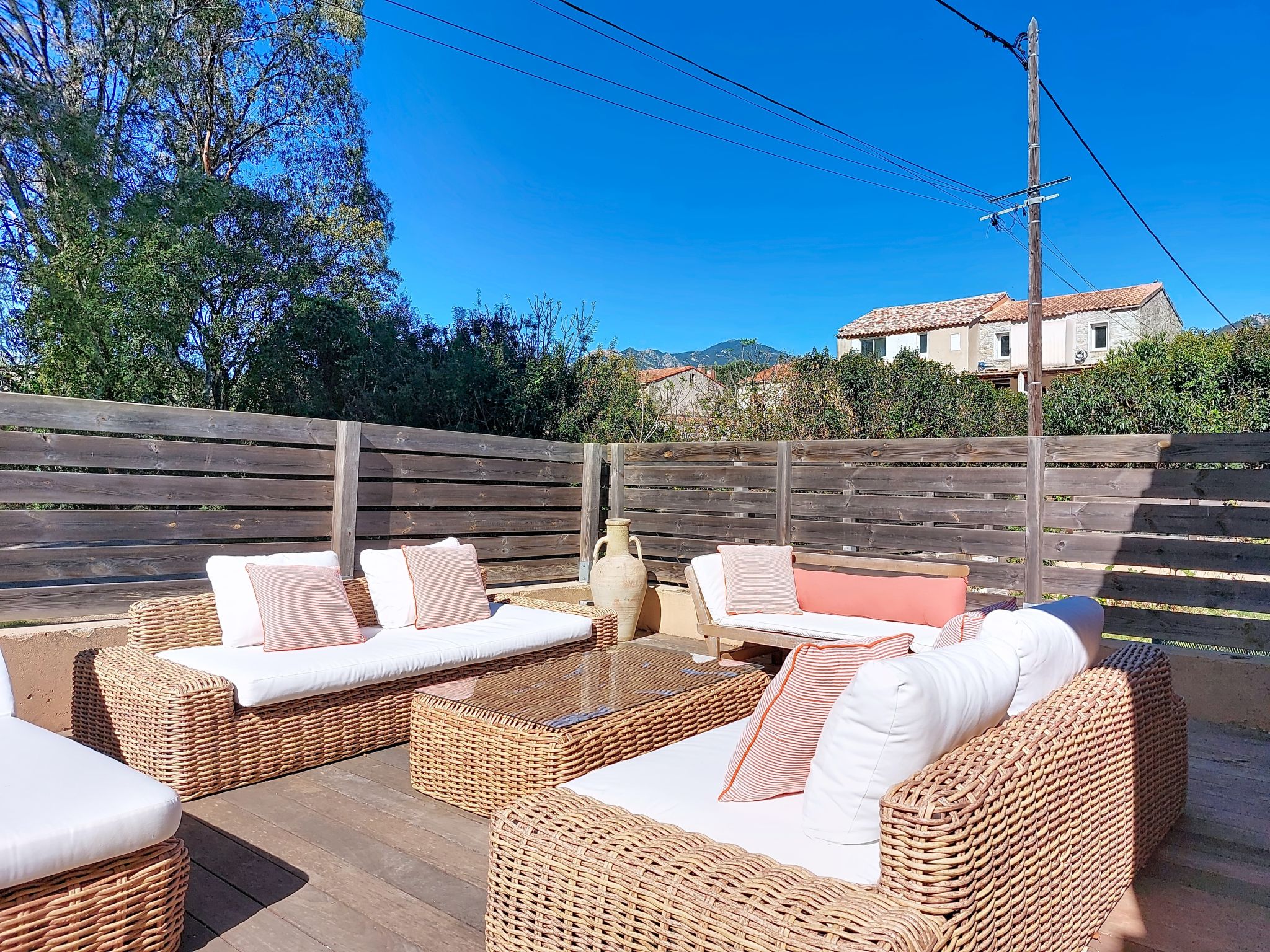 "Villa Marea", maison mitoyenne 4 pièces 100 m2 sur 2 niveaux. Aménagement confortable et agréable: séjour/salle à manger 30 m2 avec table pour les repas et TV (écran plat), air-conditionné. Sortie sur la terrasse. 1 chambre avec 1 grand-lit (160 cm, longueur 200 cm). 1 chambre avec 1 grand-lit (160 cm, longueur 200 cm). Cuisine ouverte (four, lave-vaisselle, 3 plaques à induction, grille-pain, bouilloire électrique, micro-ondes, cafetière électrique). Salle de bains, WC séparé. Chauffage électrique. À l'étage supérieur: 1 chambre avec 1 grand-lit (160 cm, longueur 200 cm), douche/WC. Terrasse 20 m2, couverte. Meubles de terrasse, place pour s'asseoir. Vue sur les montagnes et les alentours. A disposition: lave-linge, sèche-linge, lit bébé, sèche-cheveux. Internet (Connexion WIFI, gratuit). Place de parking. Veuillez noter: détecteur de fumée. Annonce d'un particulier (art 155, IV du CGI).
