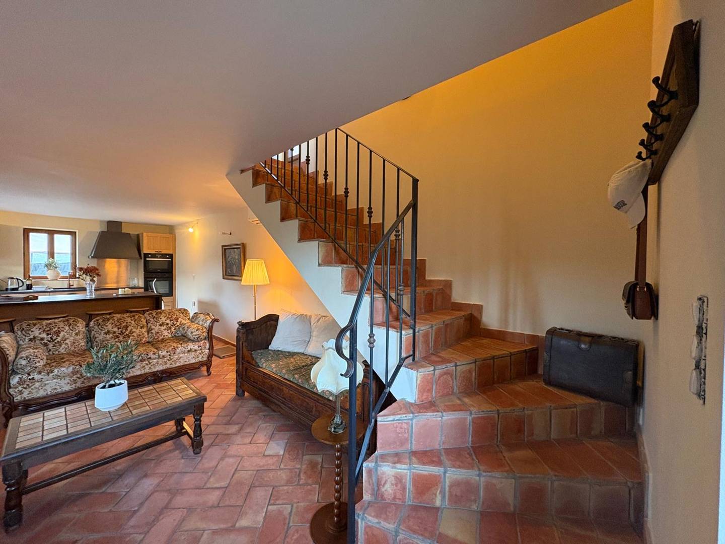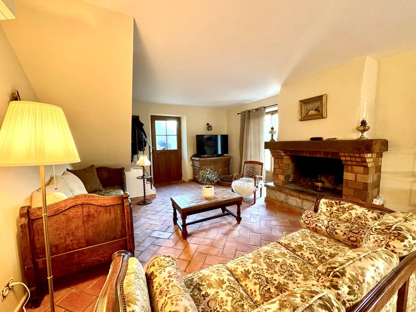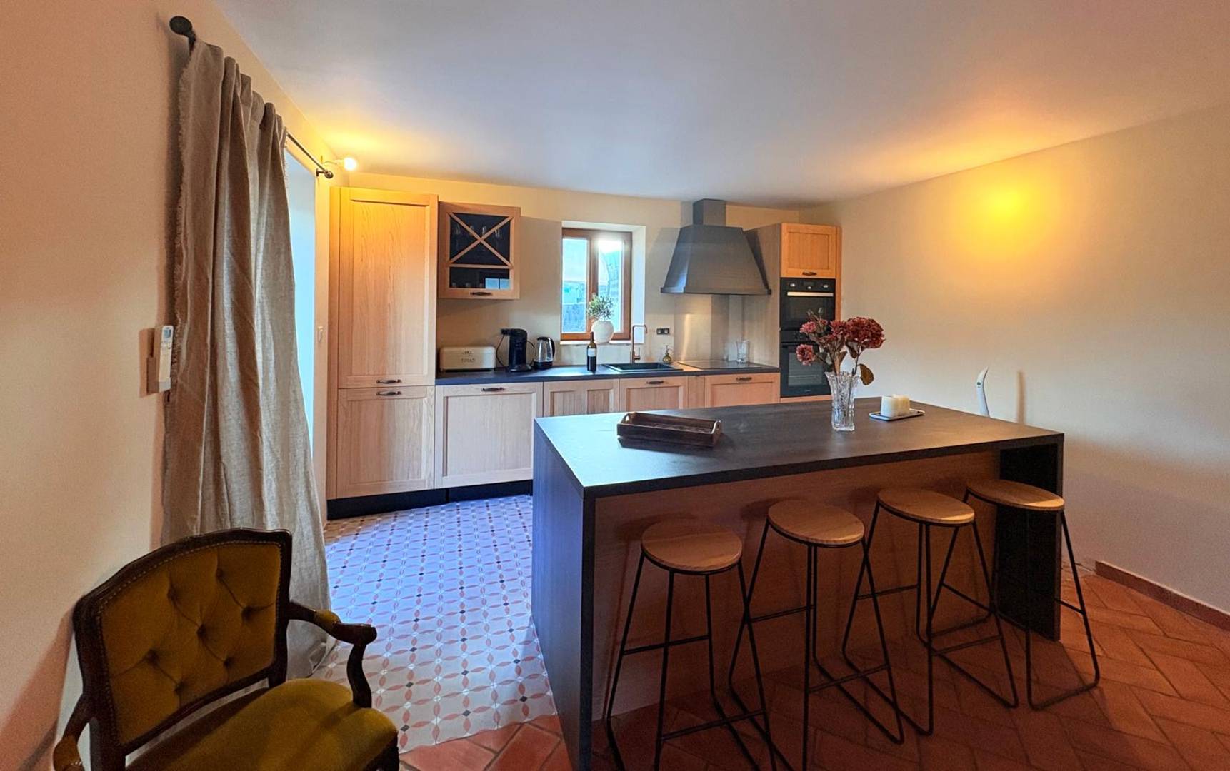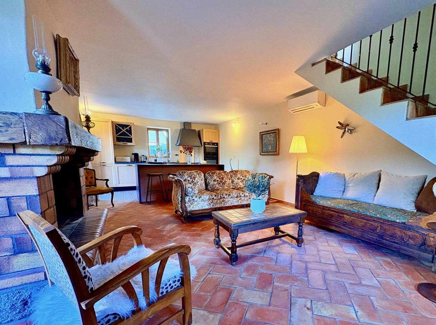 Cette maison rénovée dispose d'une cuisine ouverte sur un séjour lumineux avec cheminée, coin repas et coin salon, avec accès terrasse et piscine, depuis laquelle vous pourrez admirer la vue.
