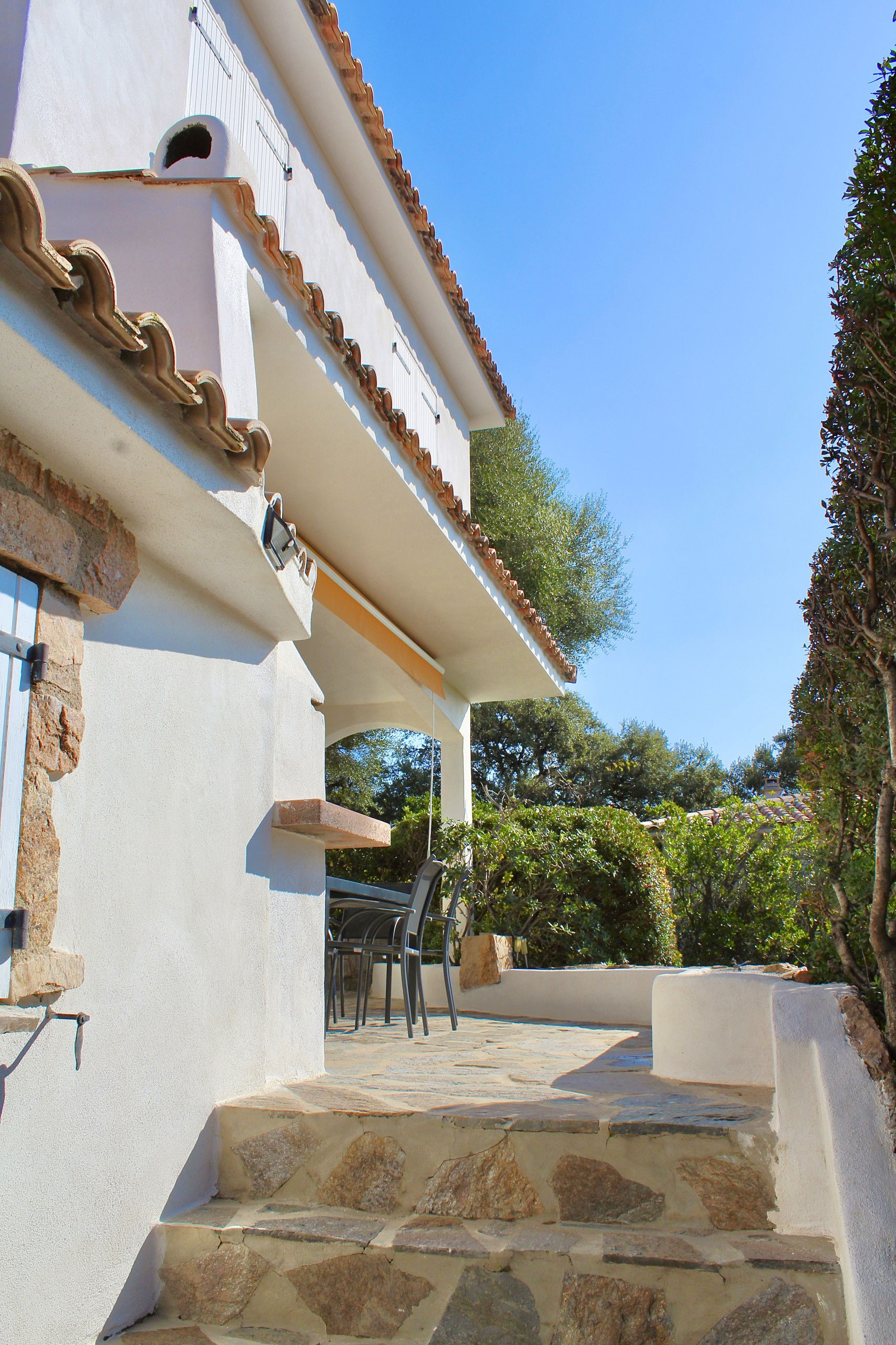 La villa possède une terrasse à l'écart , permettant une intimité absolue. La piscine chauffée et sécurisée avec une alarme fait face à la mer.