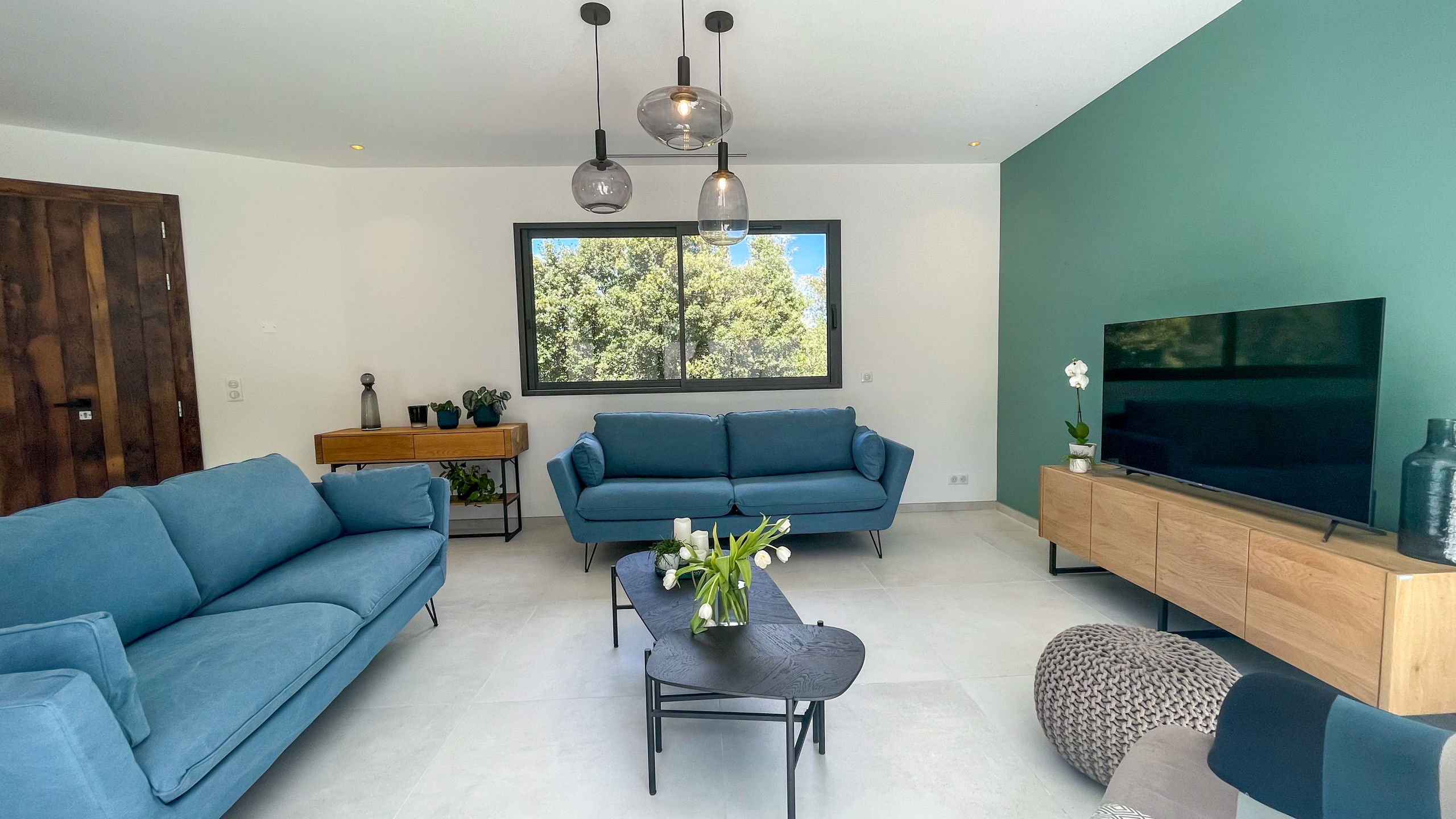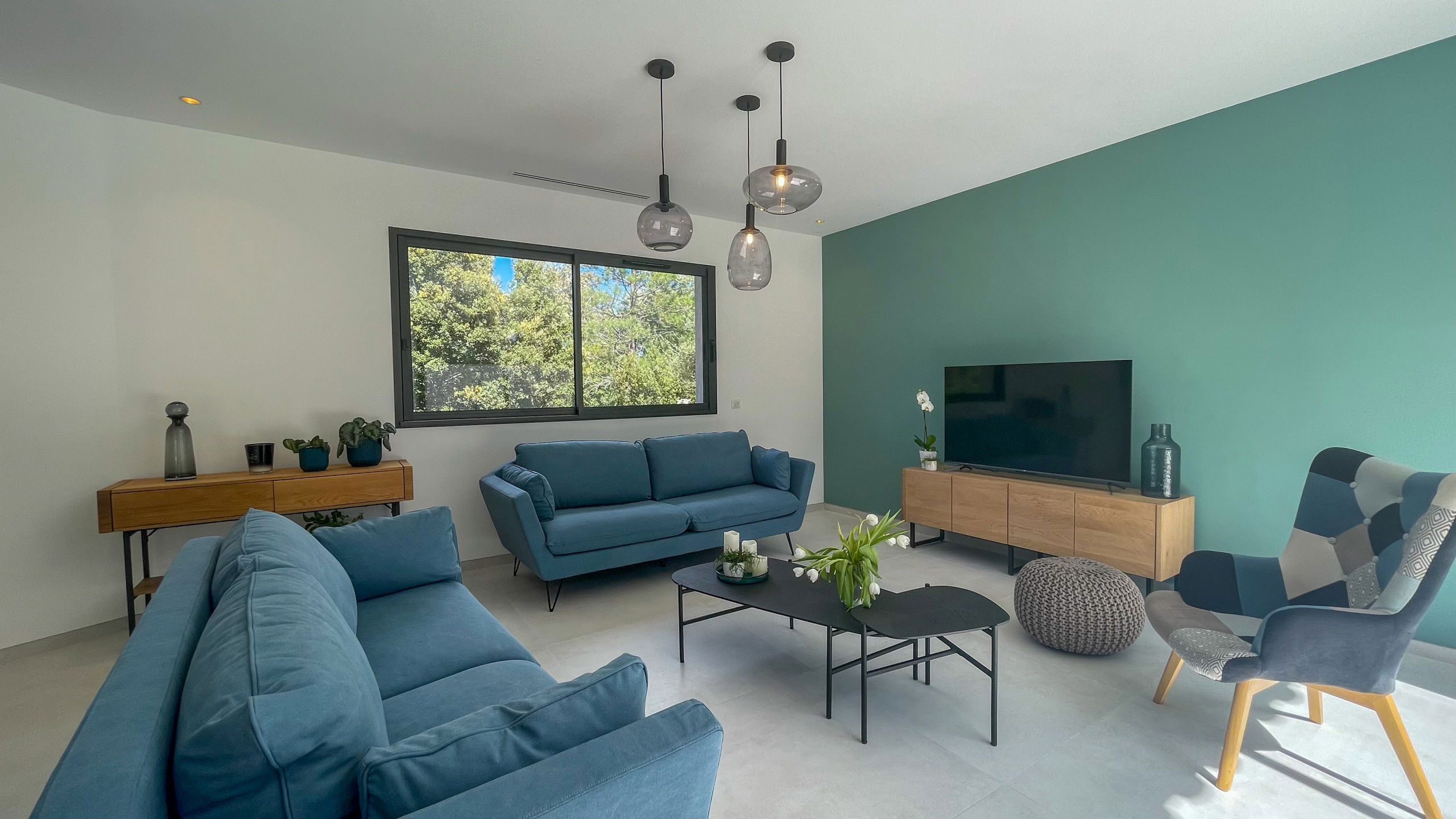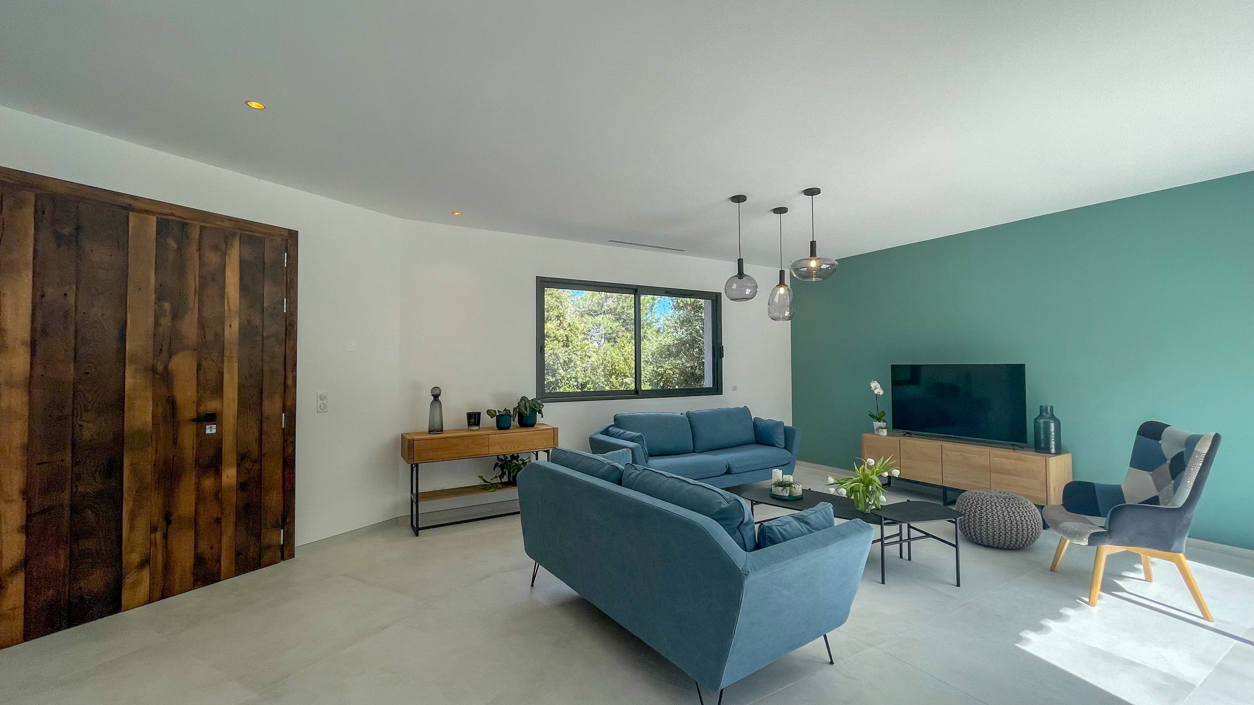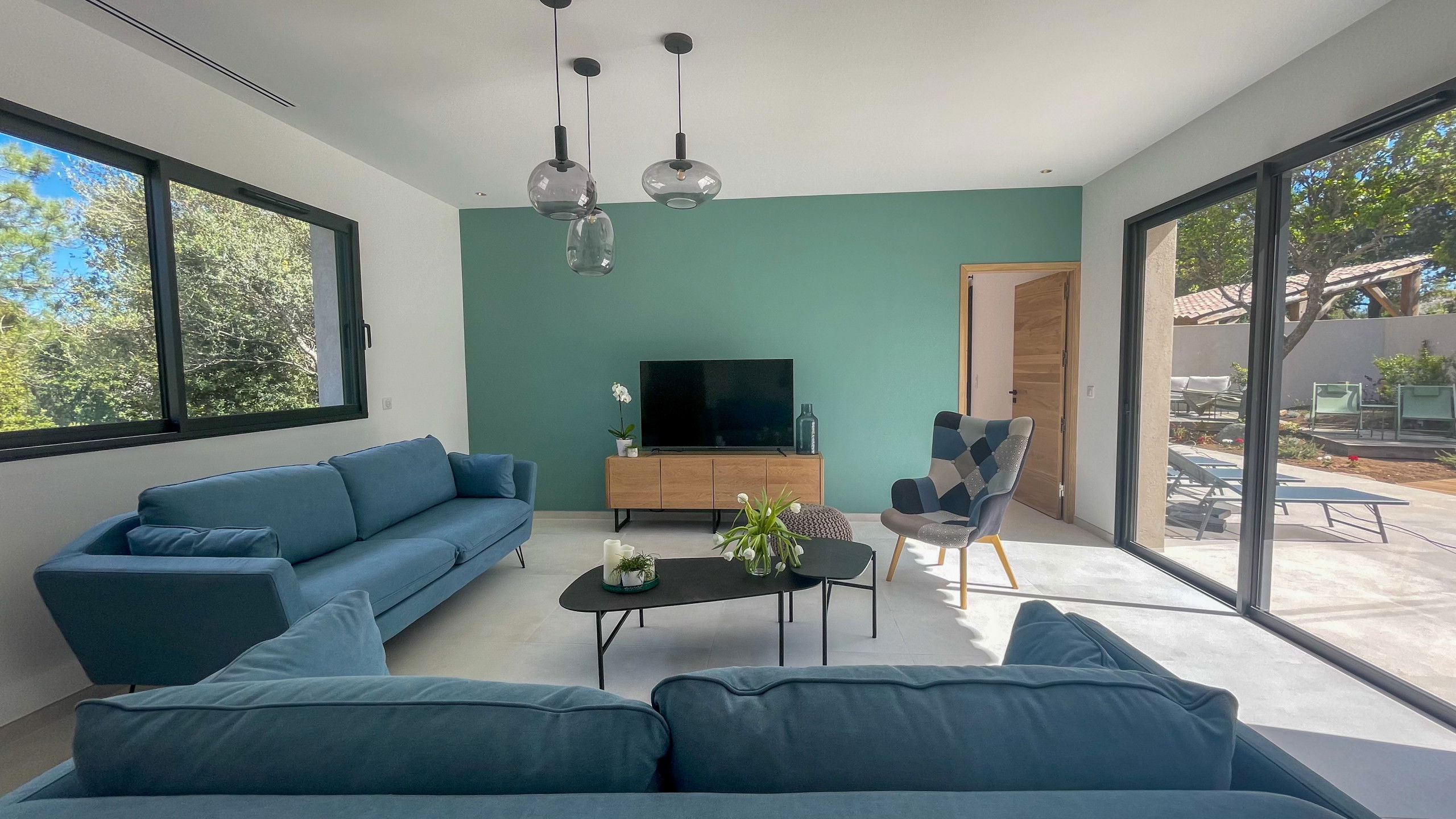- Un salon/salle à manger donnant sur la terrasse et la piscine