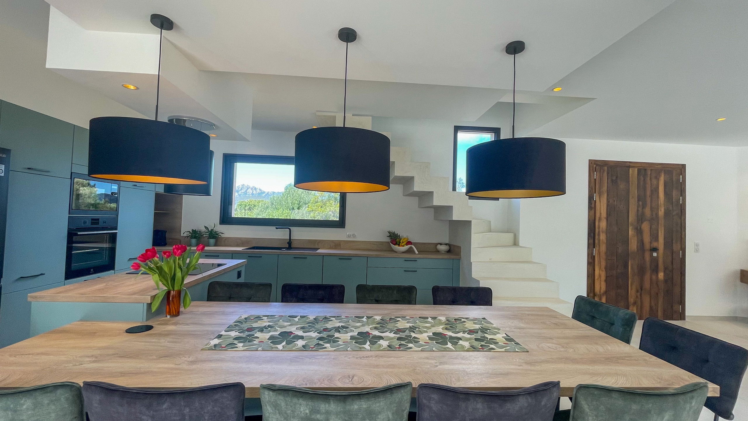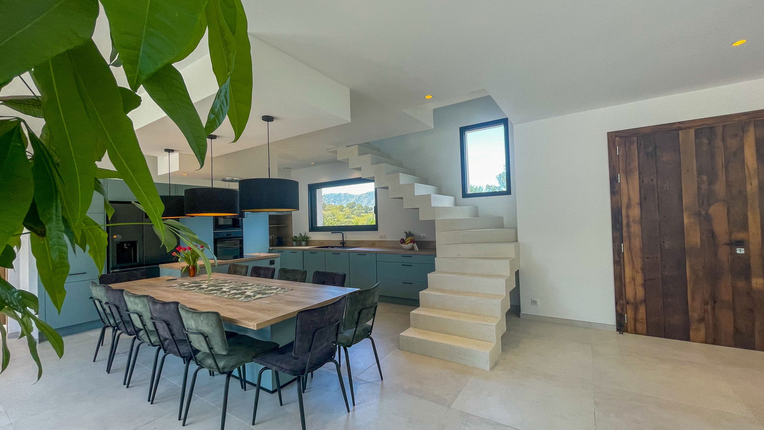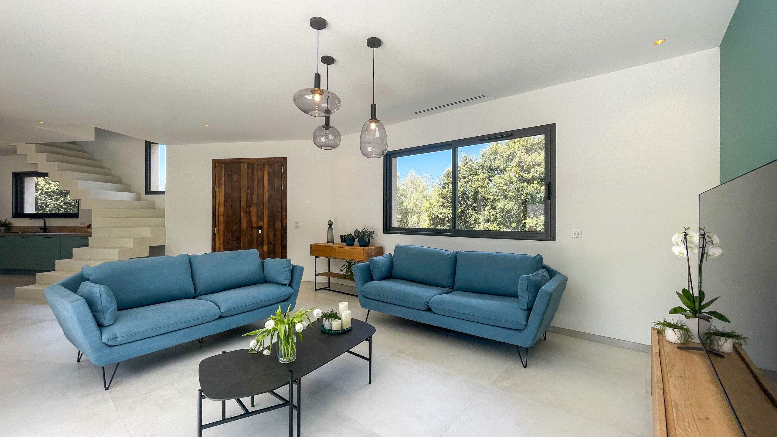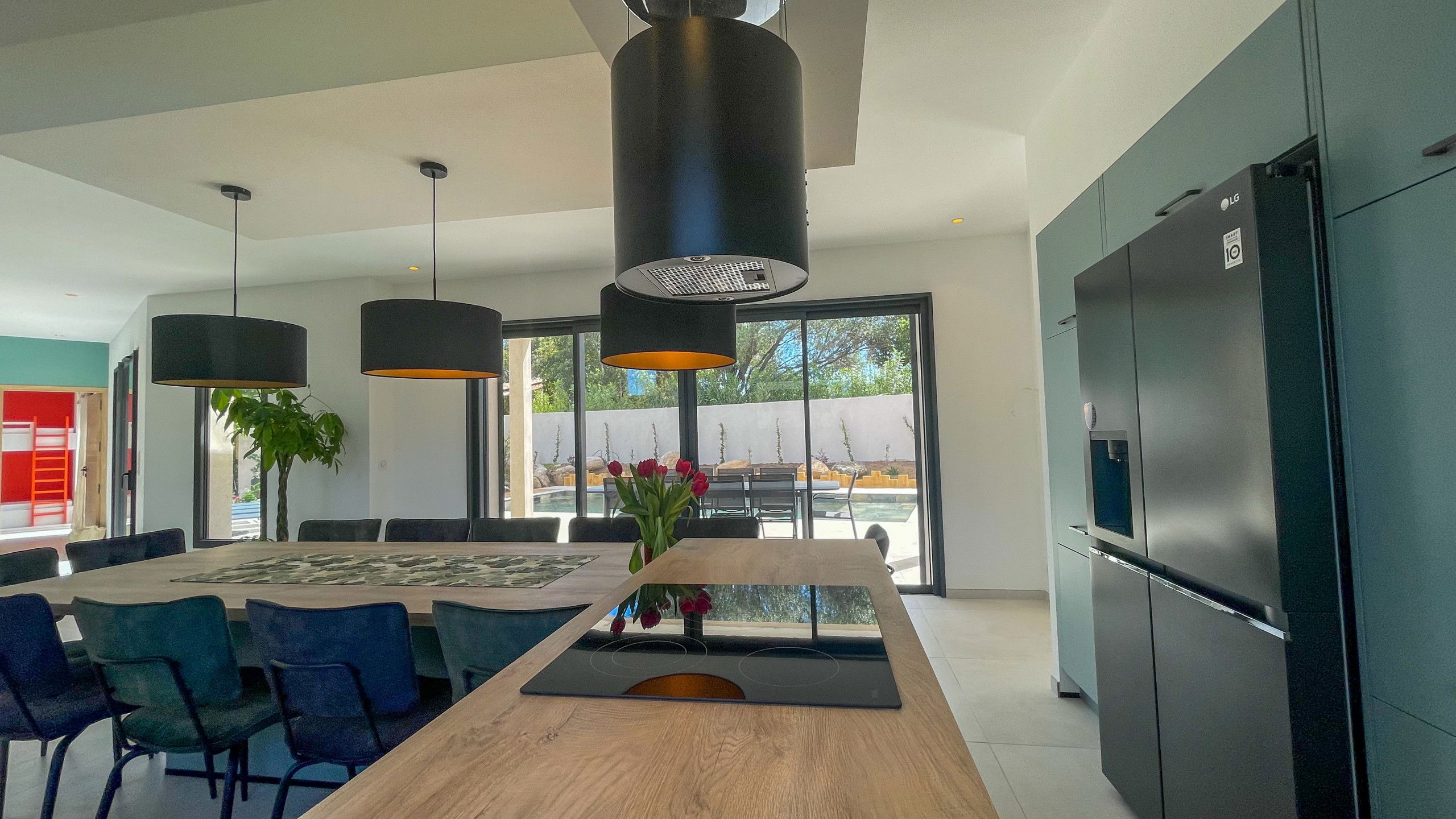 - Un salon/salle à manger donnant sur la terrasse et la piscine