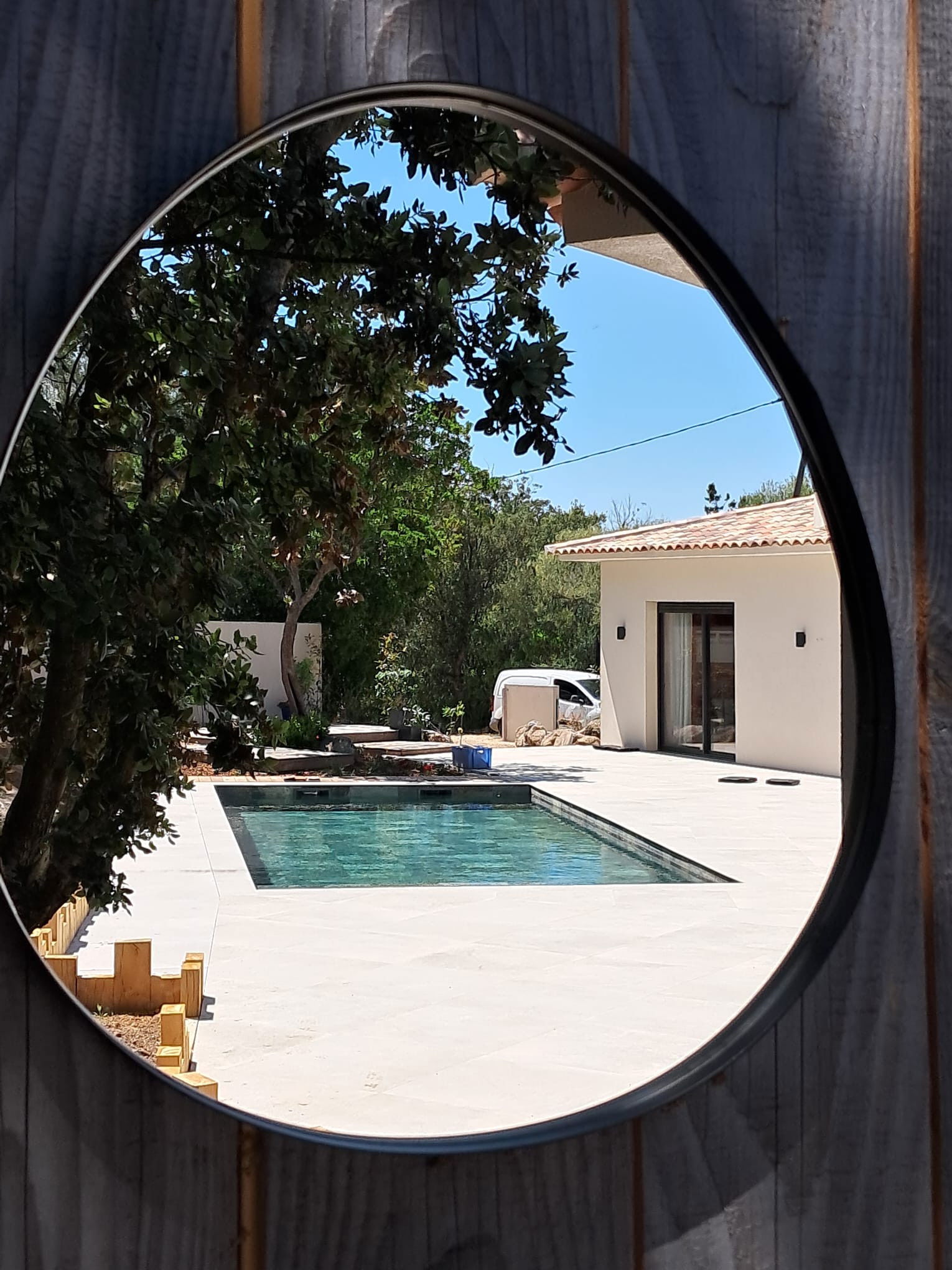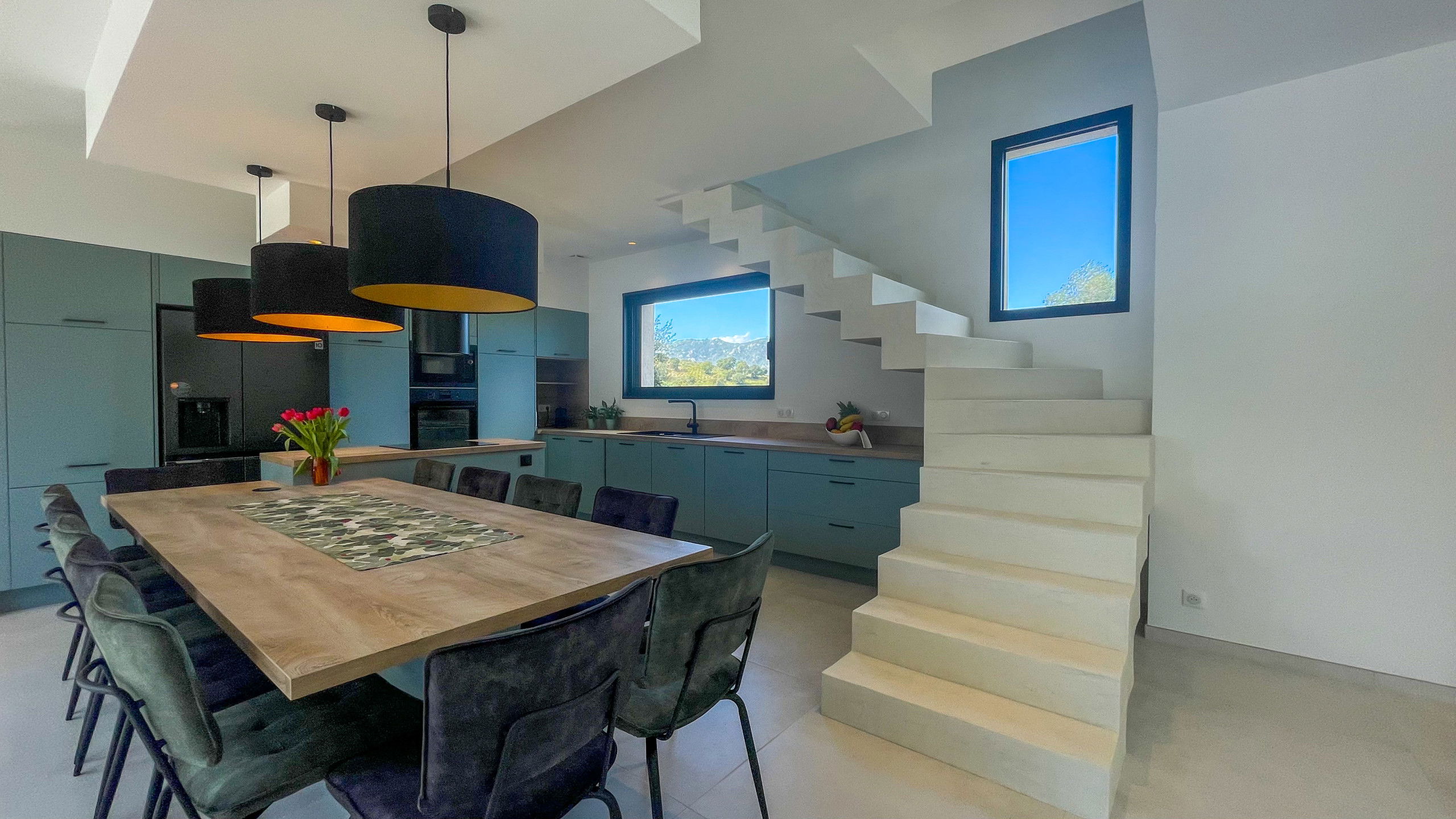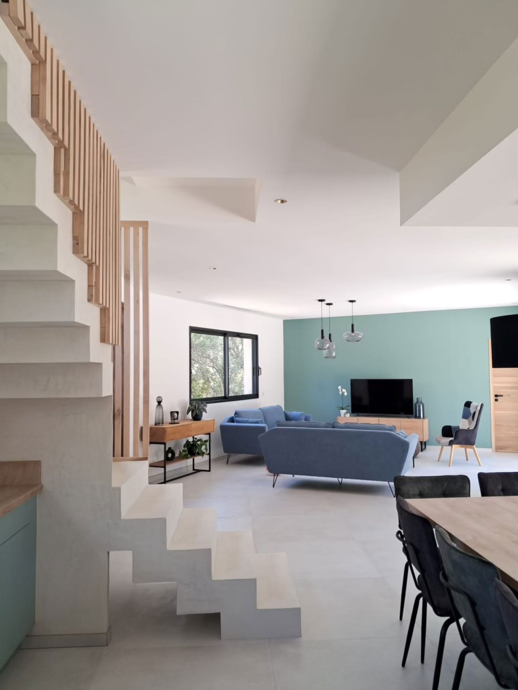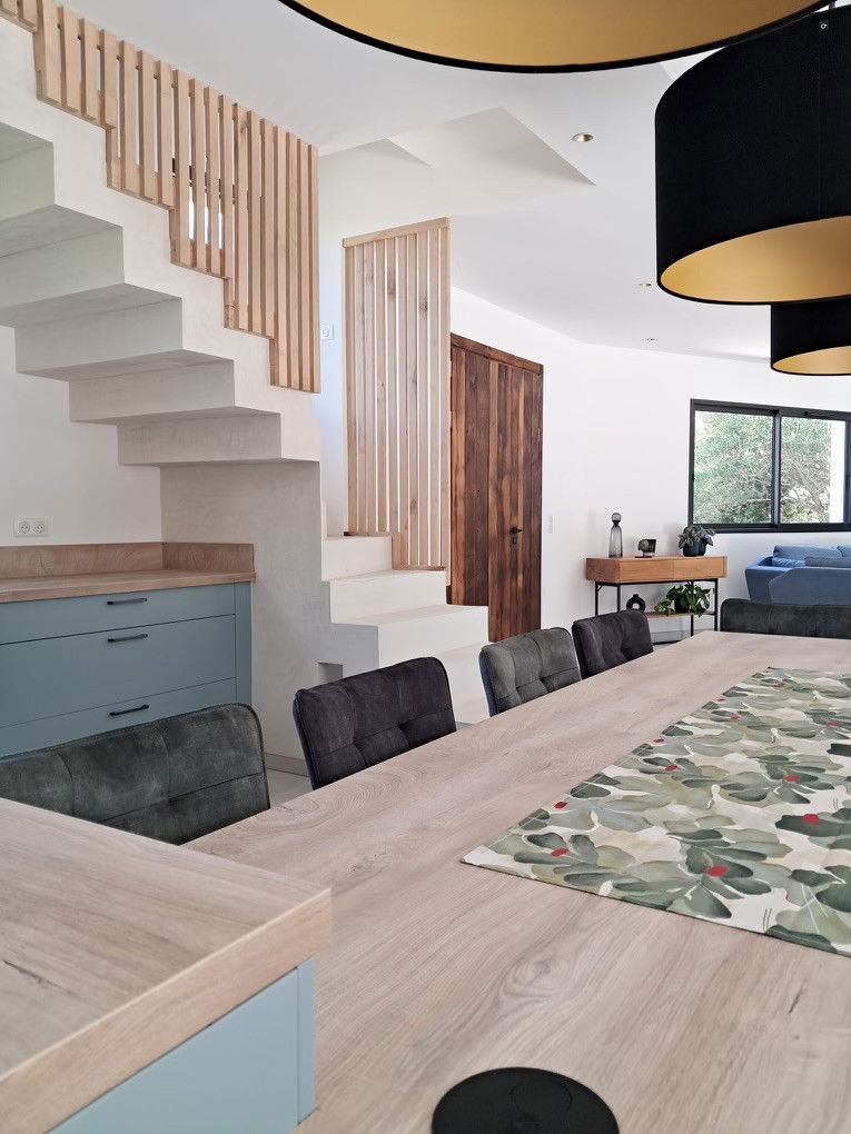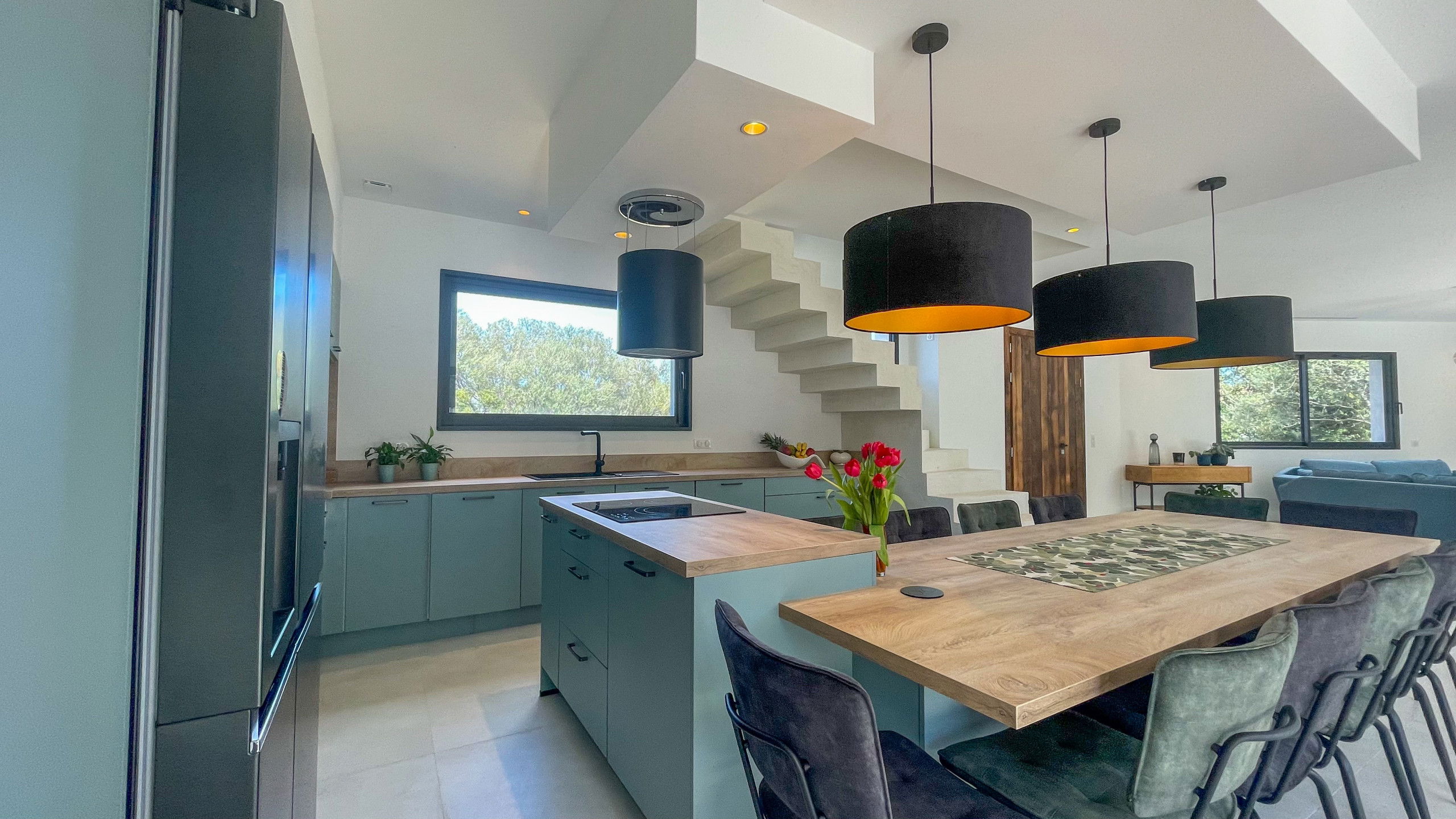- Un salon/salle à manger donnant sur la terrasse et la piscine