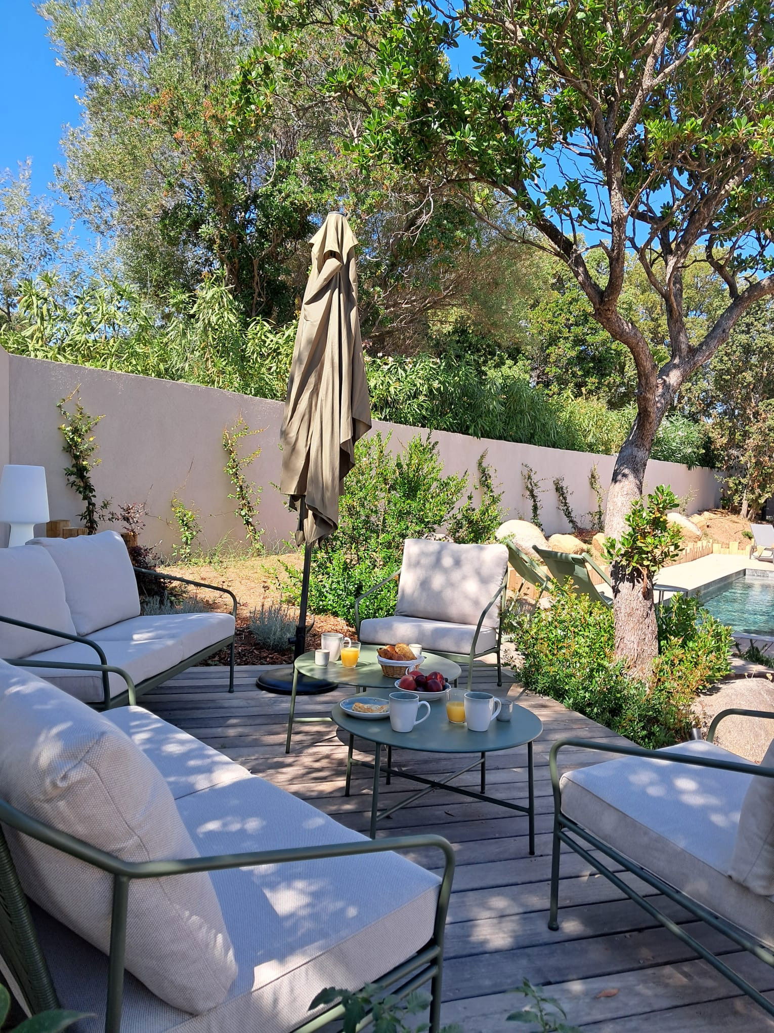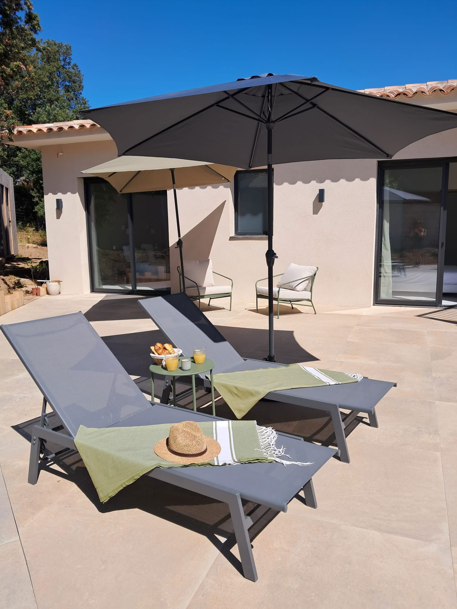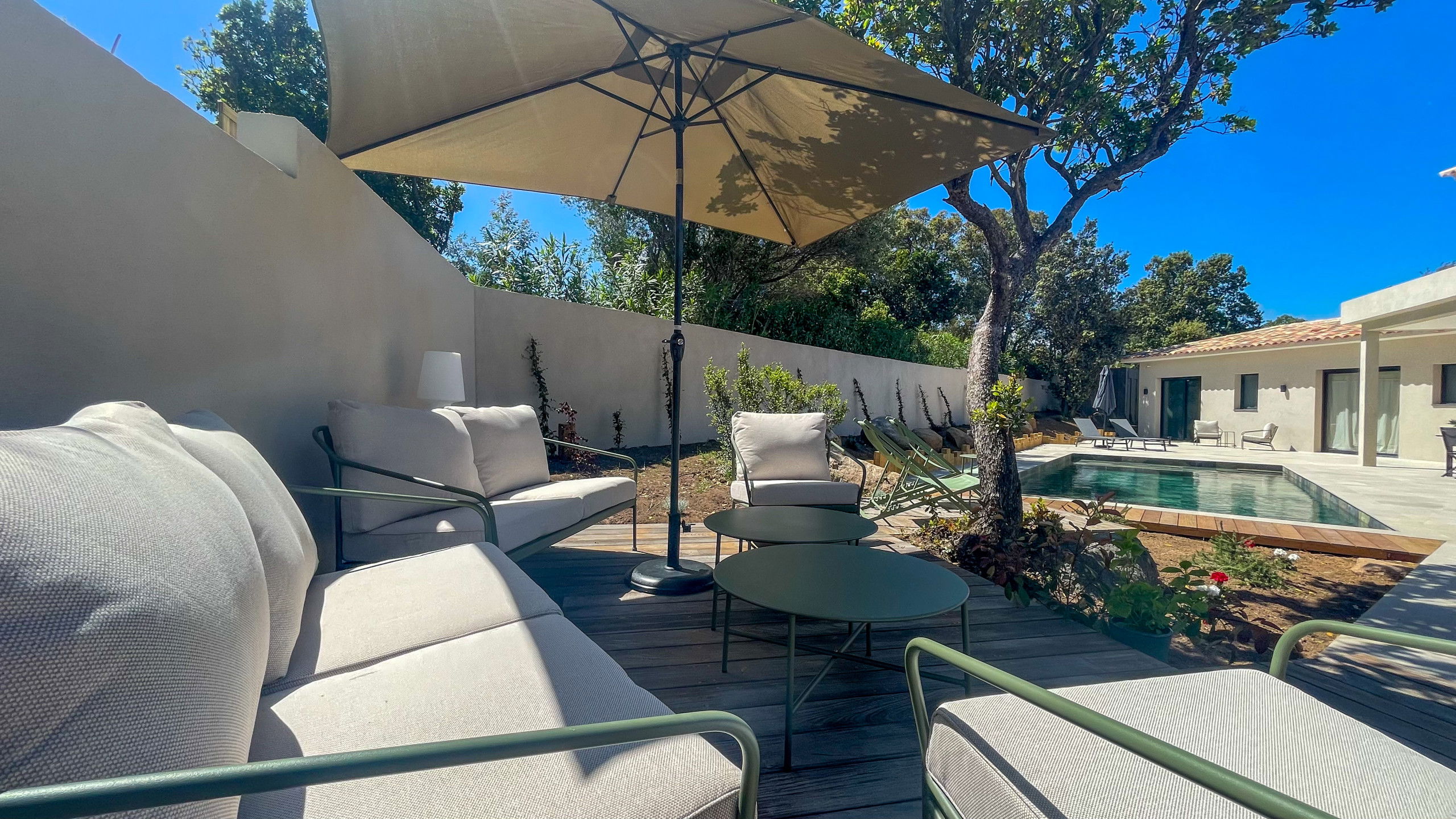 La terrasse est équipée de transats, un coin salon avec canapé, fauteuils et parasols.