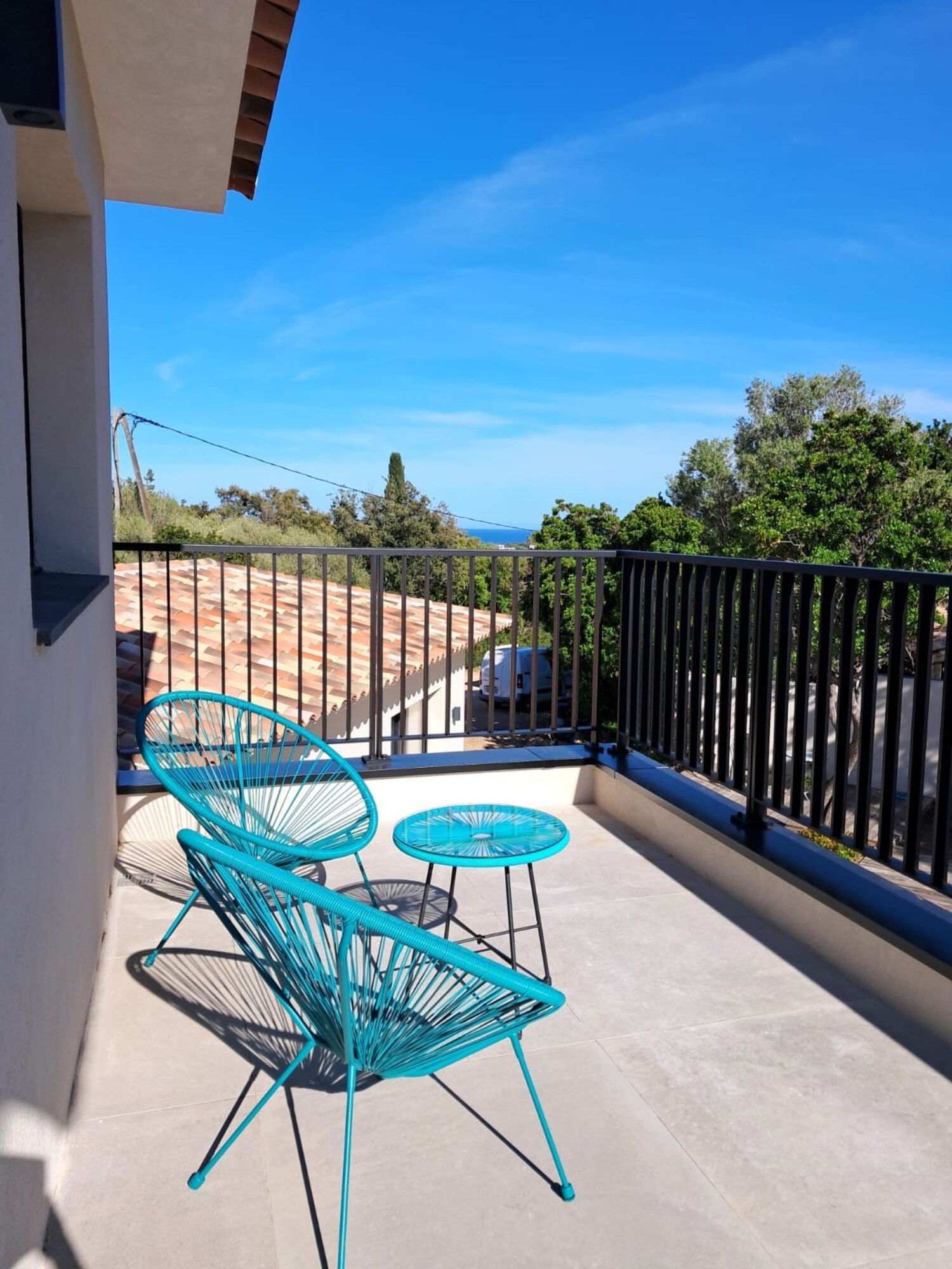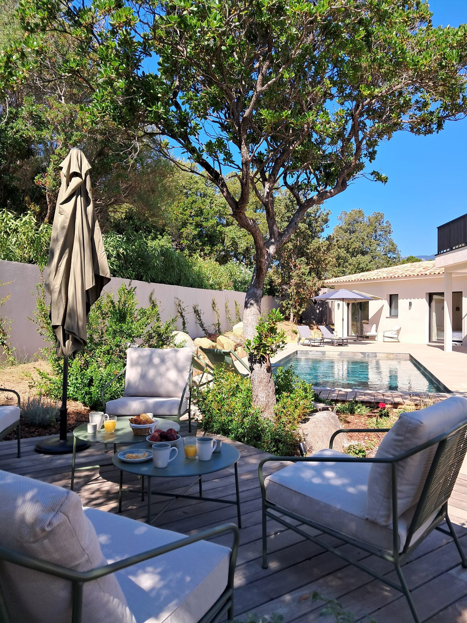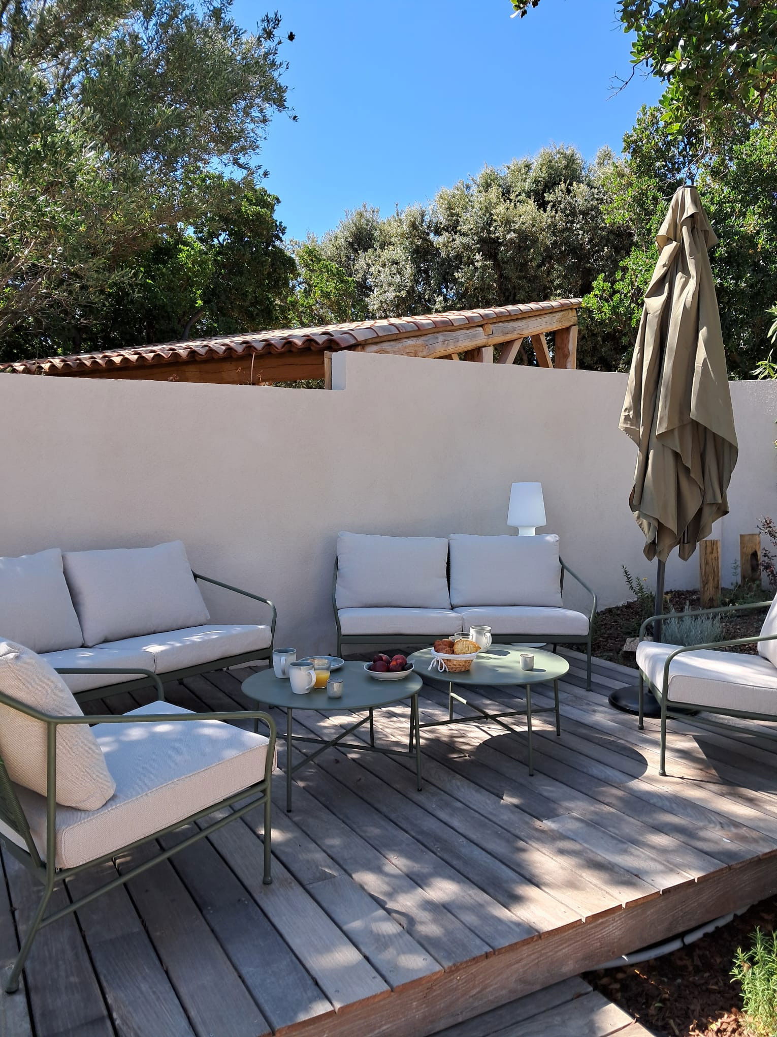 La terrasse est équipée de transats, un coin salon avec canapé, fauteuils et parasols.