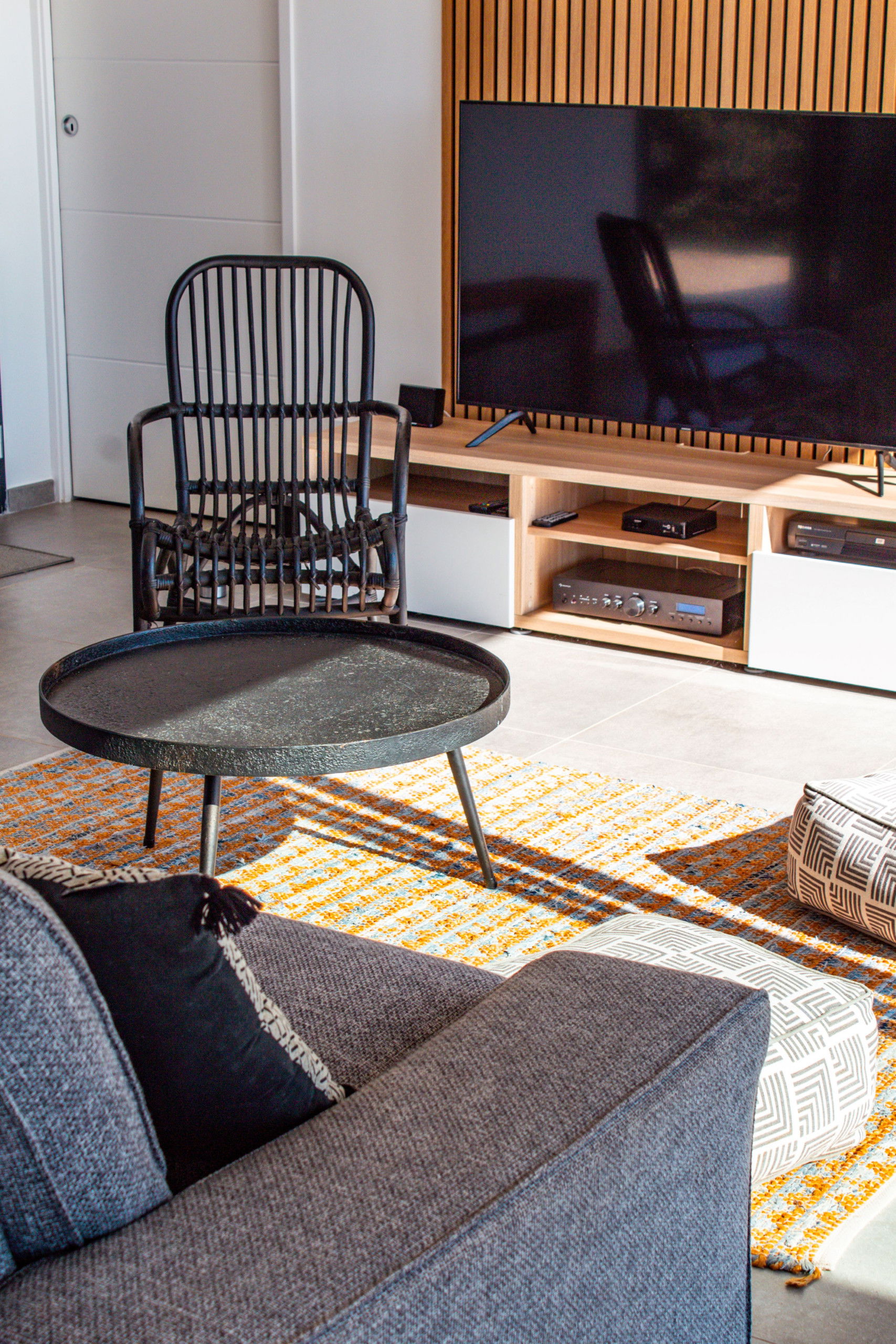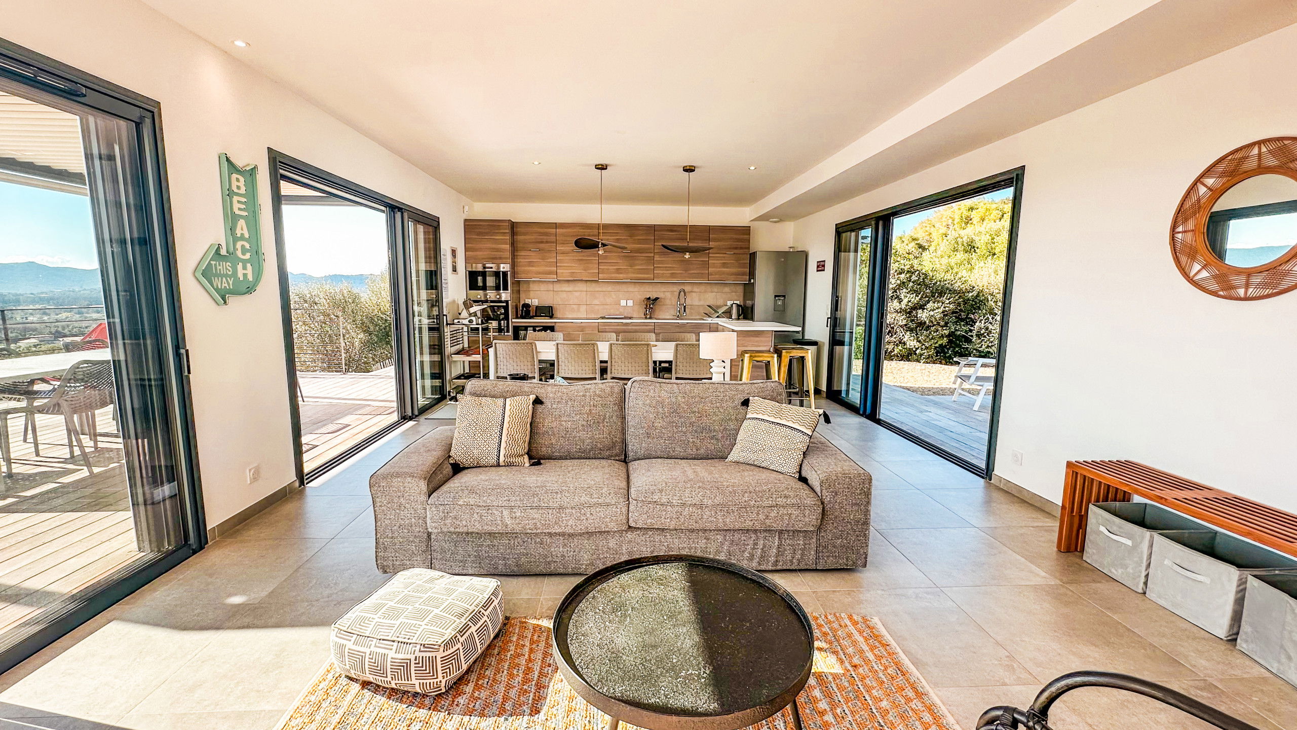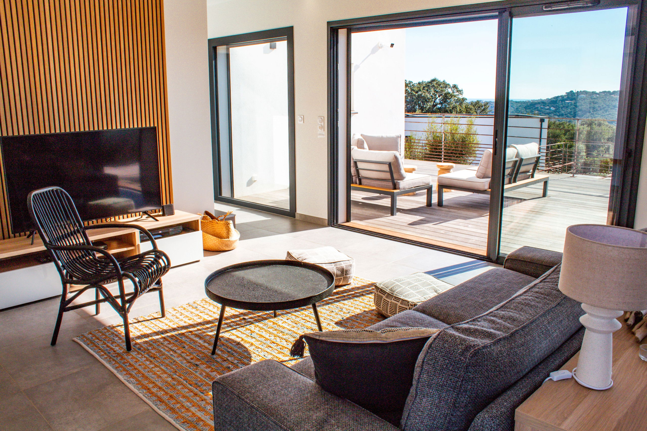 Un vaste séjour lumineux, ouvert sur la terrasse avec vue panoramique sur la mer et les montagnes.