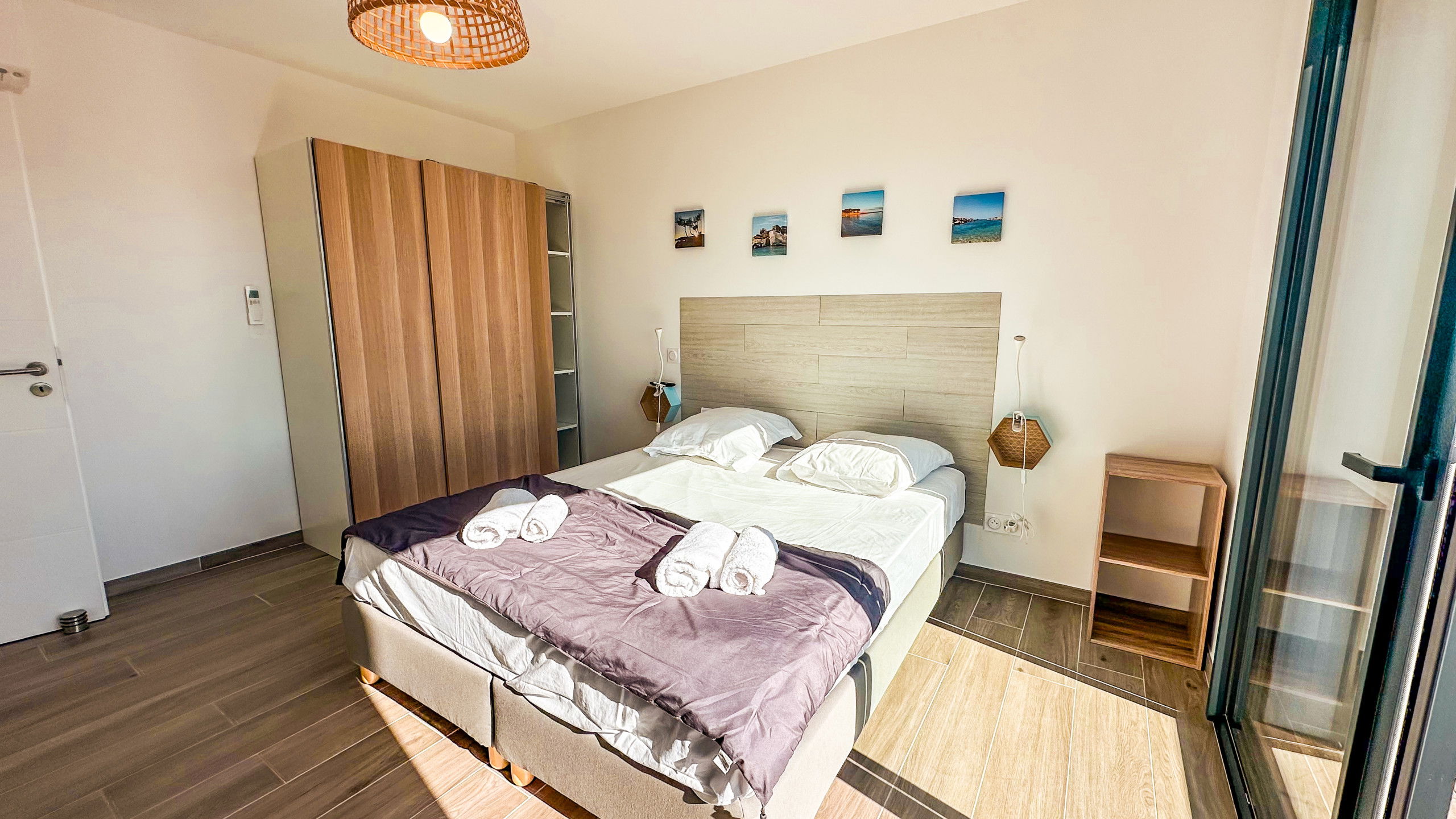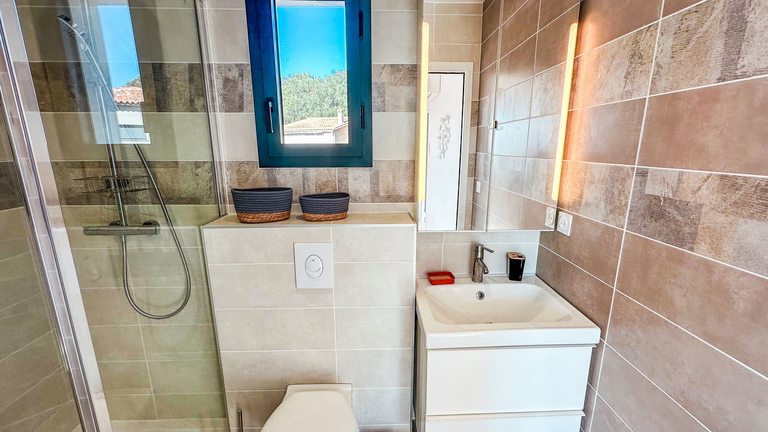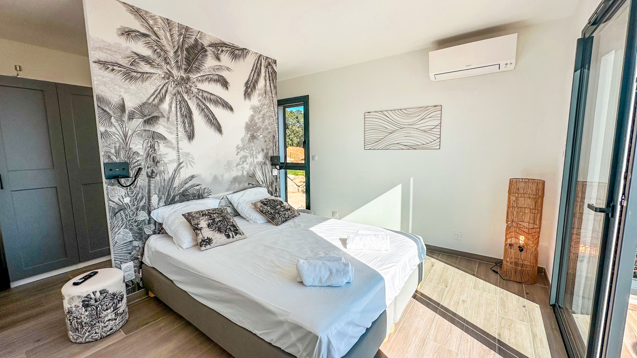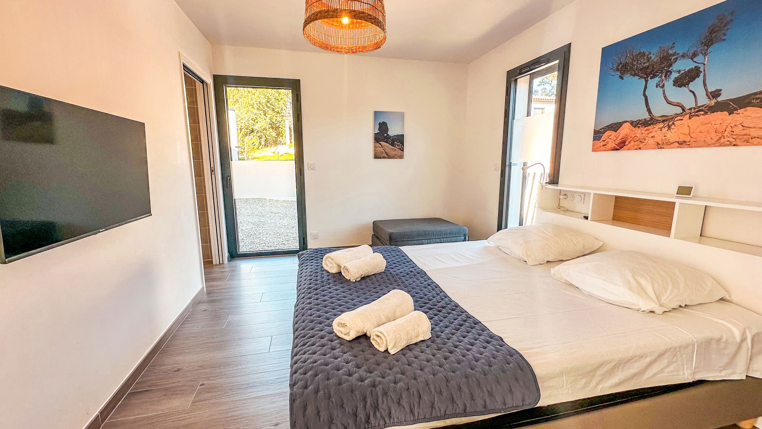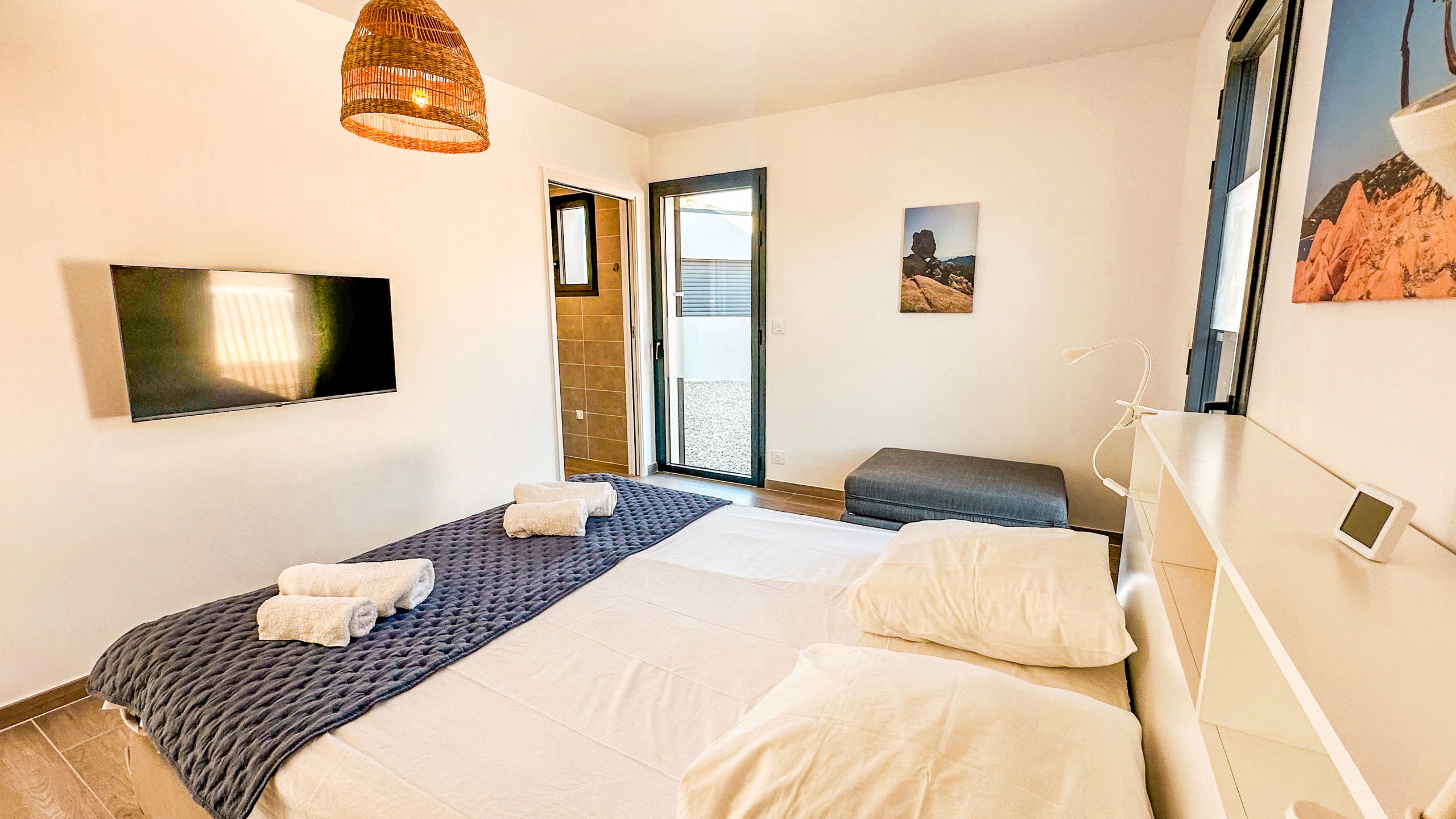 Chambre 1 (RDC) : Lit double (160x200), placard intégré, salle de bain avec douche à l’italienne, accès terrasse et vue mer.
