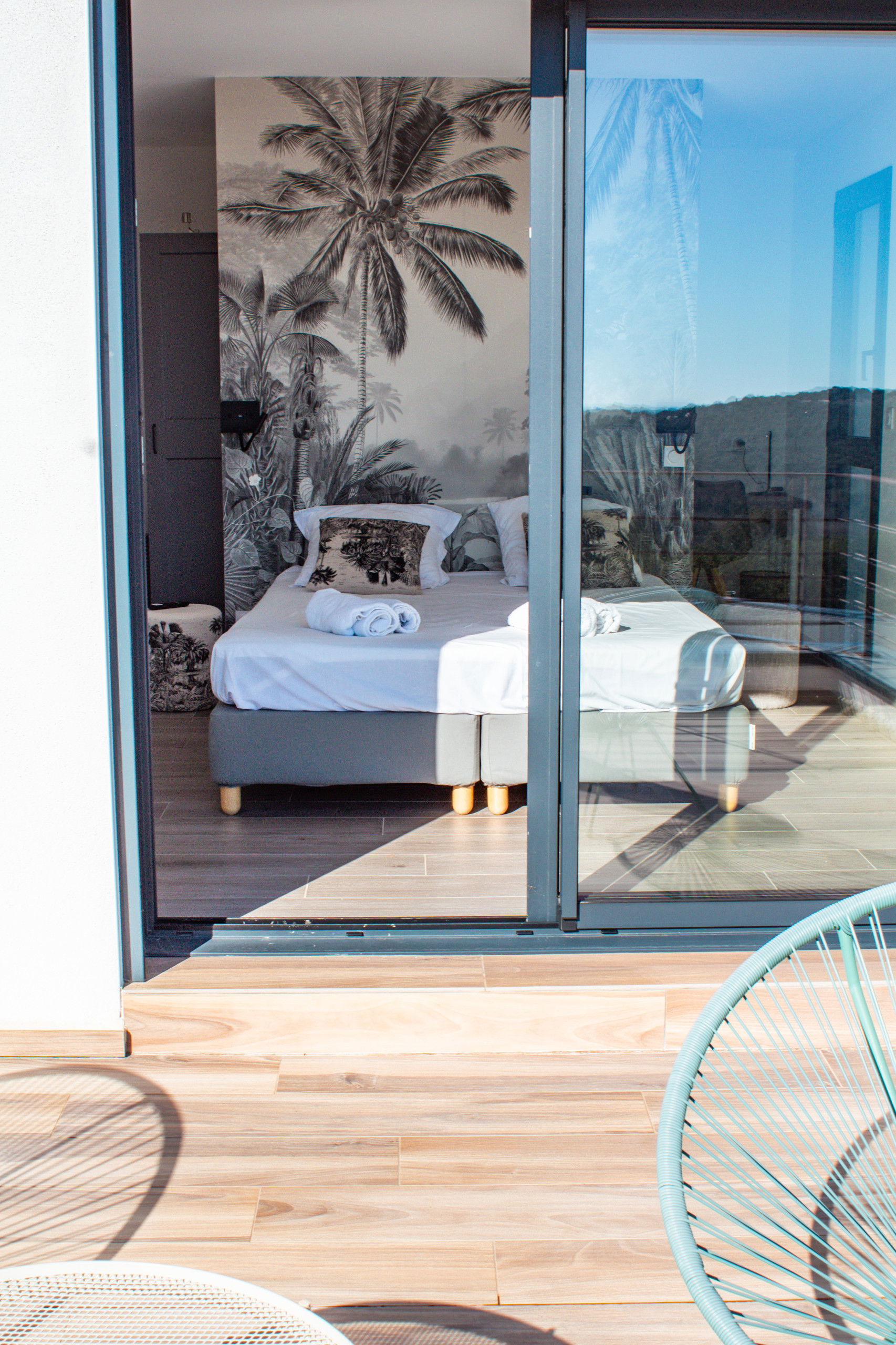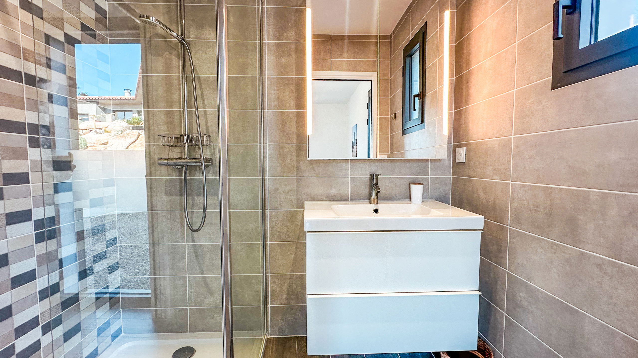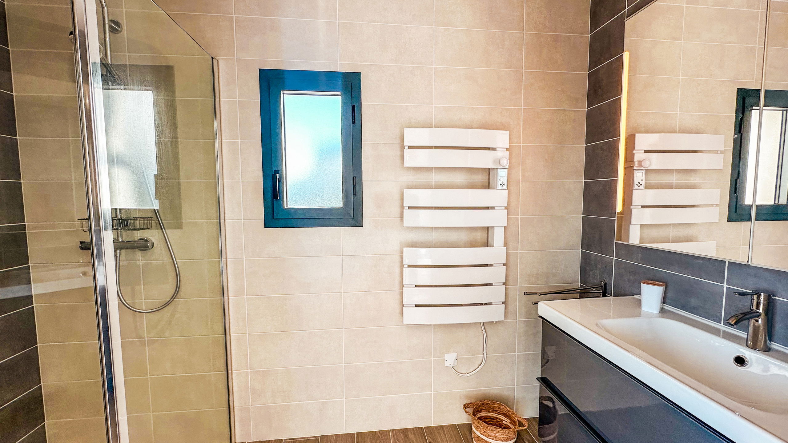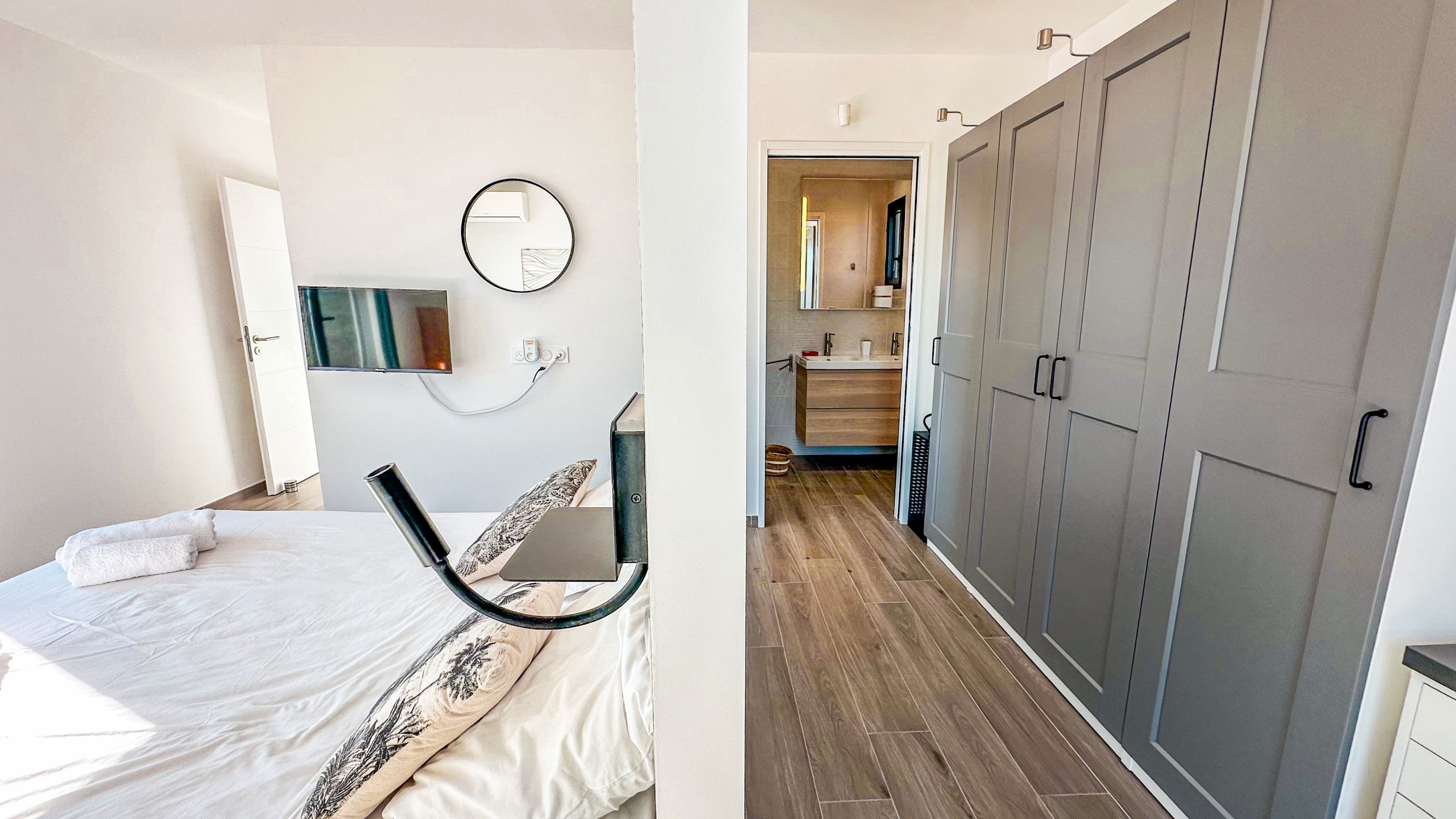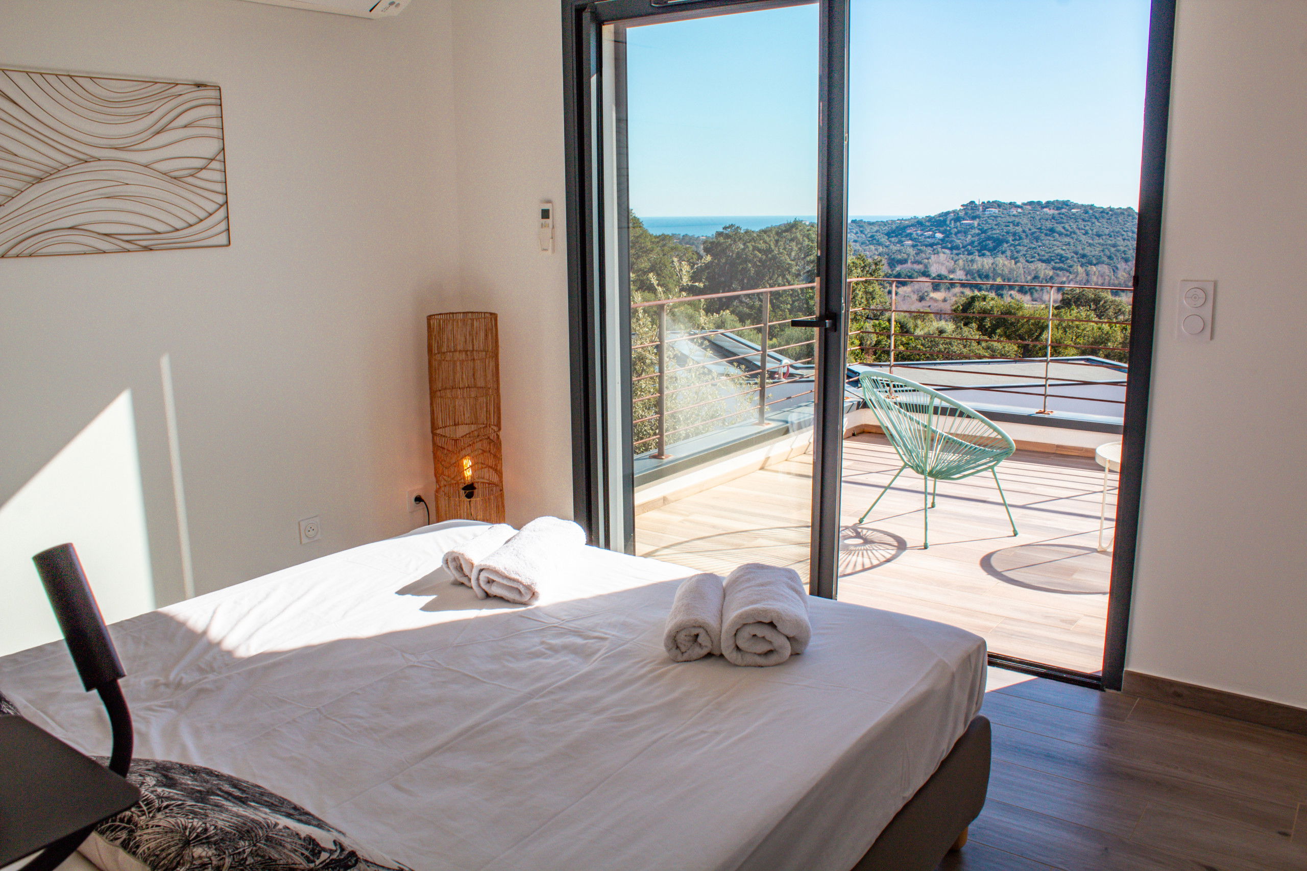 Chambre 1 (RDC) : Lit double (160x200), placard intégré, salle de bain avec douche à l’italienne, accès terrasse et vue mer.