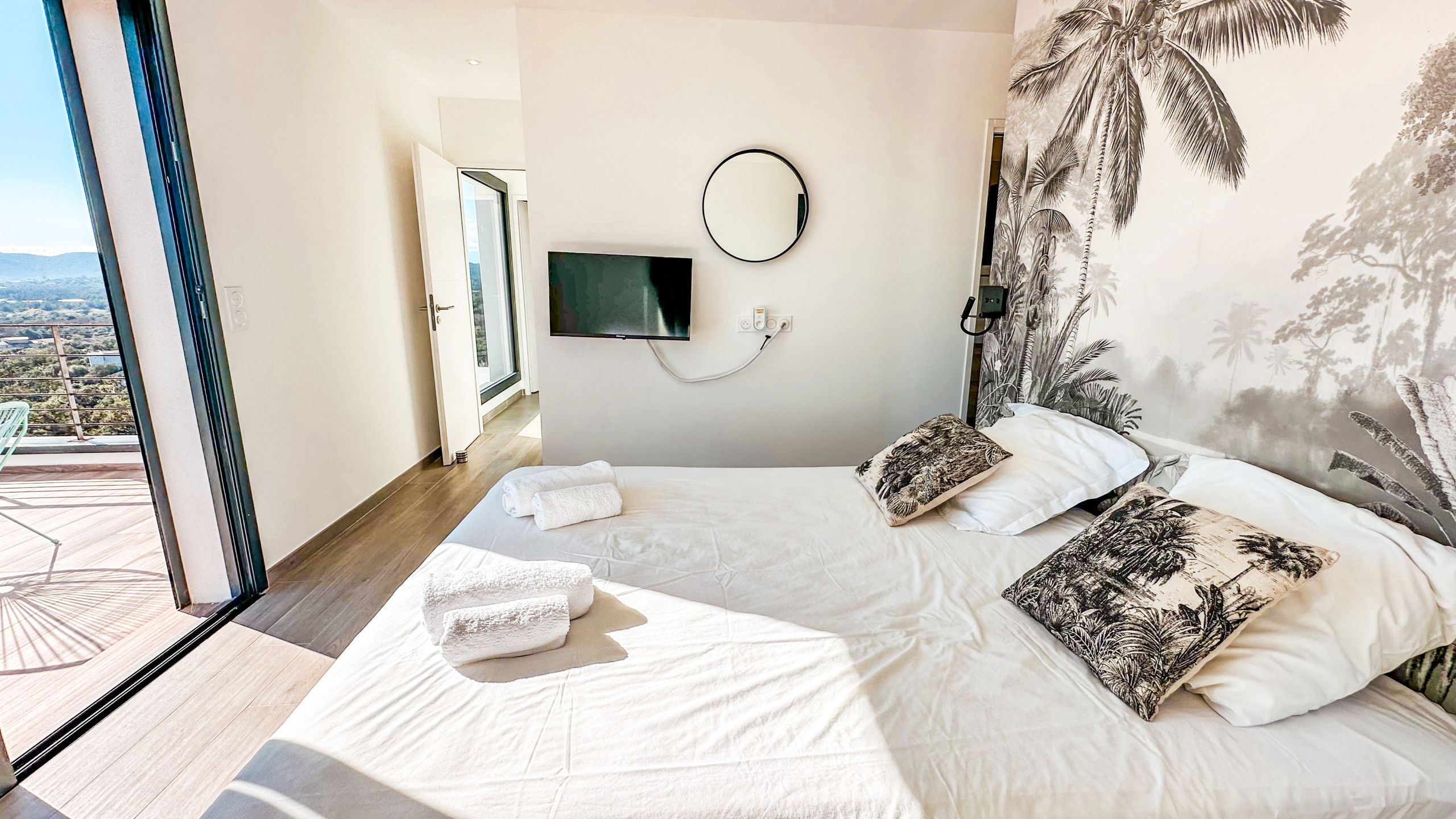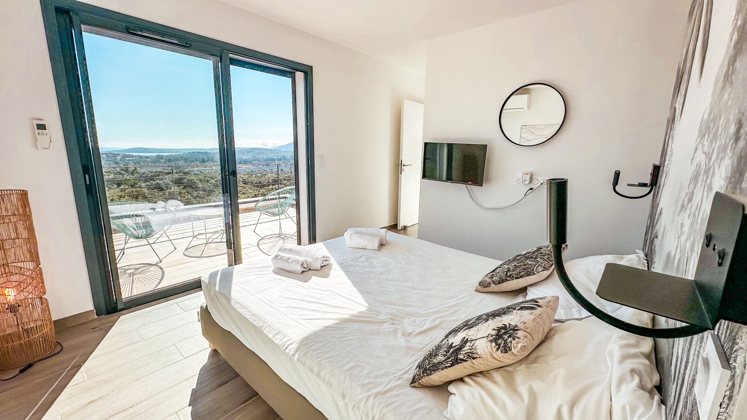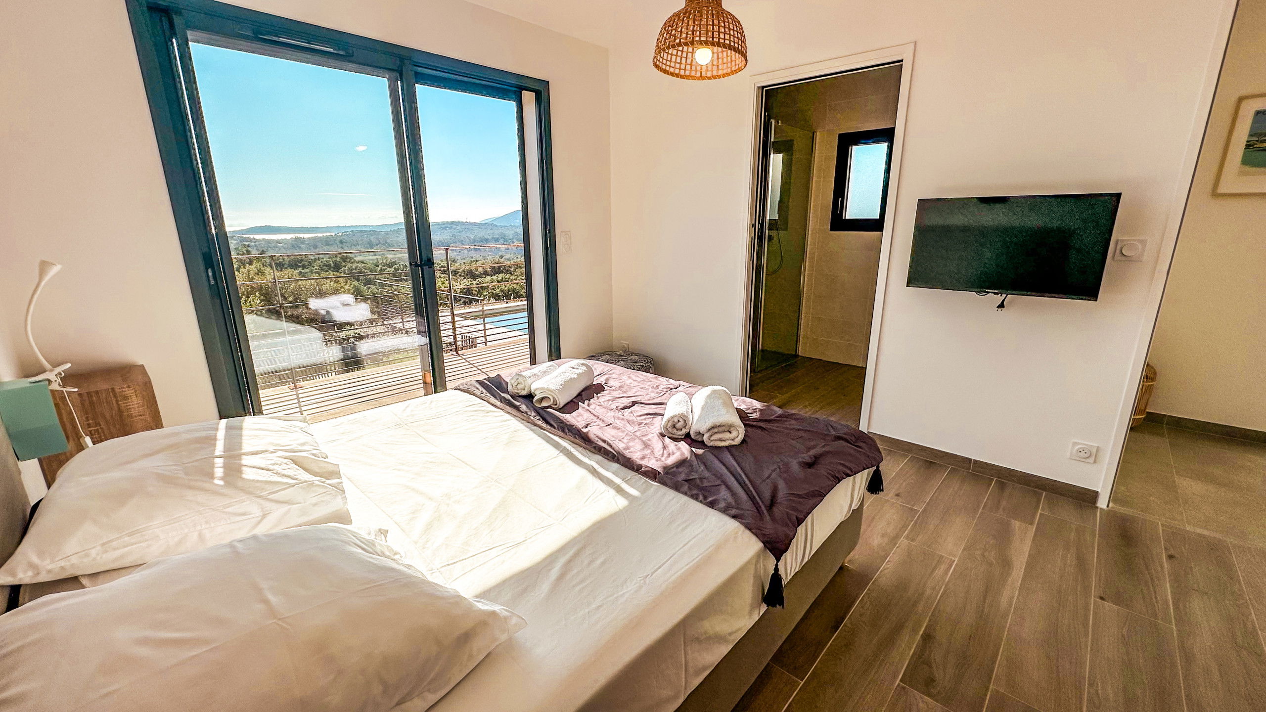 Chambre 3 parentale (Étage) : Lit double (160x200), dressing éclairé, salle de bain avec douche à l’italienne, double vasque, WC séparé, bureau aménagé avec accès Internet, baie vitrée sur terrasse privative avec vue mer.