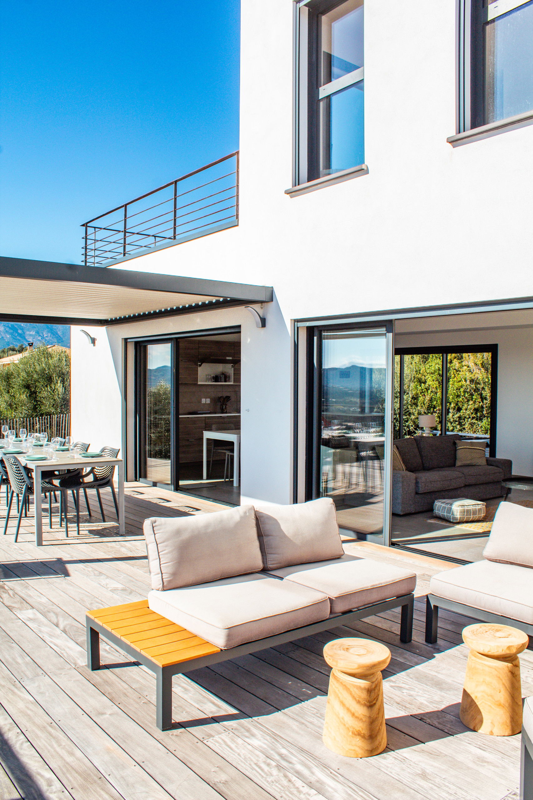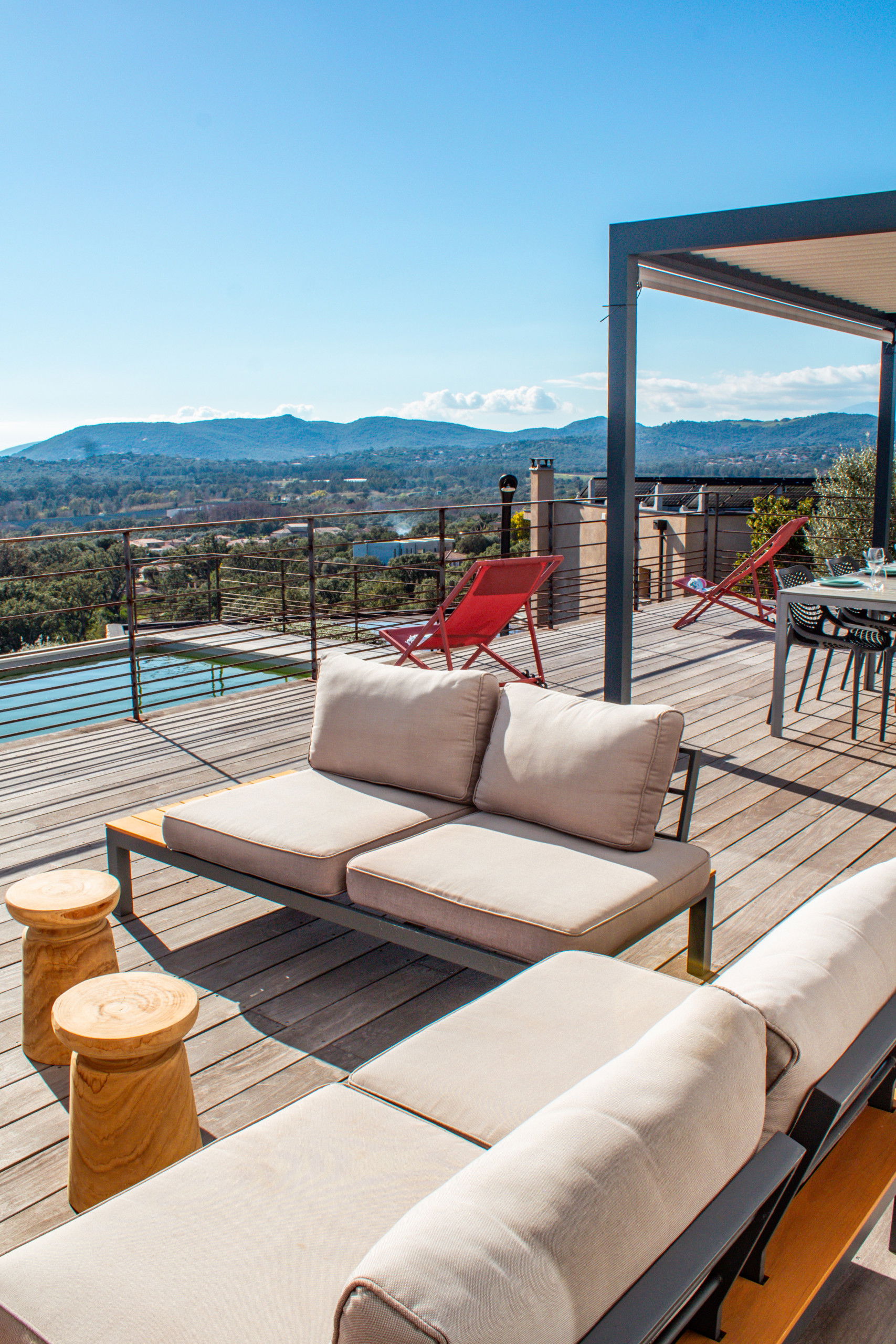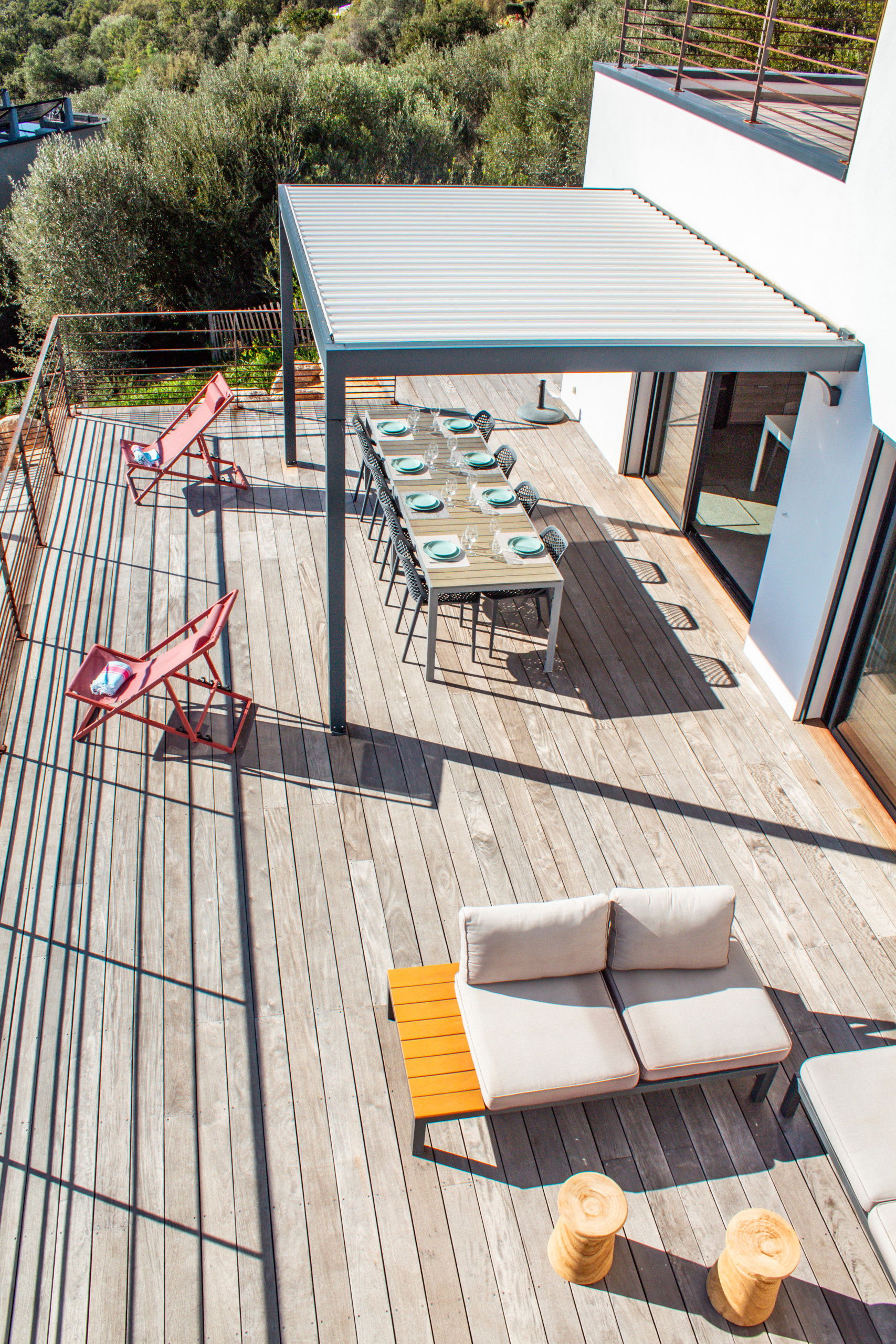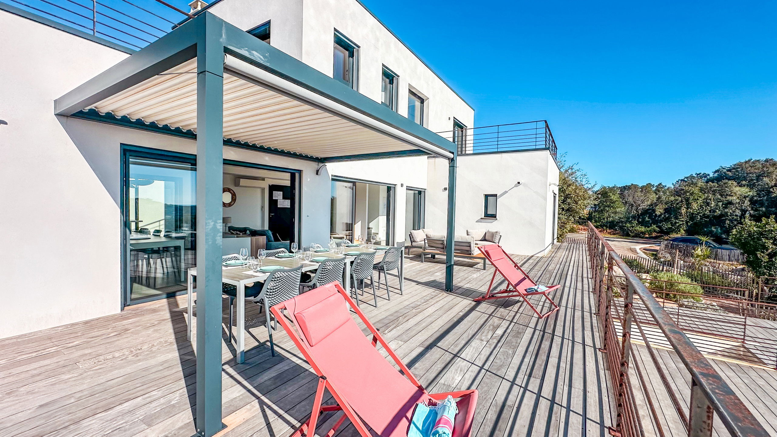 Terrasse principale de 150 m² en bois exotique, orientée vers la mer et les montagnes, équipée de :
