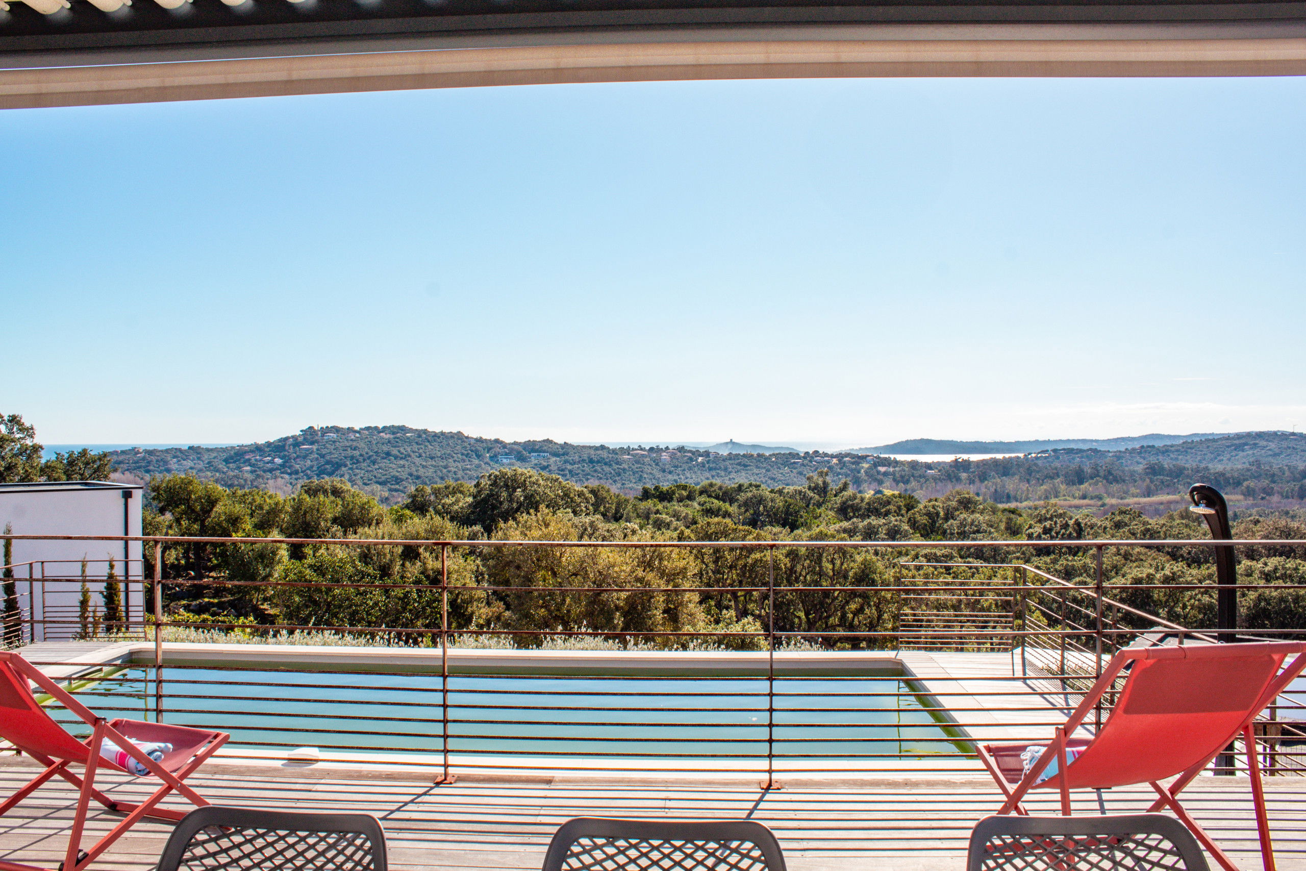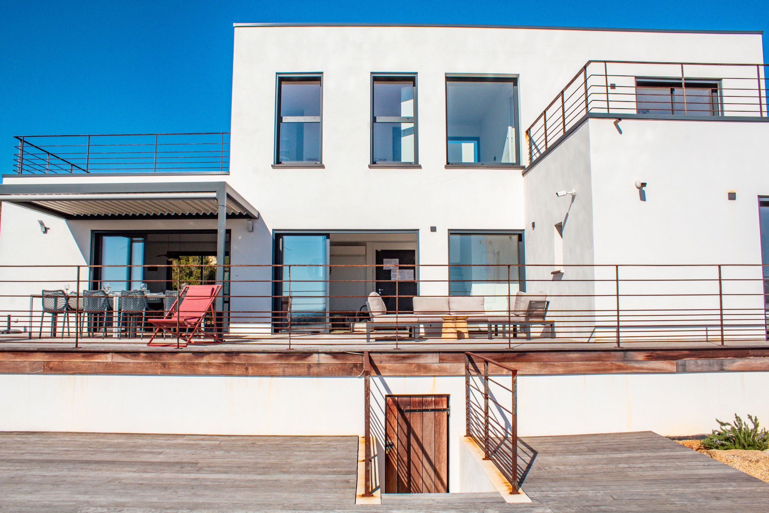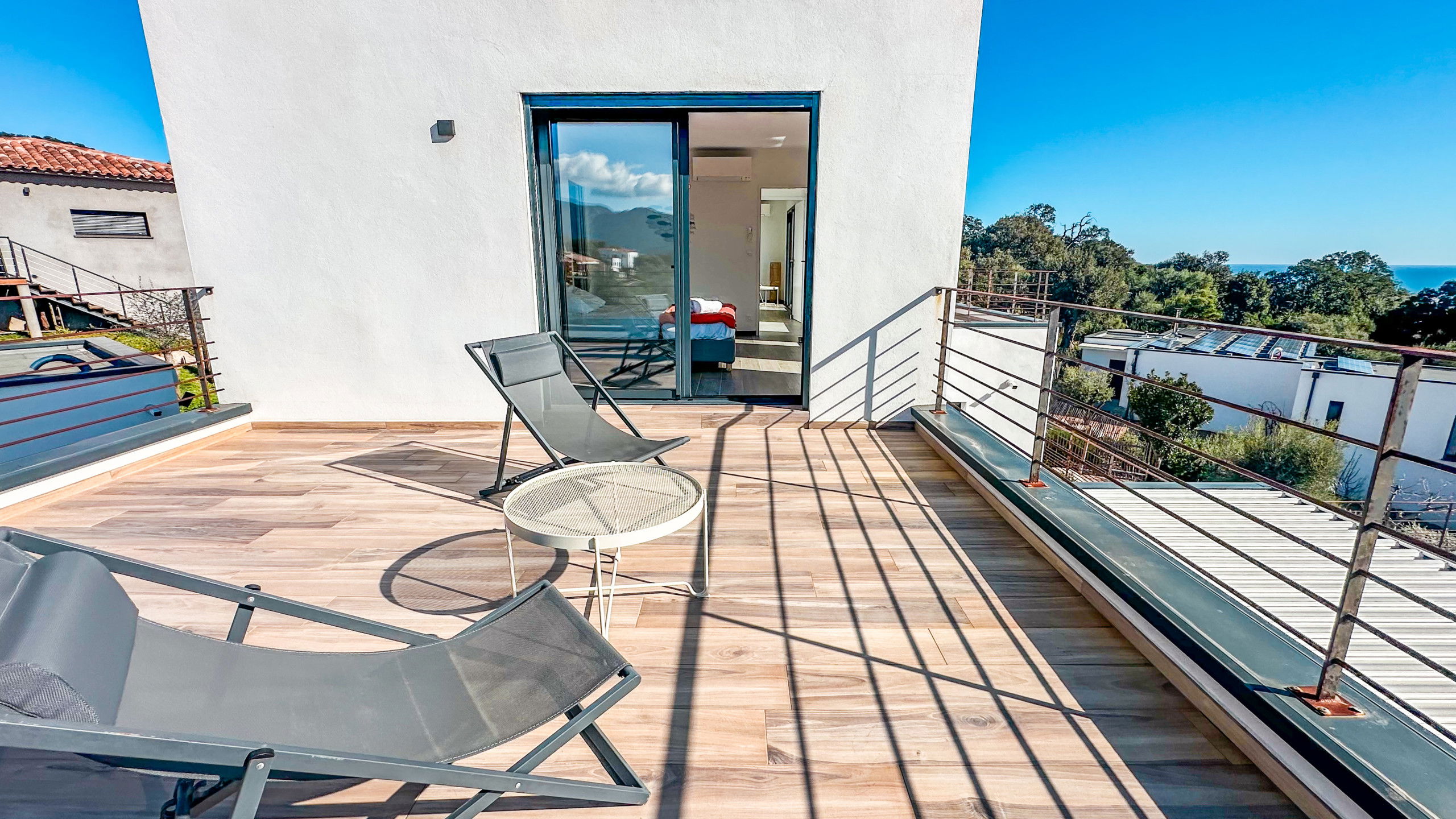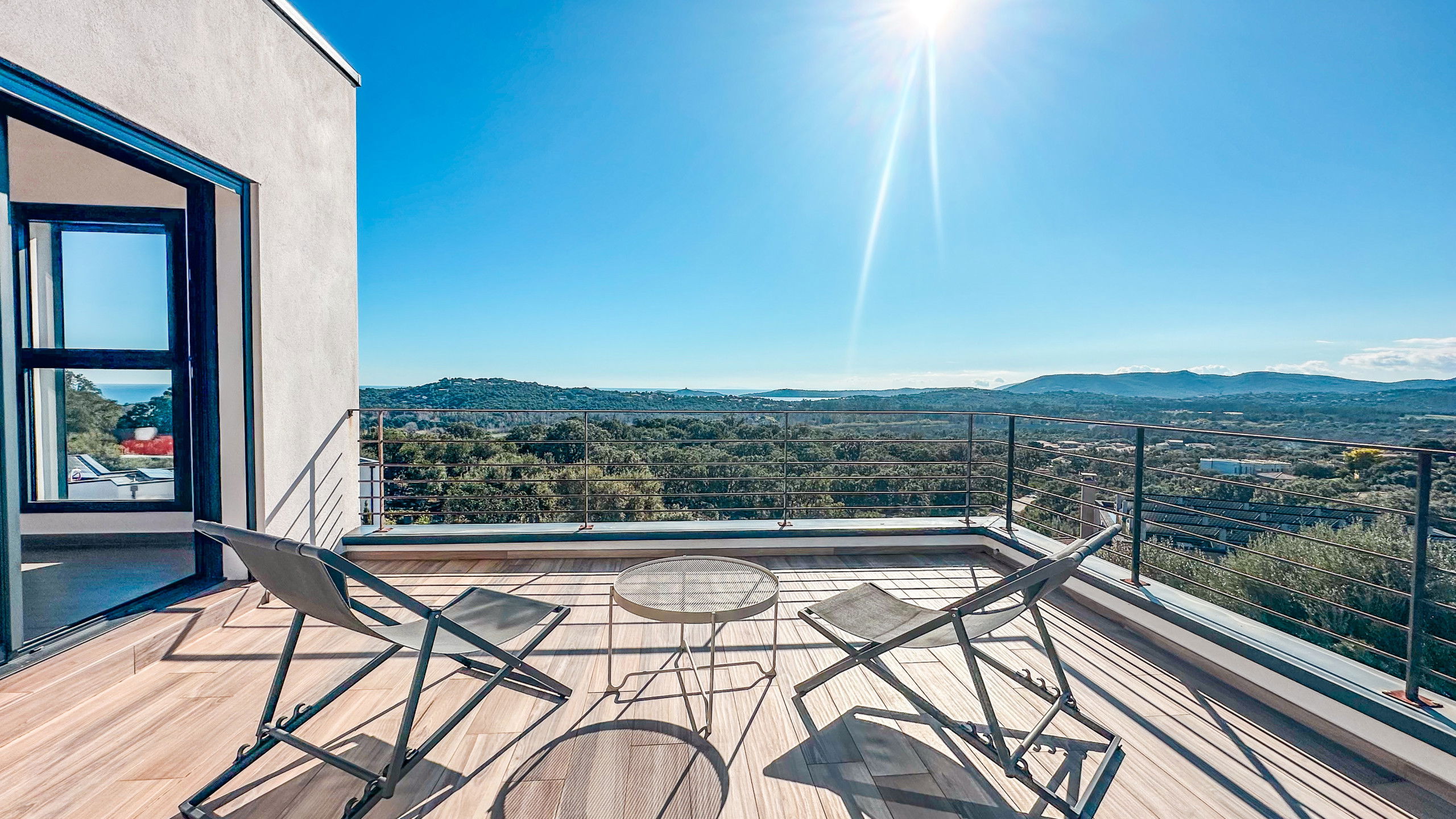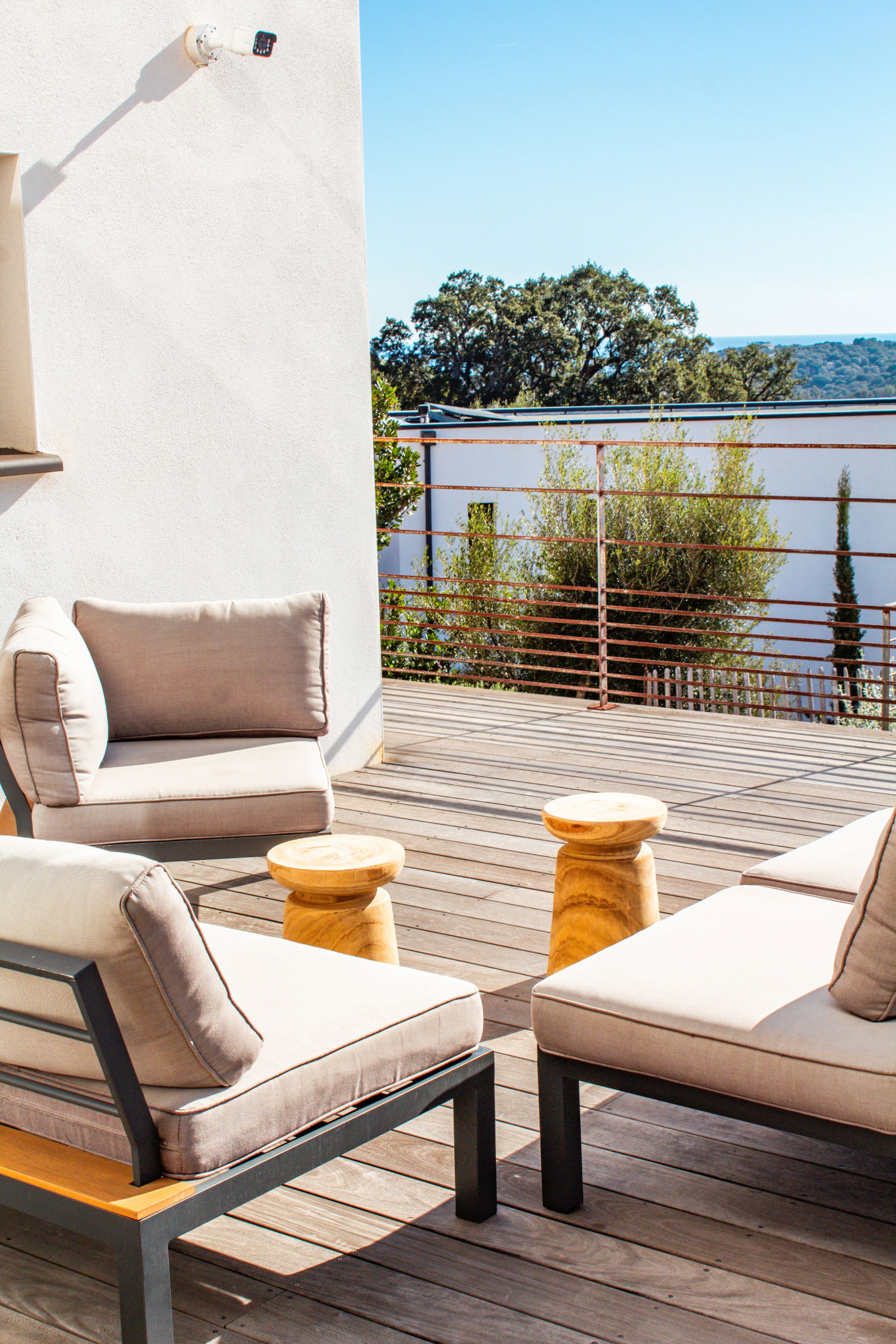 Terrasse principale de 150 m² en bois exotique, orientée vers la mer et les montagnes, équipée de :
