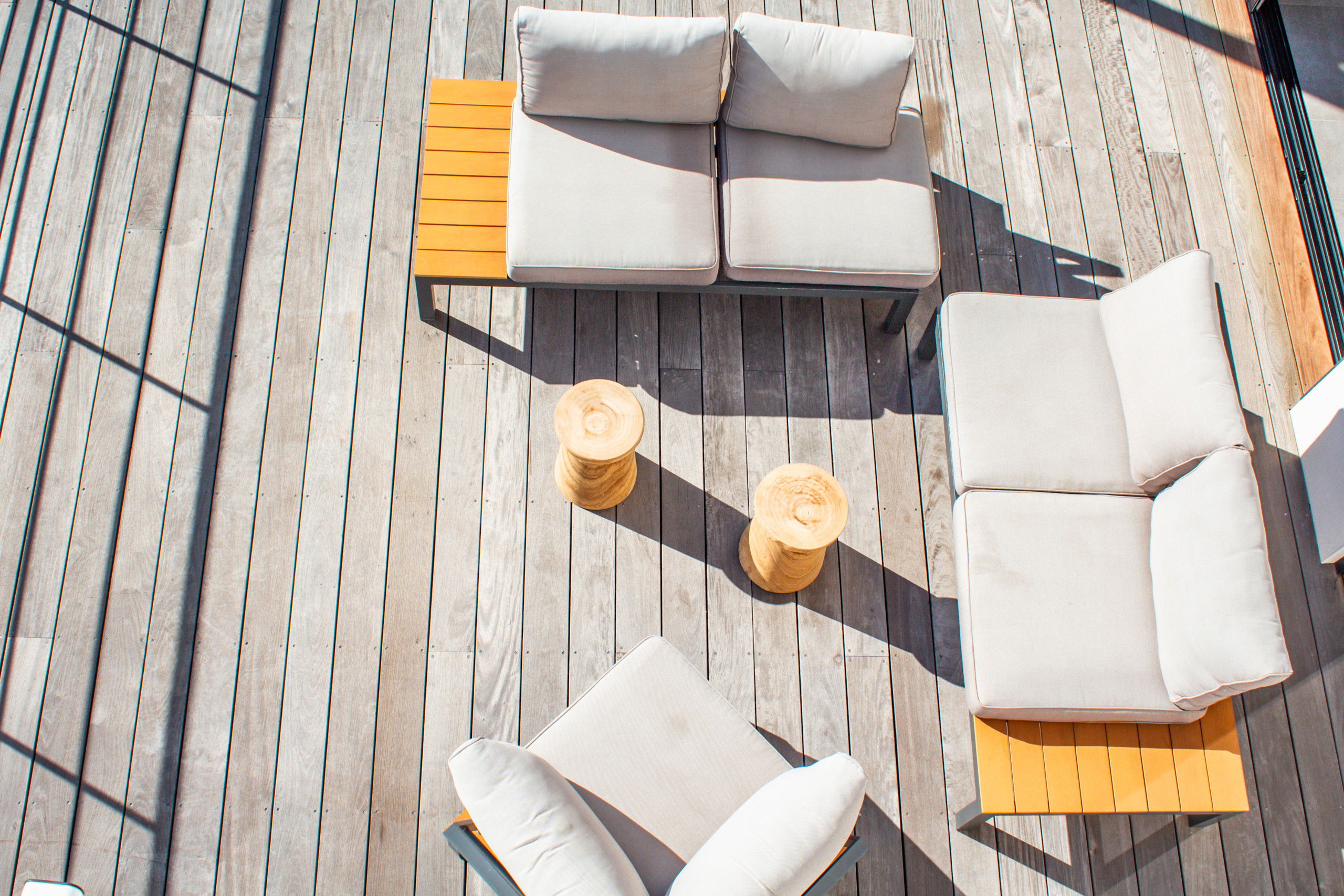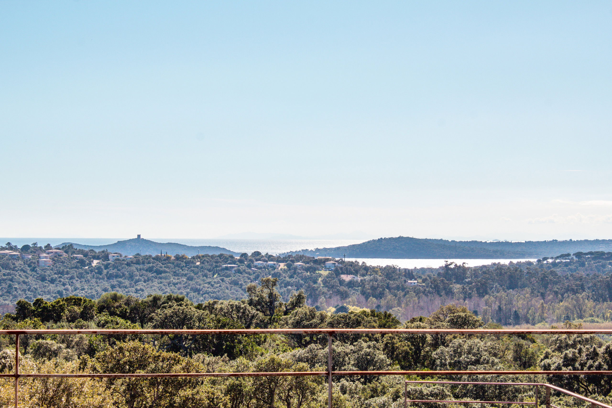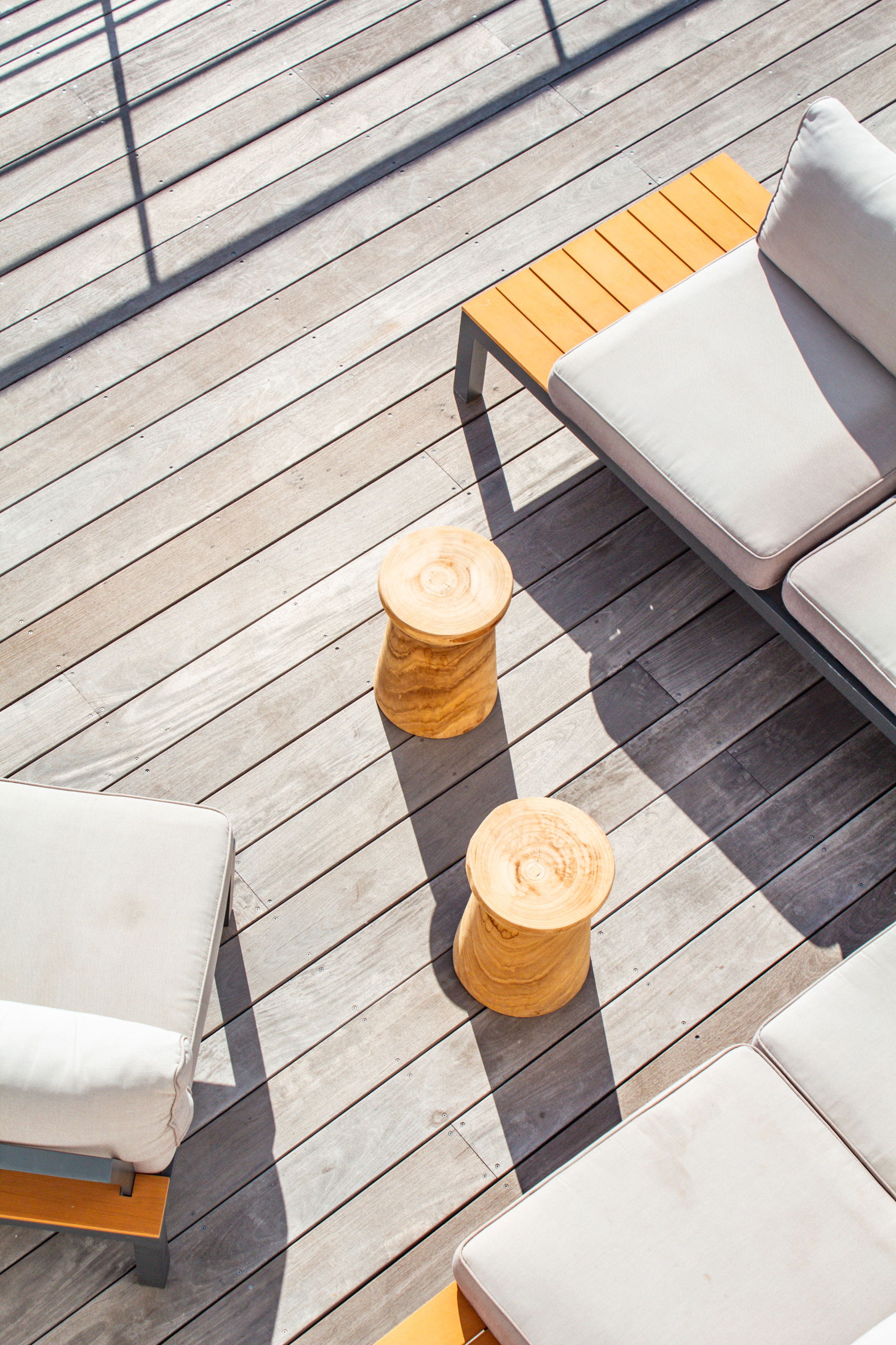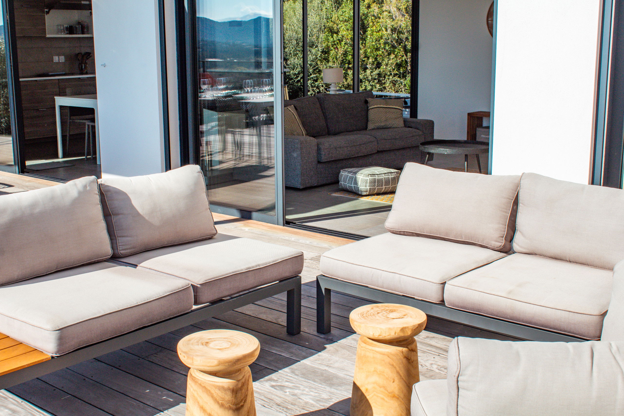 Terrasse principale de 150 m² en bois exotique, orientée vers la mer et les montagnes, équipée de :