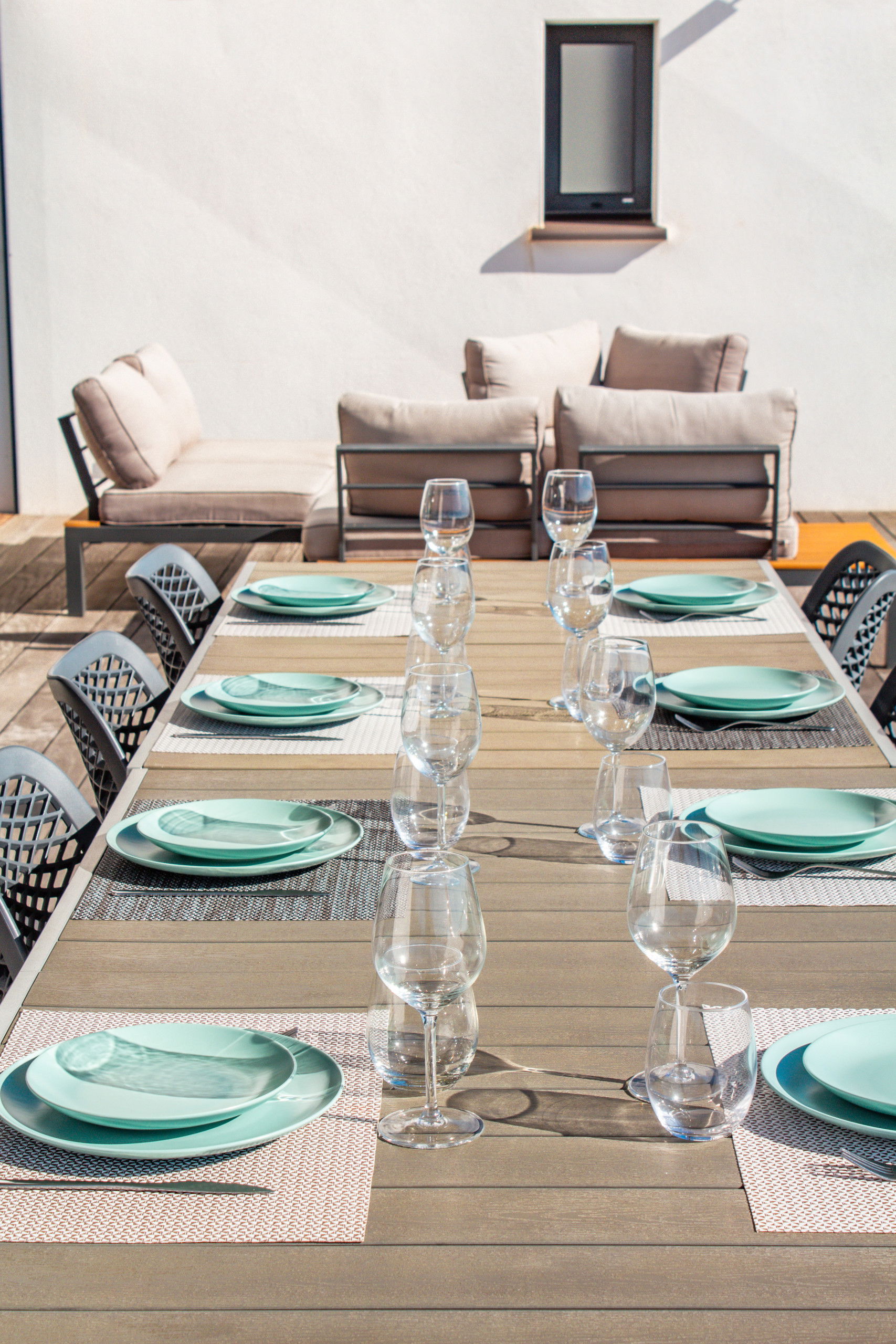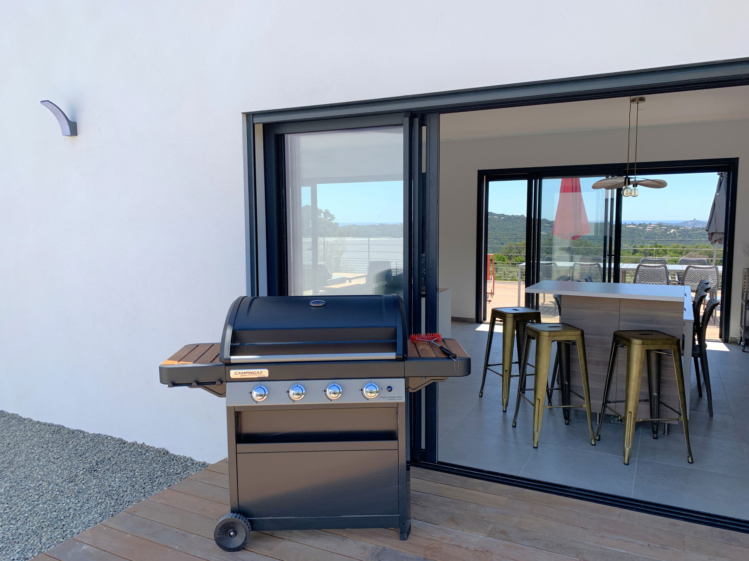 Deuxième terrasse ombragée au nord, équipée d’un barbecue au gaz et d’un espace repas supplémentaire.