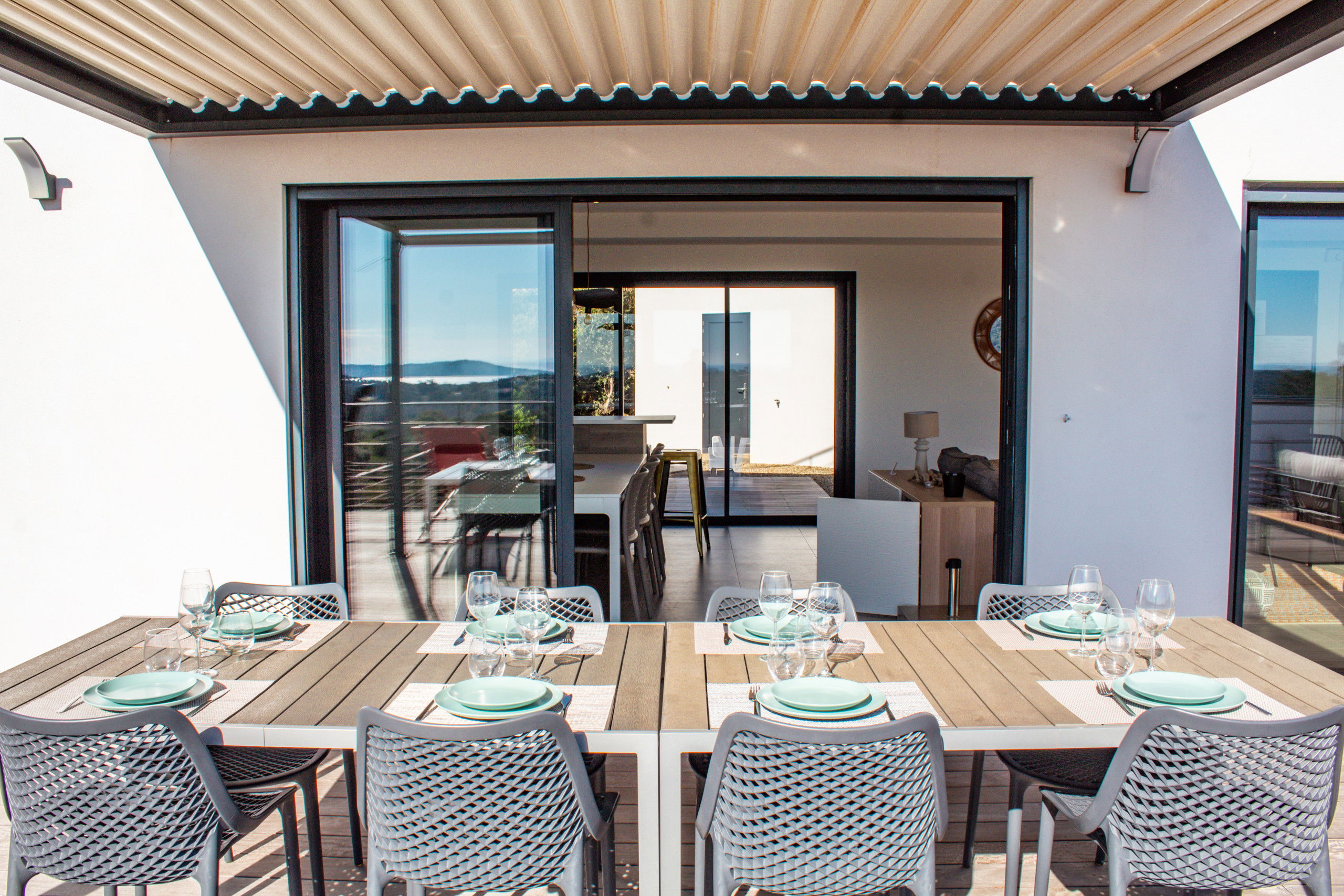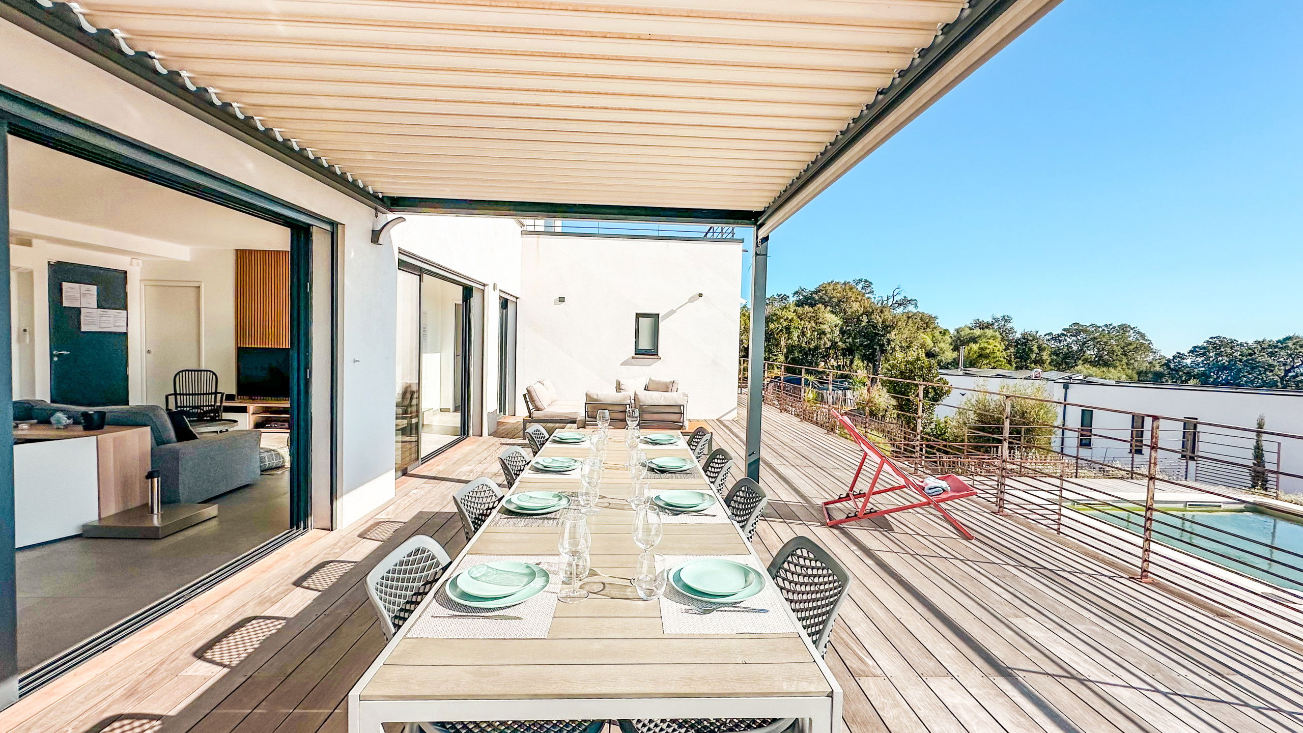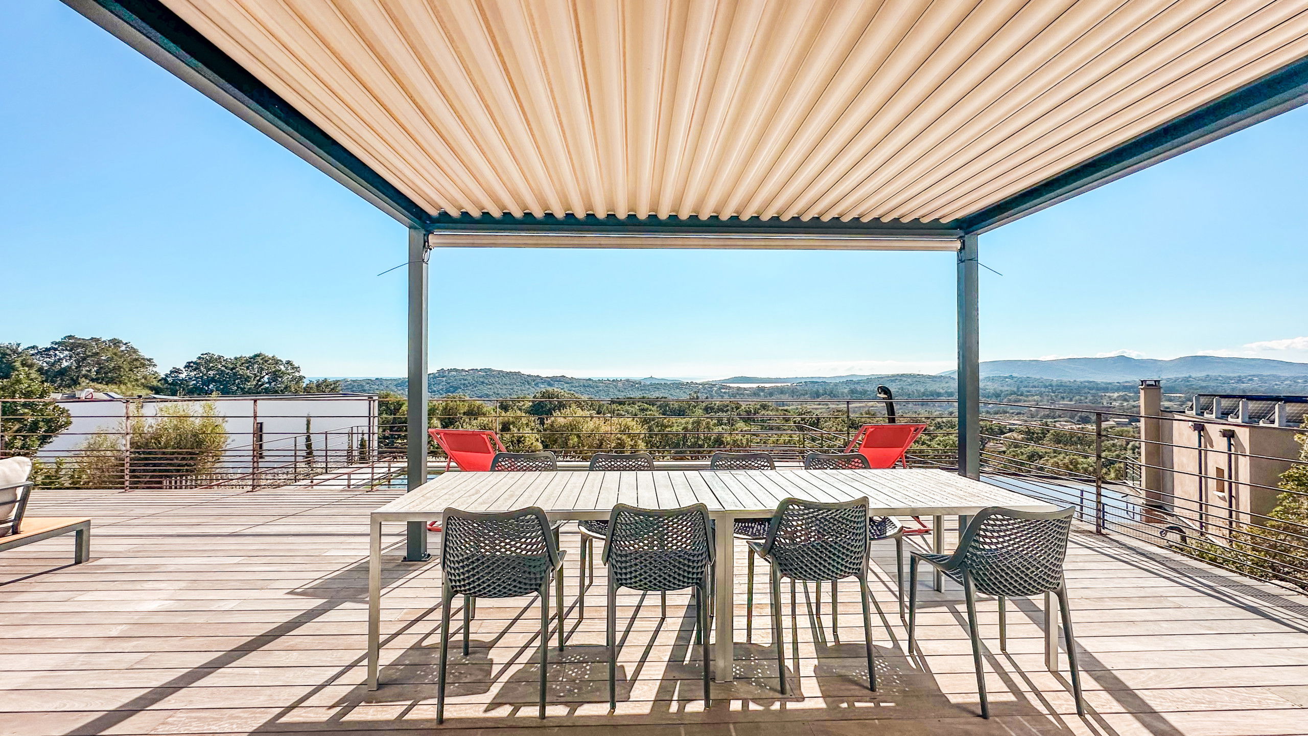 Une grande table à manger ombragée sous une pergola bioclimatique.