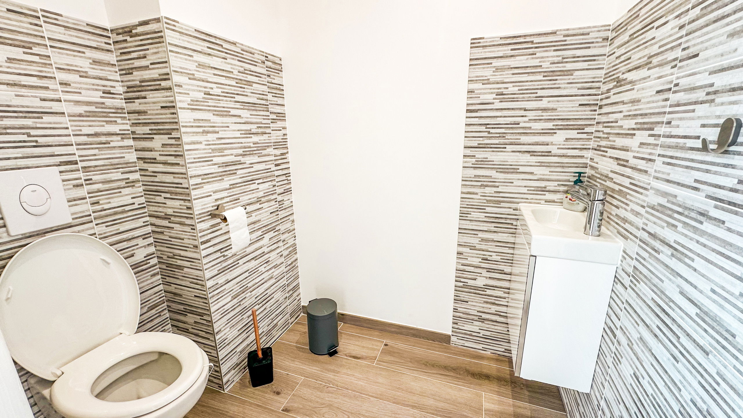 Chambre 2 (RDC) : Lit double (160x200) + lit simple d’appoint (90x200), placard intégré, salle de douche avec douche à l’italienne, WC séparé, grandes fenêtres offrant une belle luminosité.