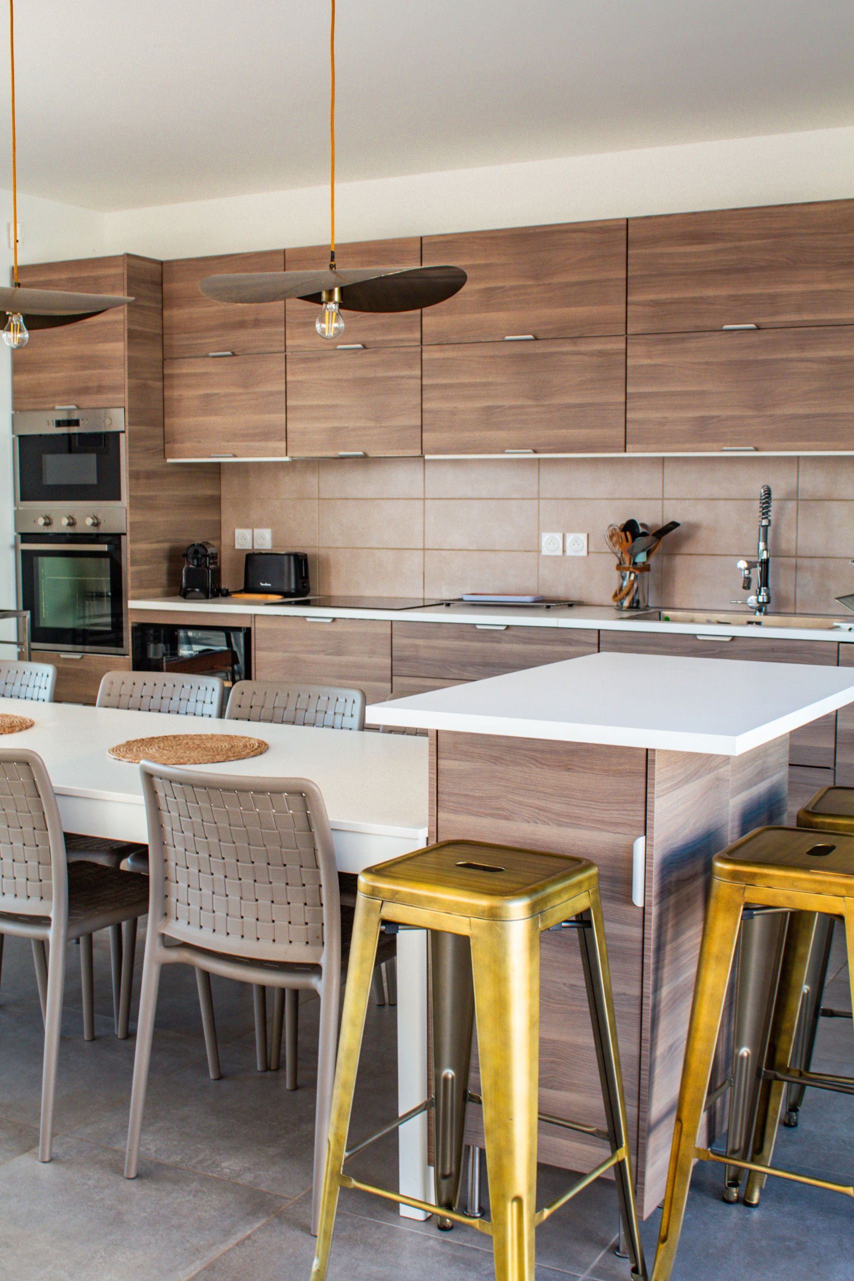 Réfrigérateur avec congélateur, four, micro-ondes, lave-vaisselle.