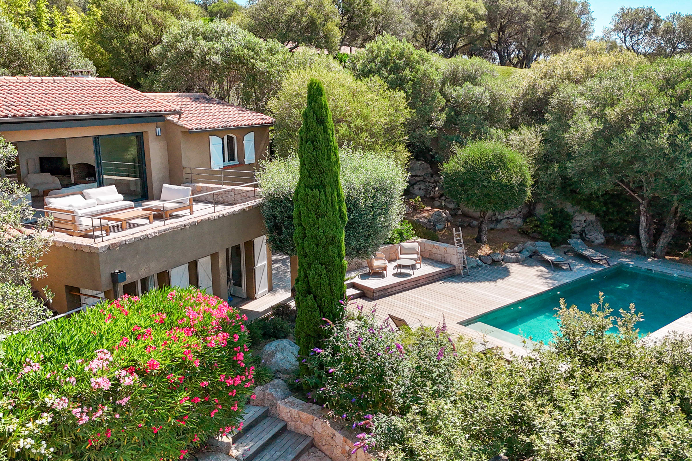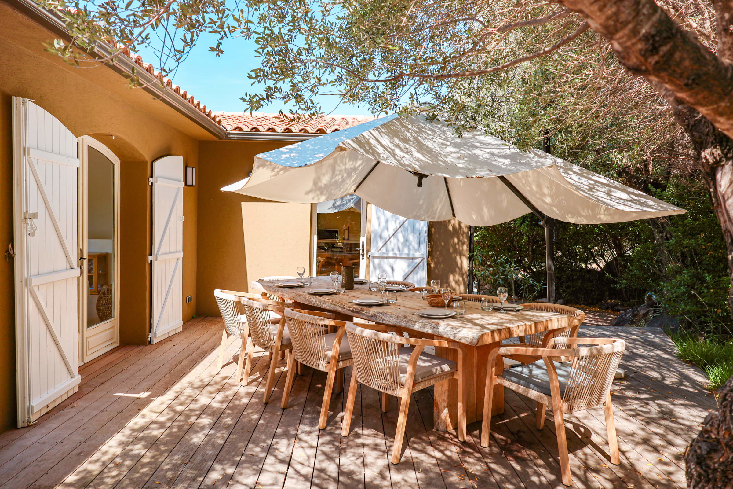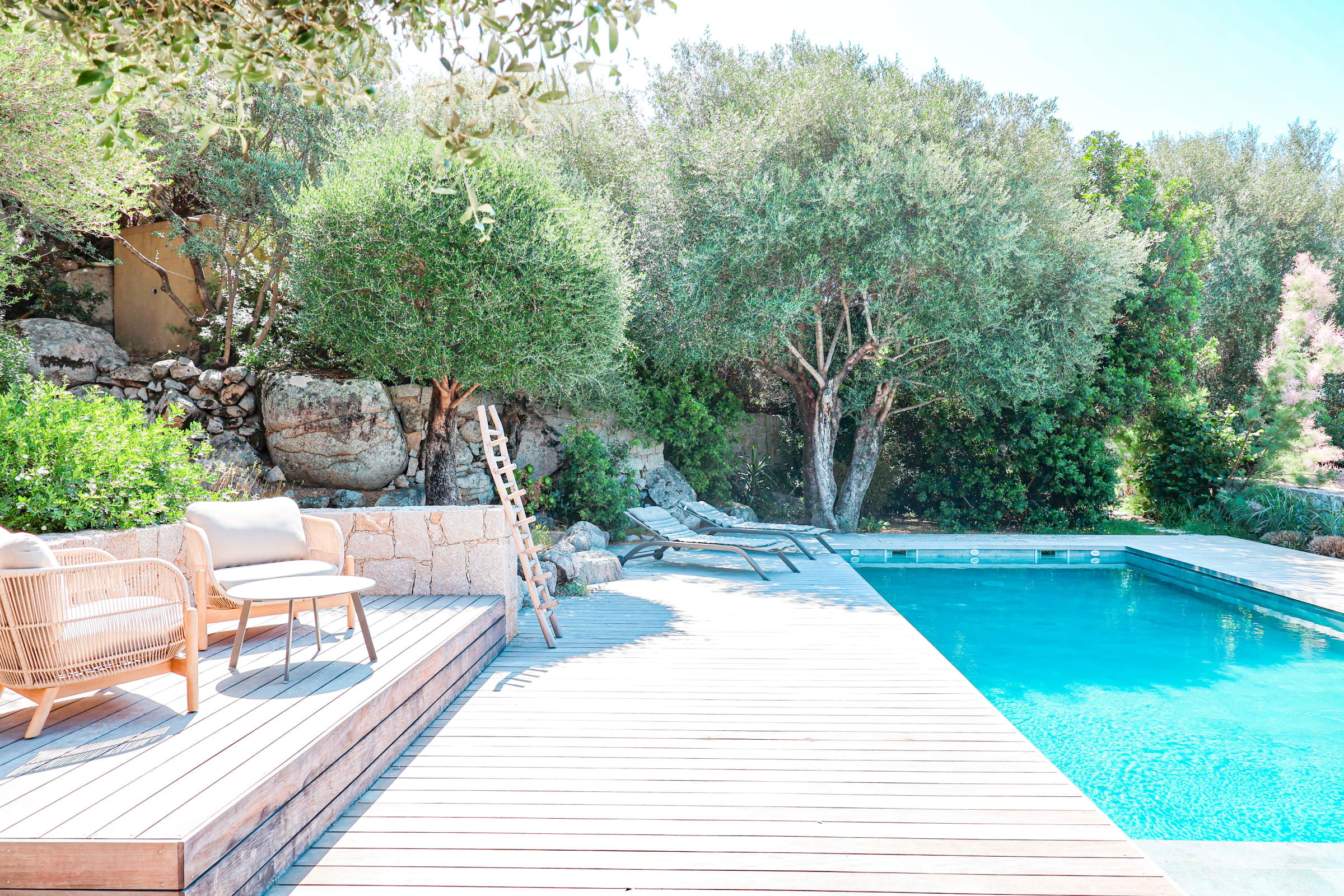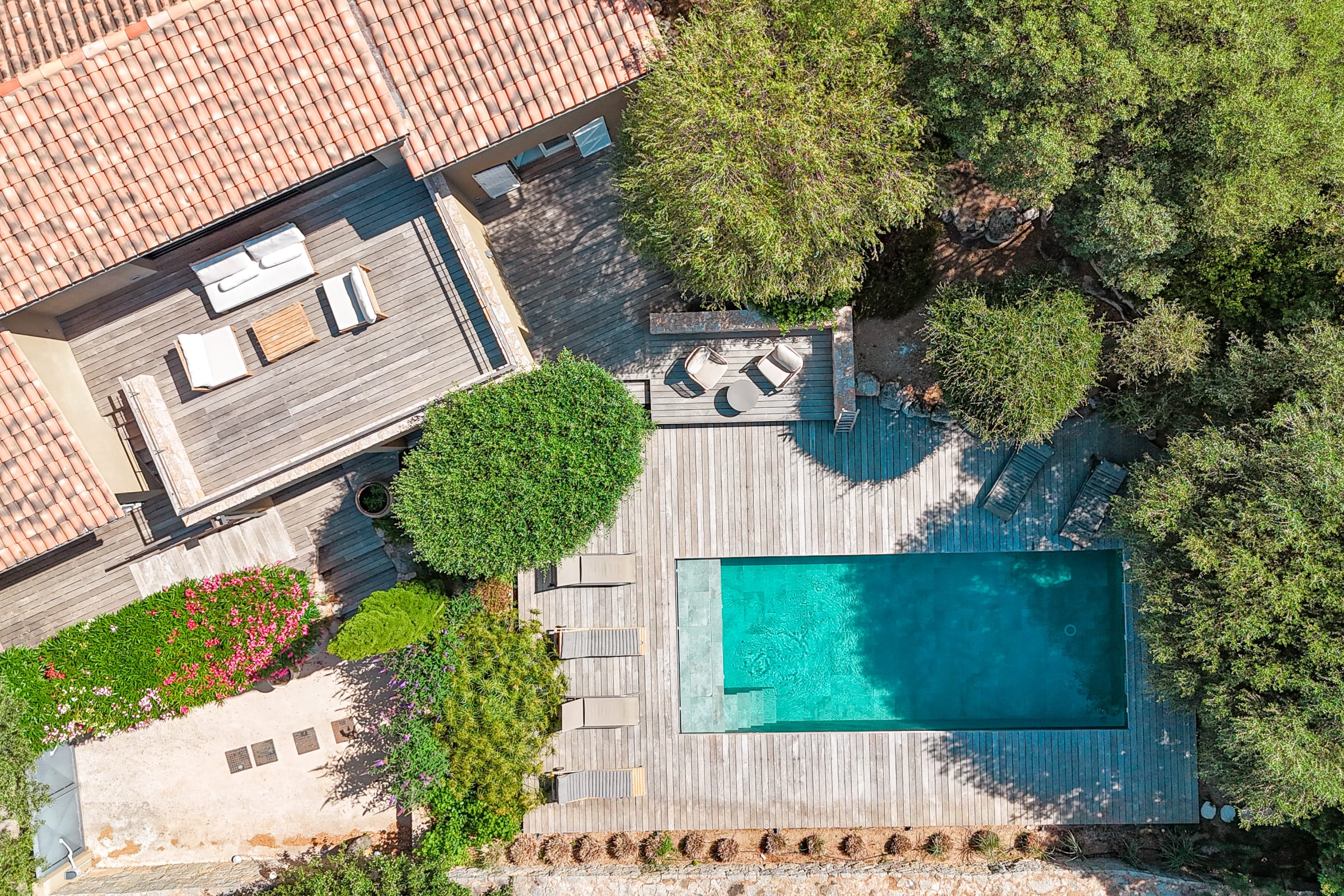 La villa possède un bel extérieur avec des terrasses en IPE sur différents niveaux, permettant de circuler simplement des espaces communs vers les chambres et la piscine.