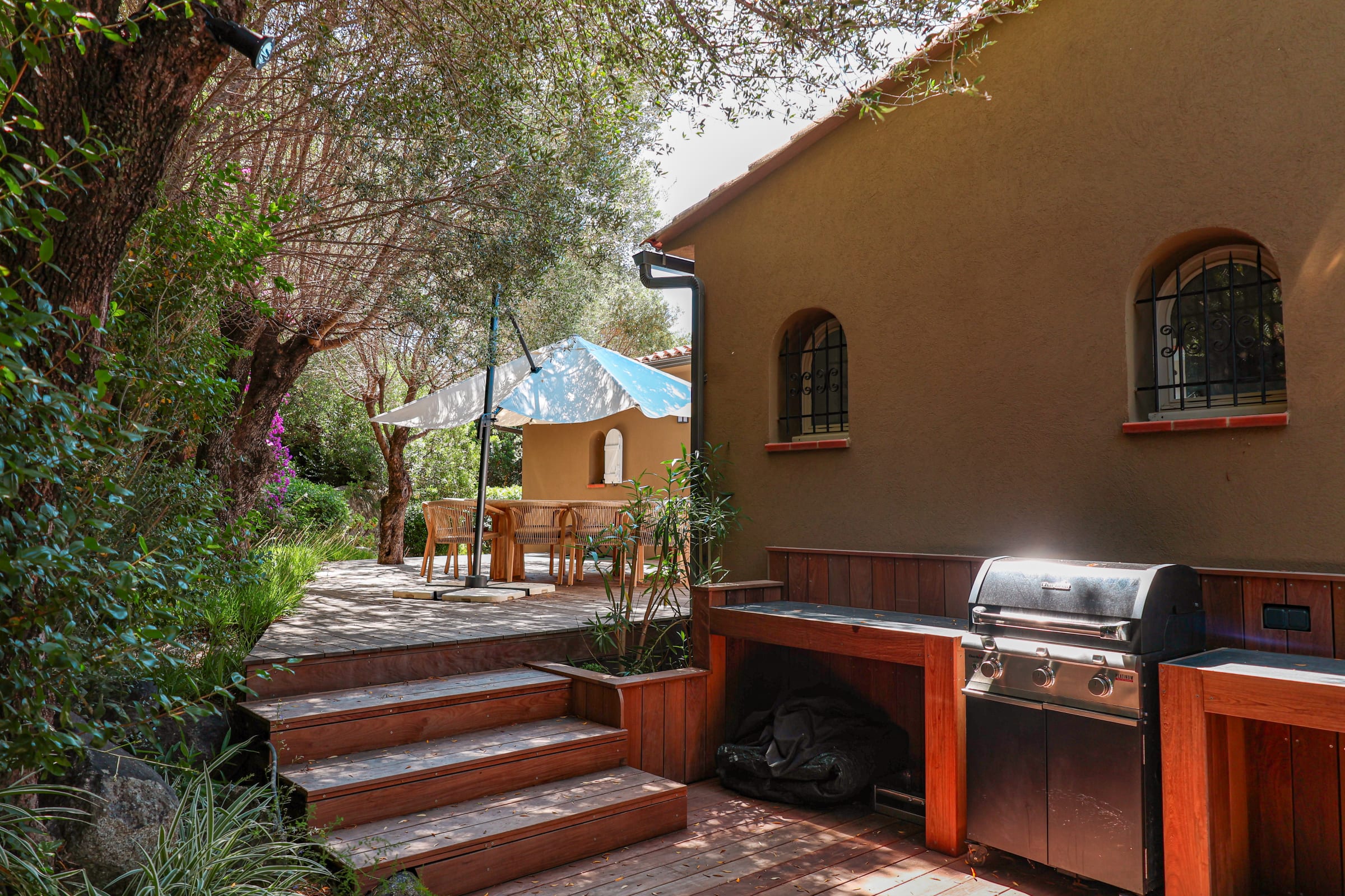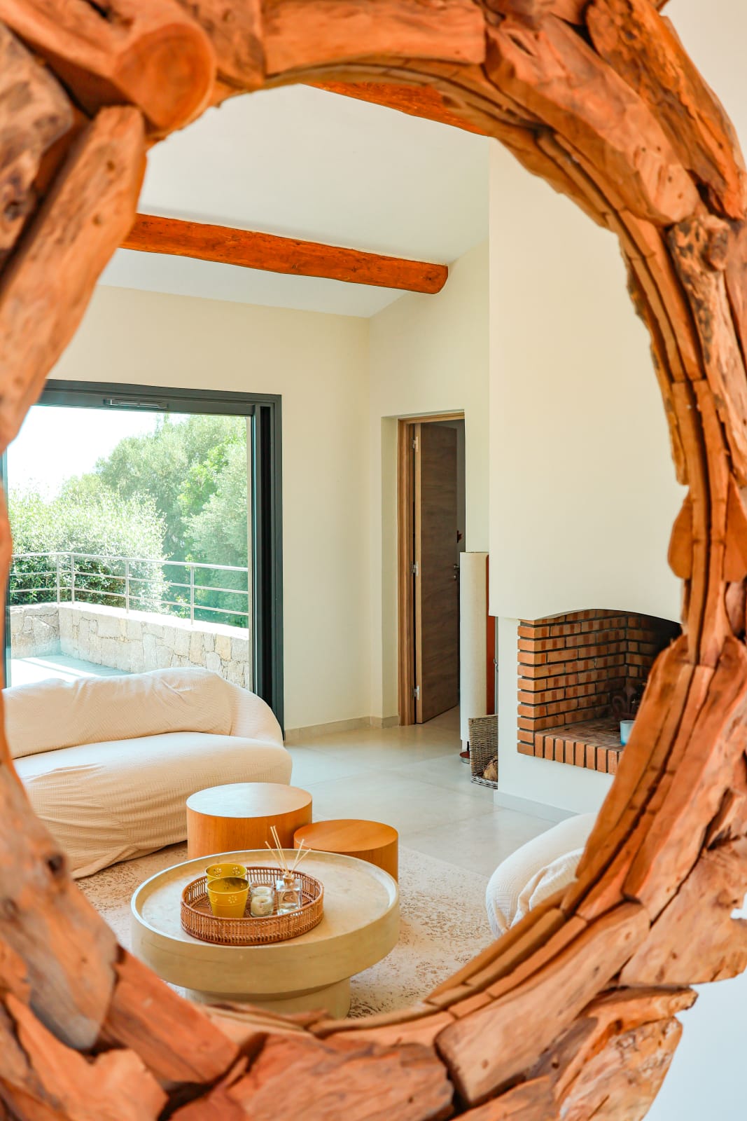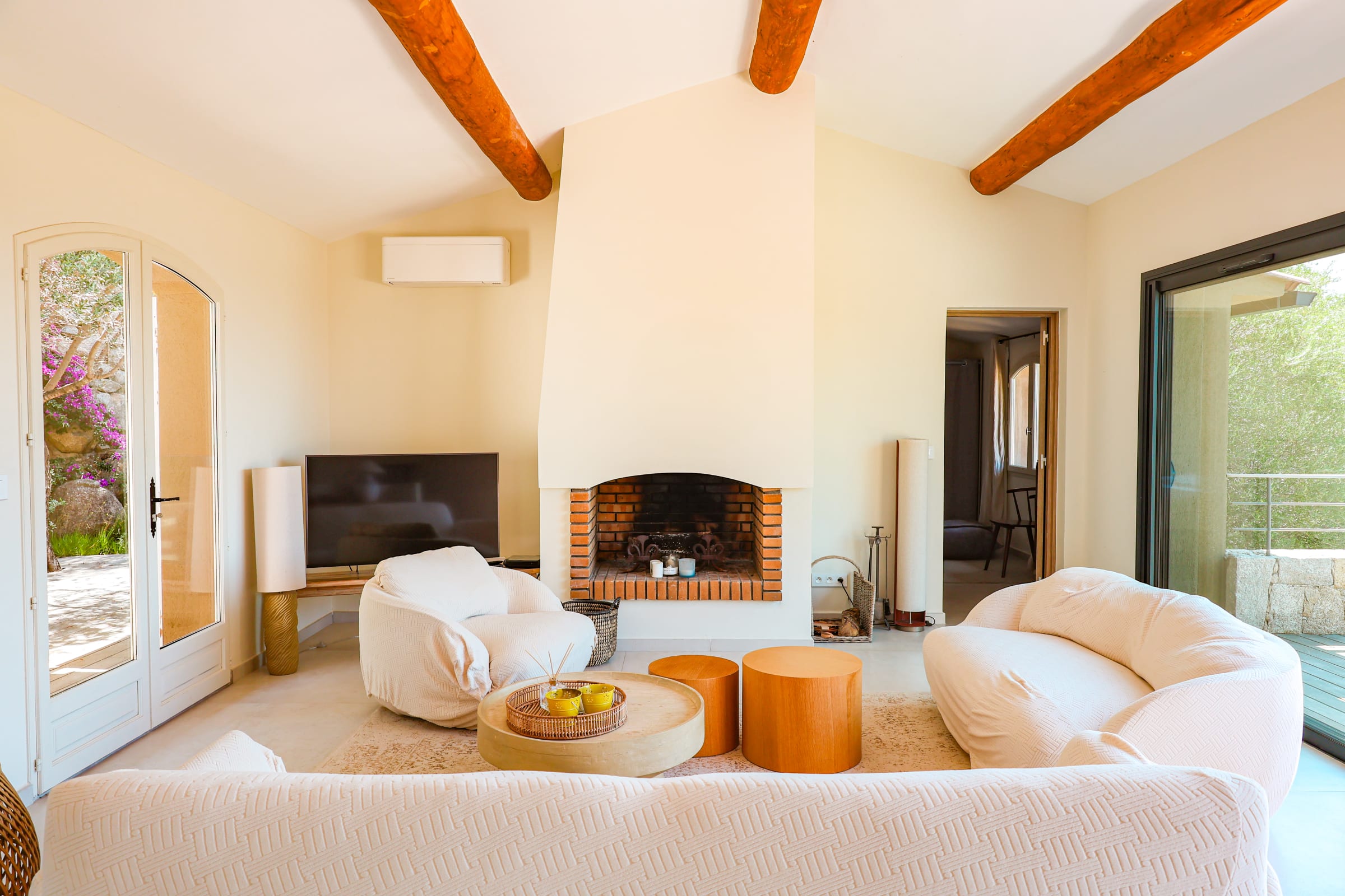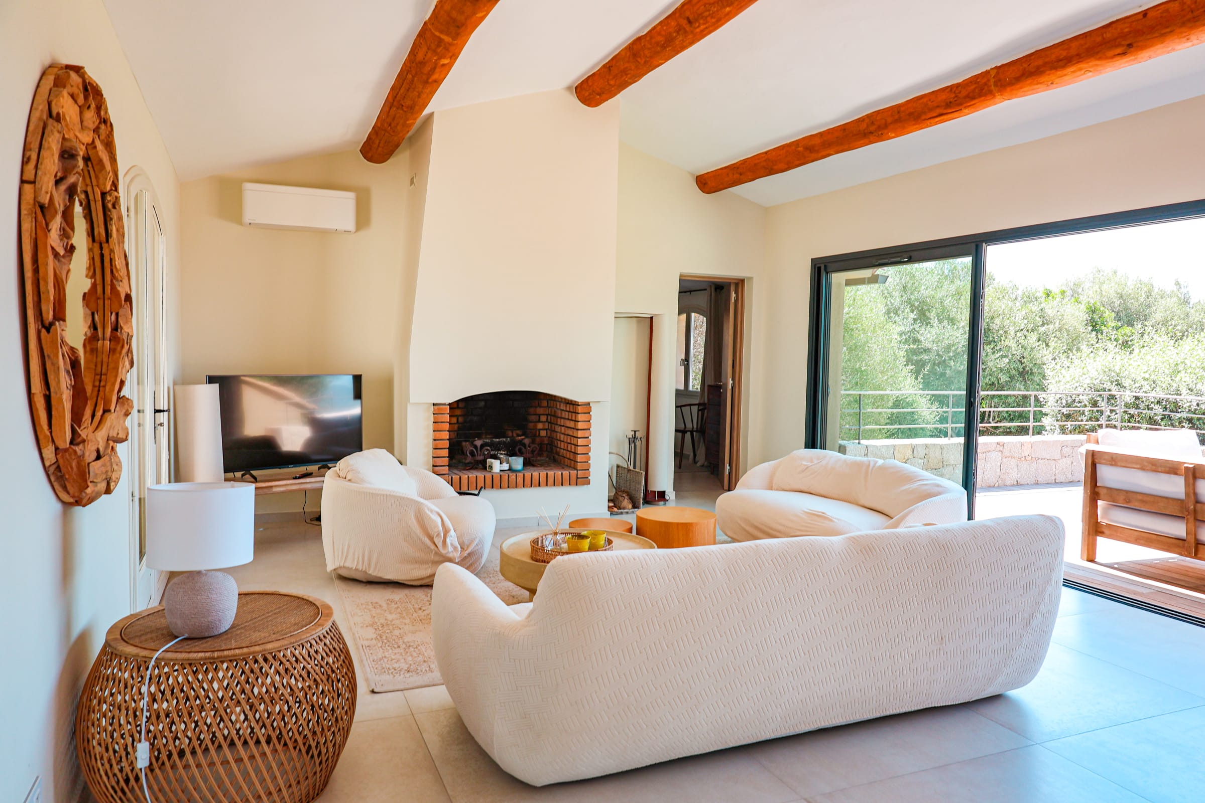 - Salon avec cheminée et grande baie vitrée donnant sur la terrasse. Belle vue mer sur toute la baie de San Ciprianu. Une seconde terrasse avec barbecue est accessible par le salon et la cuisine donnant la possibilité de déjeuner en extérieur tout en se protégeant du soleil et des grandes chaleurs de l’été.