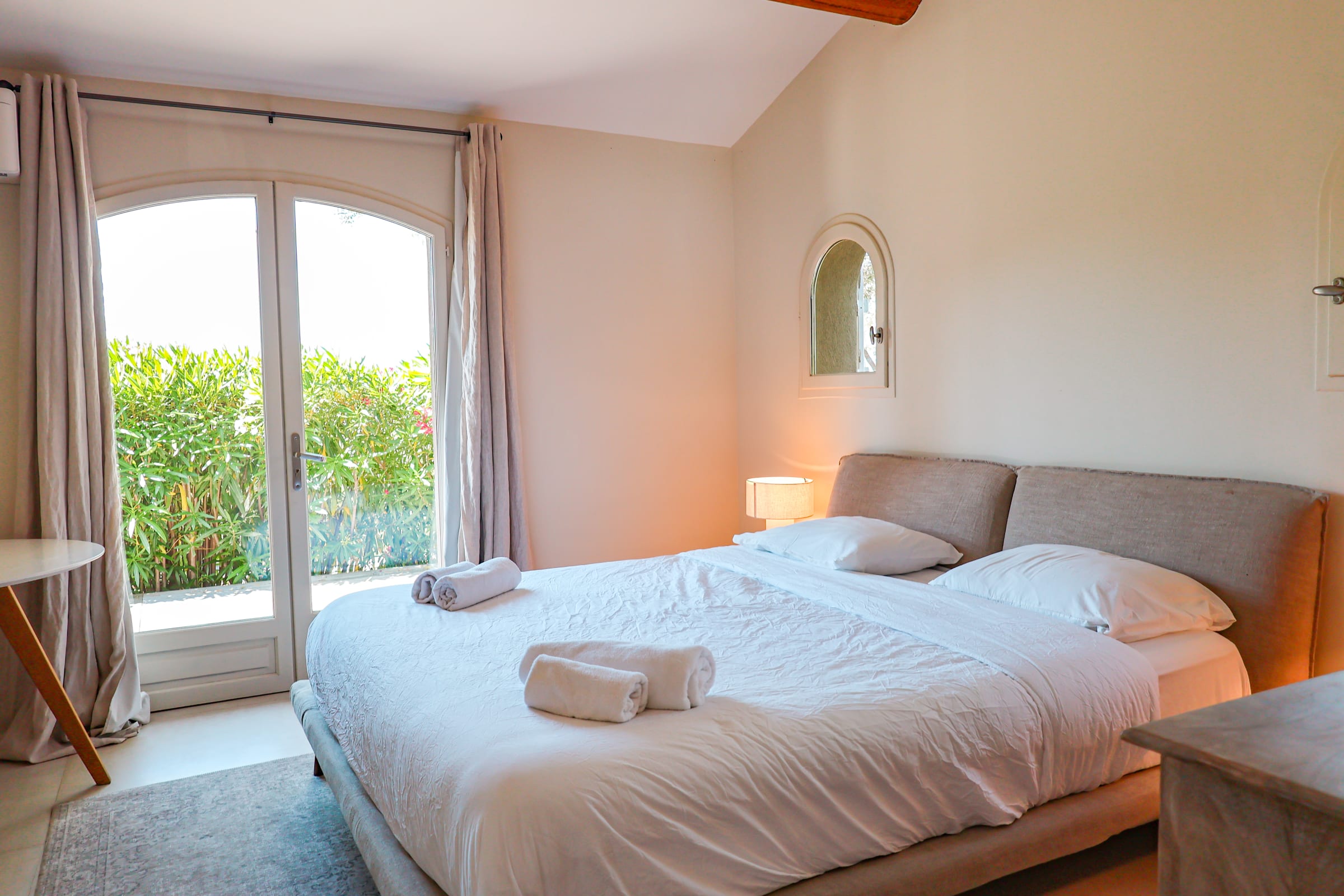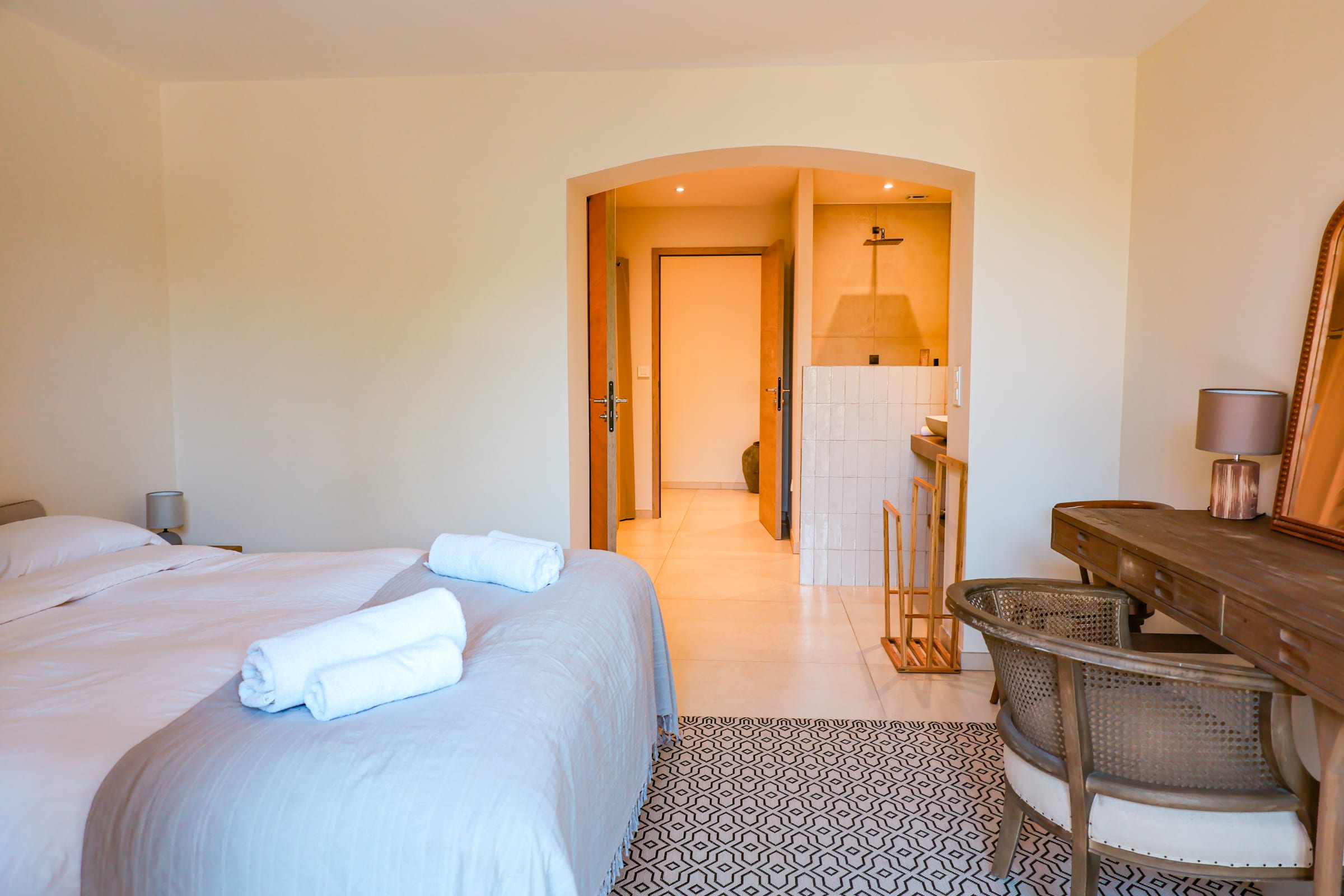 - Chambre 3 : Lit Queen Size (160*200) avec salle de douche, WC et dressing. Accès piscine et terrasse.